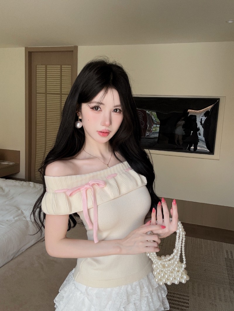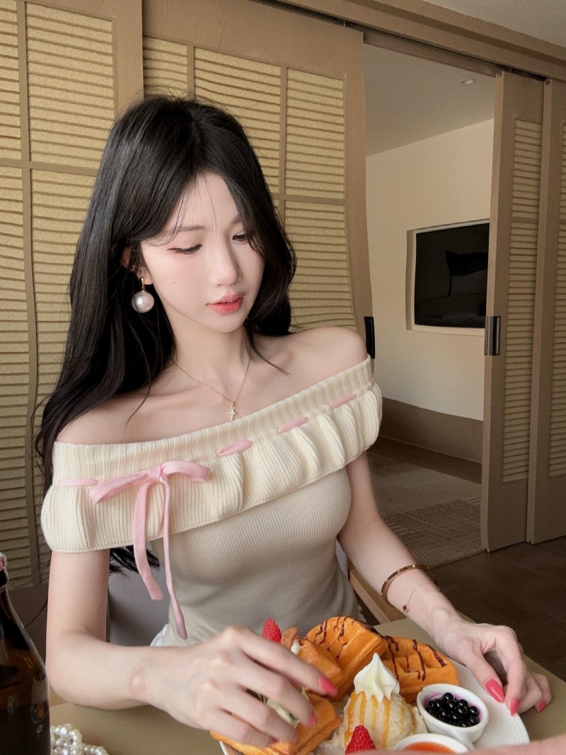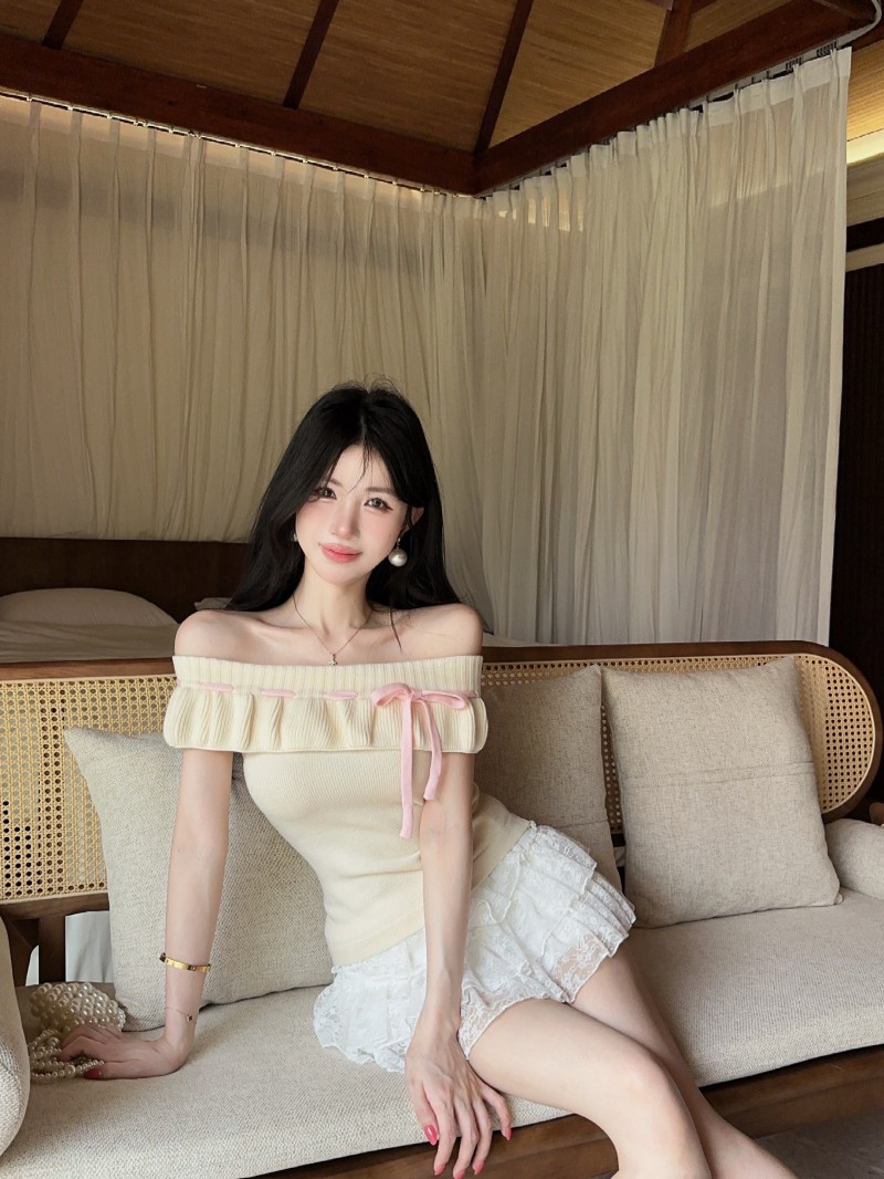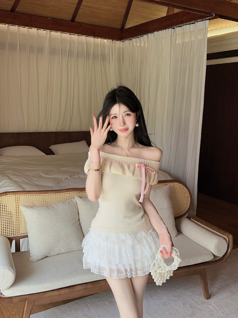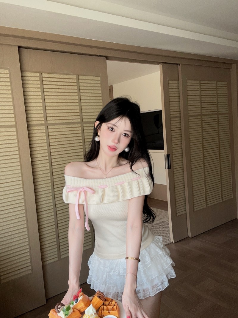 실사 정가 감소되지 않음 부드러운 찹쌀 오프숄더 둘 착용 프릴 맨위 레이 실크 허리 수축 미니 스커트
