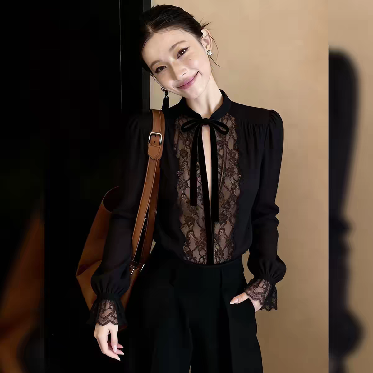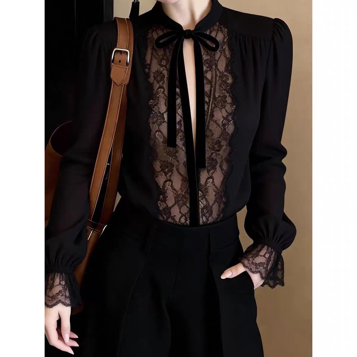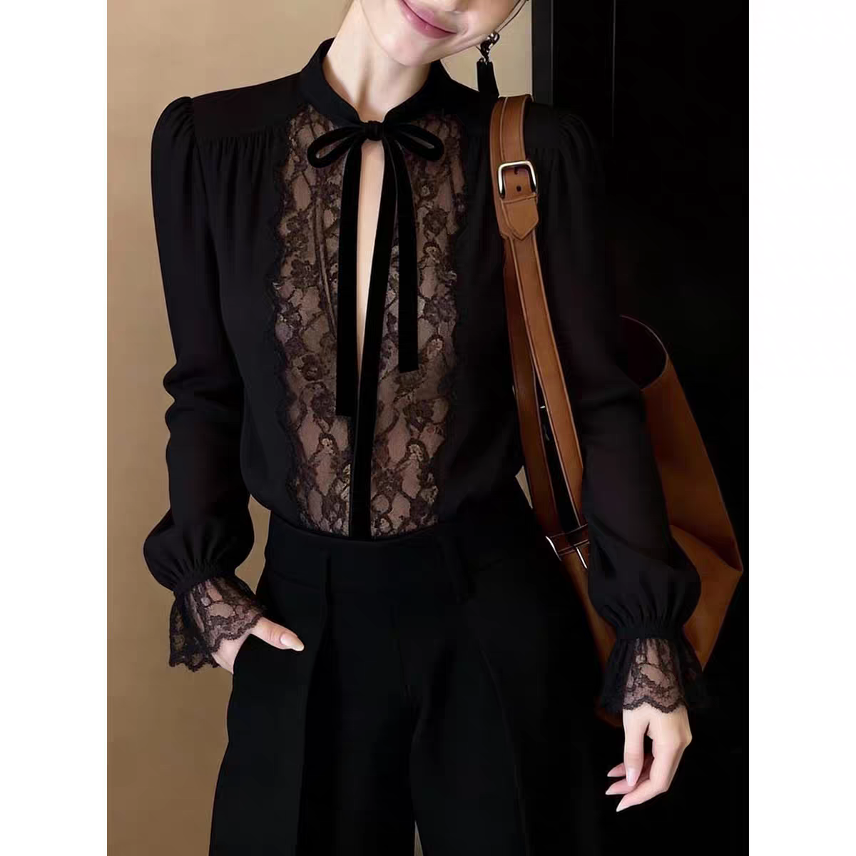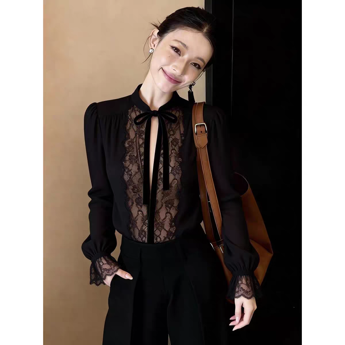 파란색 레이스 측면 V넥 레이스업 라미 긴팔 여성 셔츠 여름 새로운 고급 센스 다용도 얇은 스타일 자외선 차단 셔츠