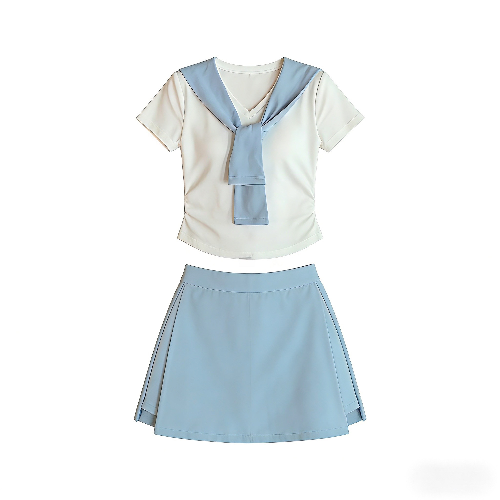 배색 숄 칼라 반팔 티셔츠 불규칙 반신 미니 스커트 달콤한 자매 연령 감소 캐주얼 투피스 세트