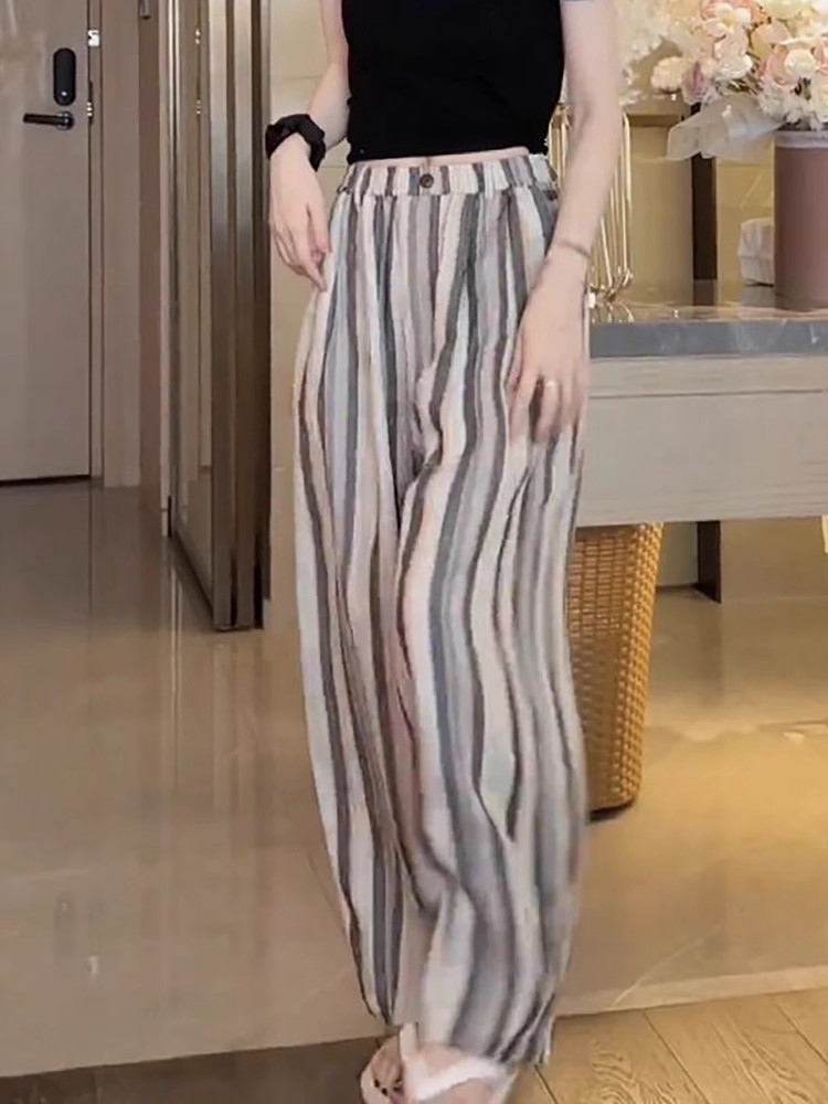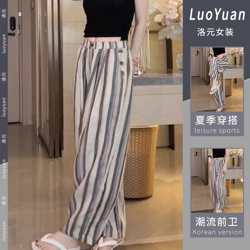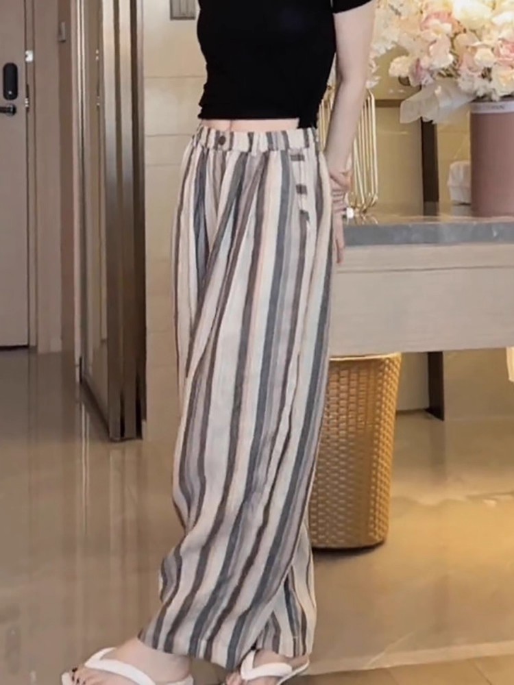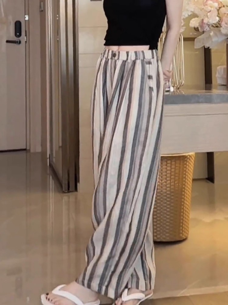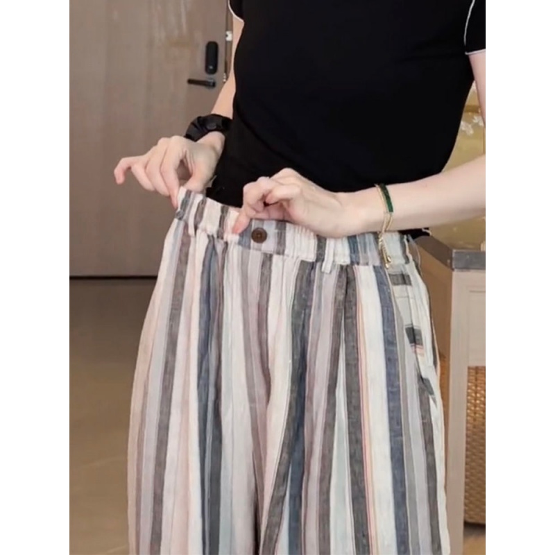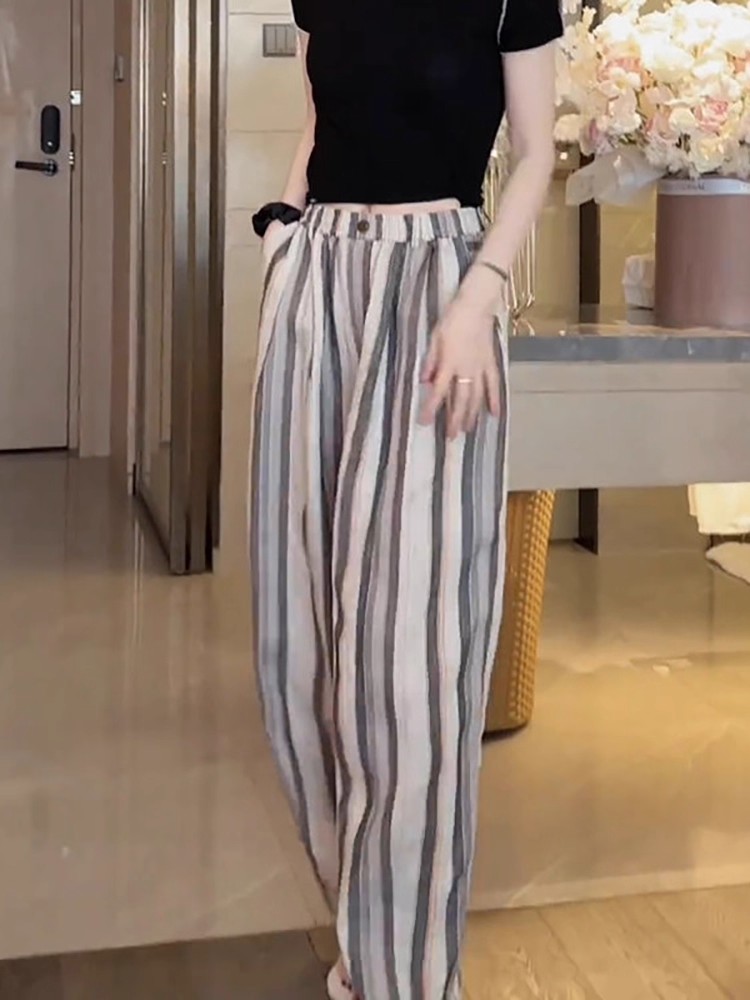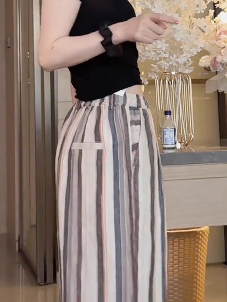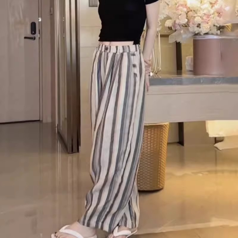 사면 신축 있음 주머니 여름 얇은 스타일 바지 2025 새로운 폭발 작은 키 루즈핏 스트라이프 넓은 다리 길이 바지