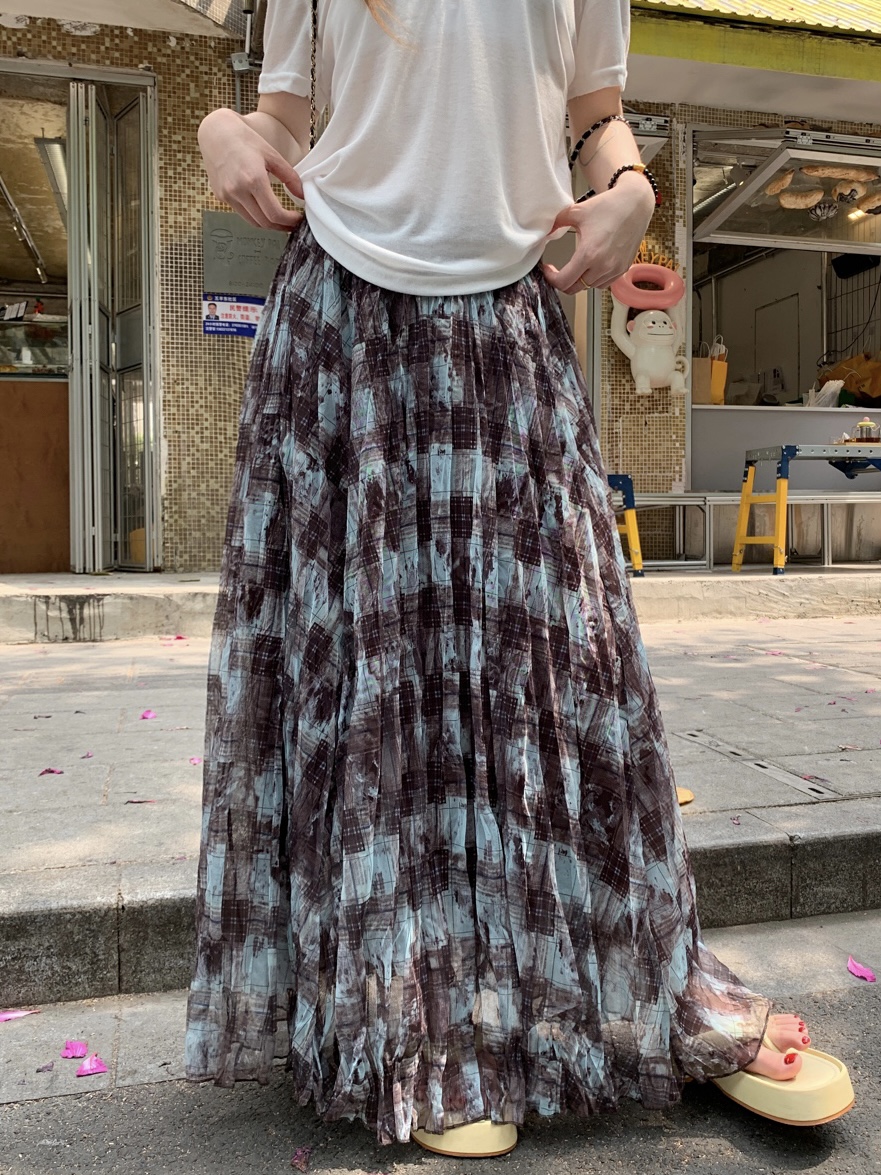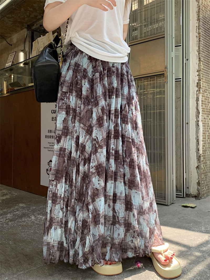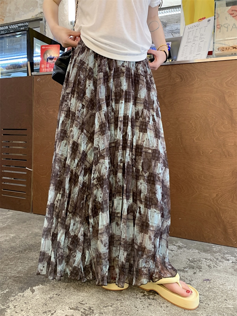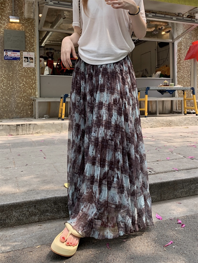 실사 정가 새로운 한국 스타일 루즈핏 하이웨이스트 캐주얼 슬림해 보이는 체크무늬 배색 플리츠 반신 롱 스커트