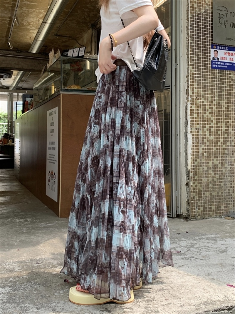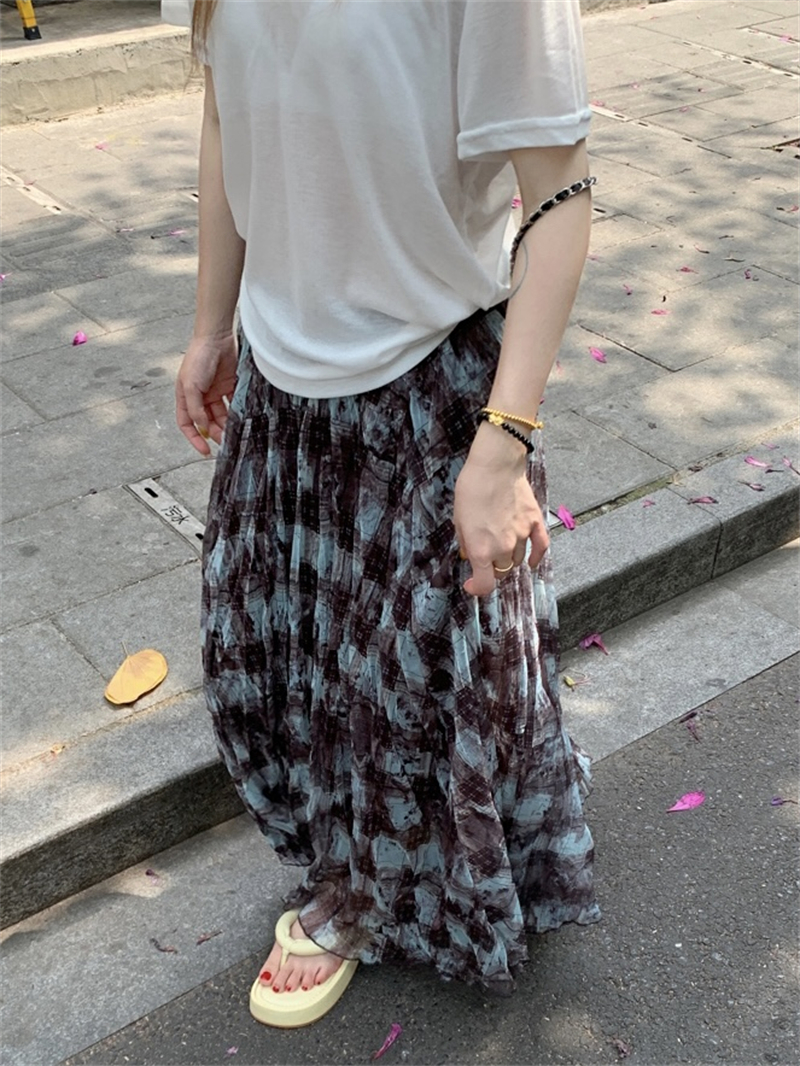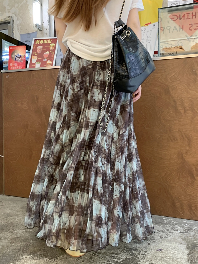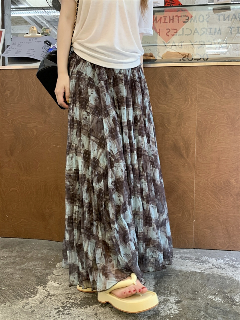 실사 정가 새로운 한국 스타일 루즈핏 하이웨이스트 캐주얼 슬림해 보이는 체크무늬 배색 플리츠 반신 롱 스커트