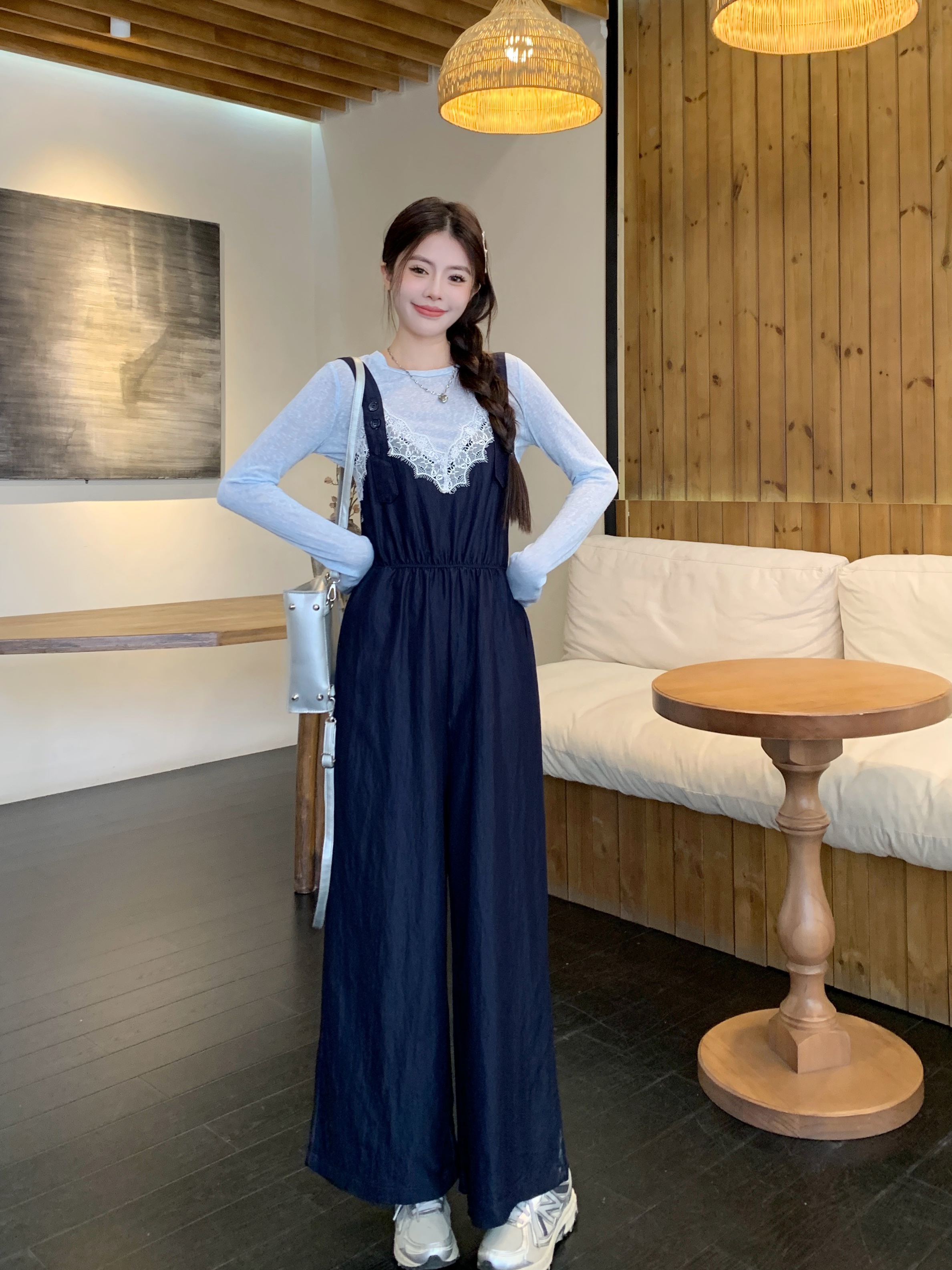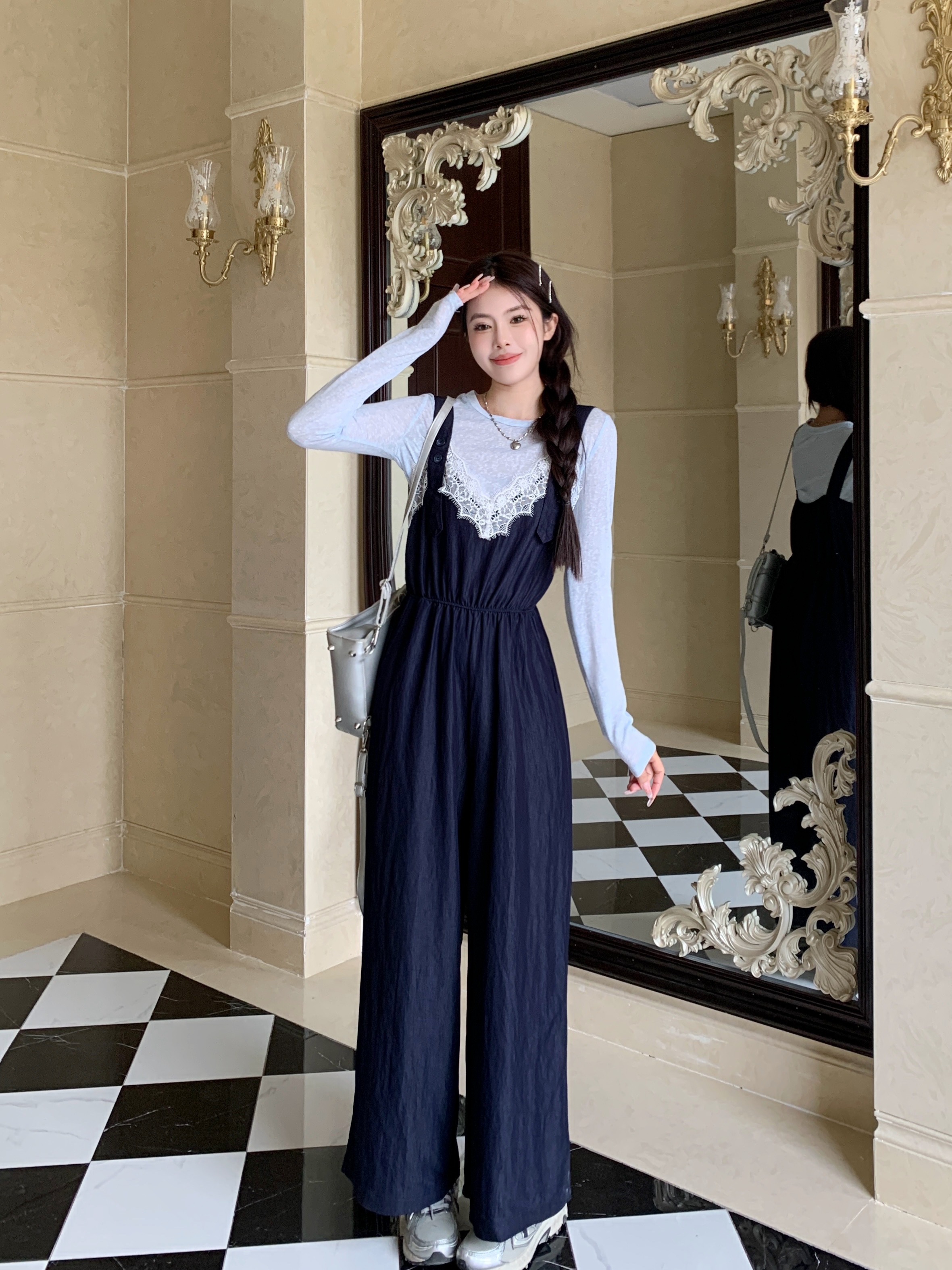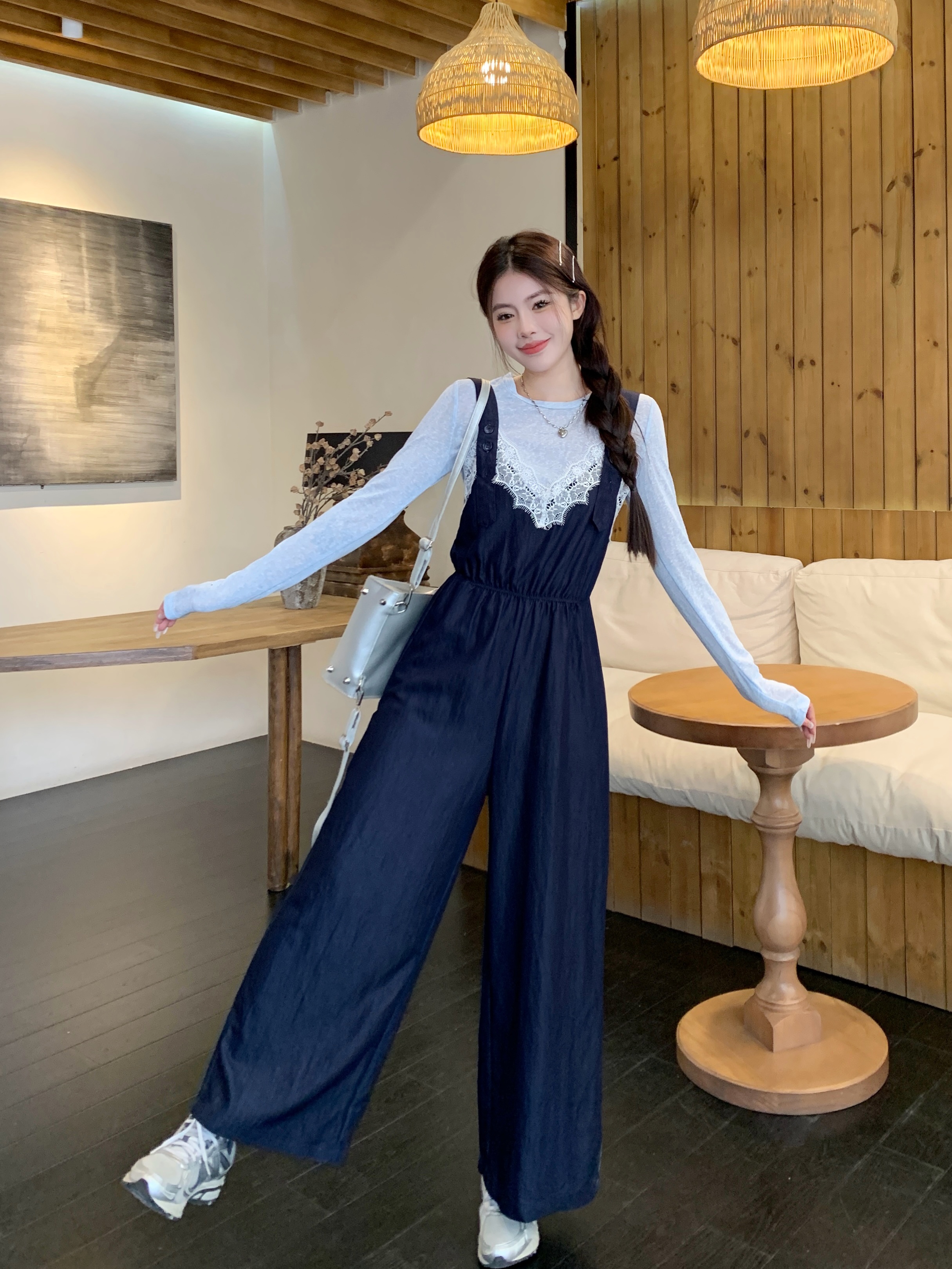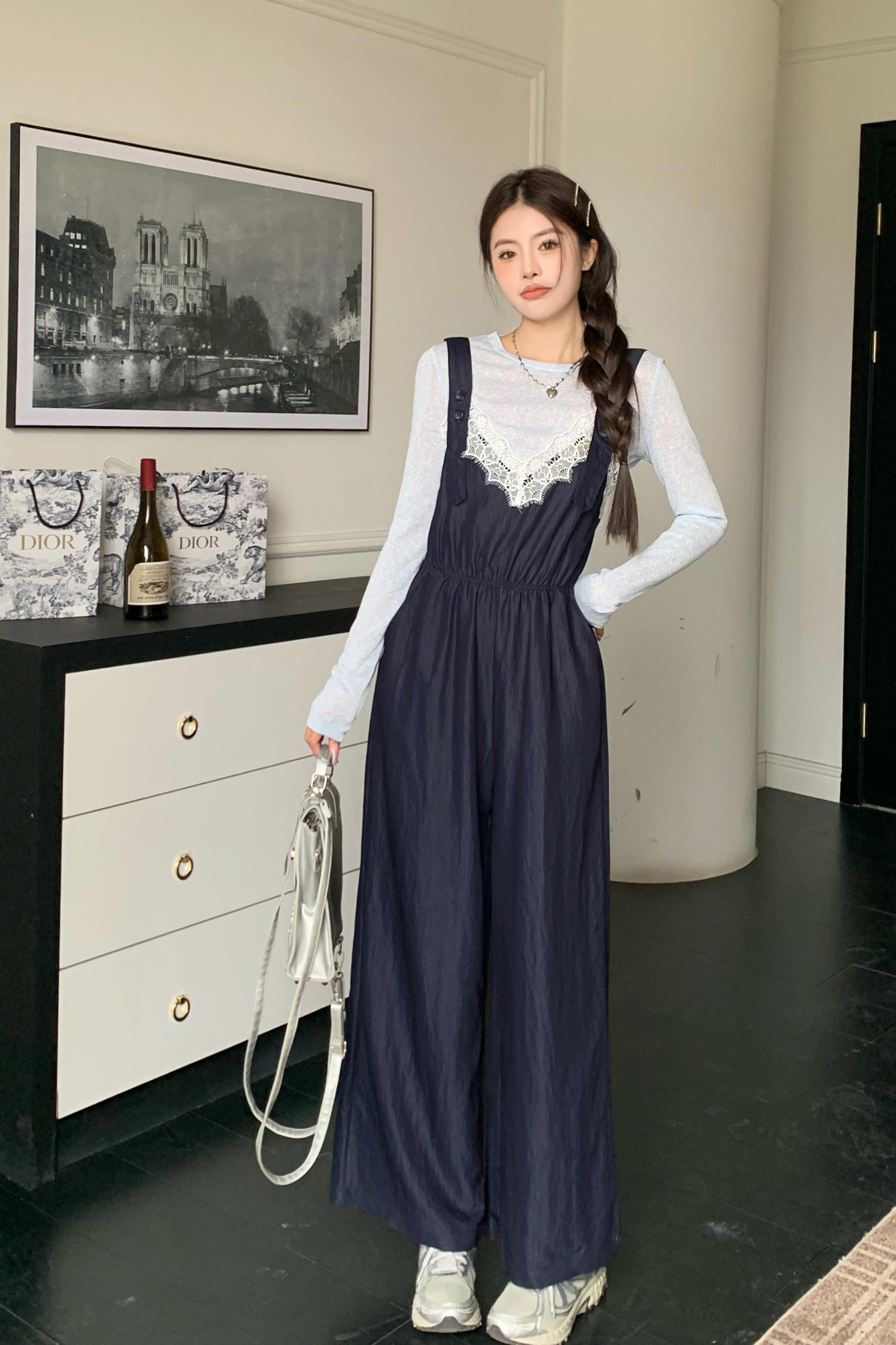 실사 빅 사이즈 레이스 조각 점프 슈트 새로운 스택 착용 멜빵 하이웨이스트 넓은 다리 슬림해 보이는 캐주얼 단추 긴 바지
