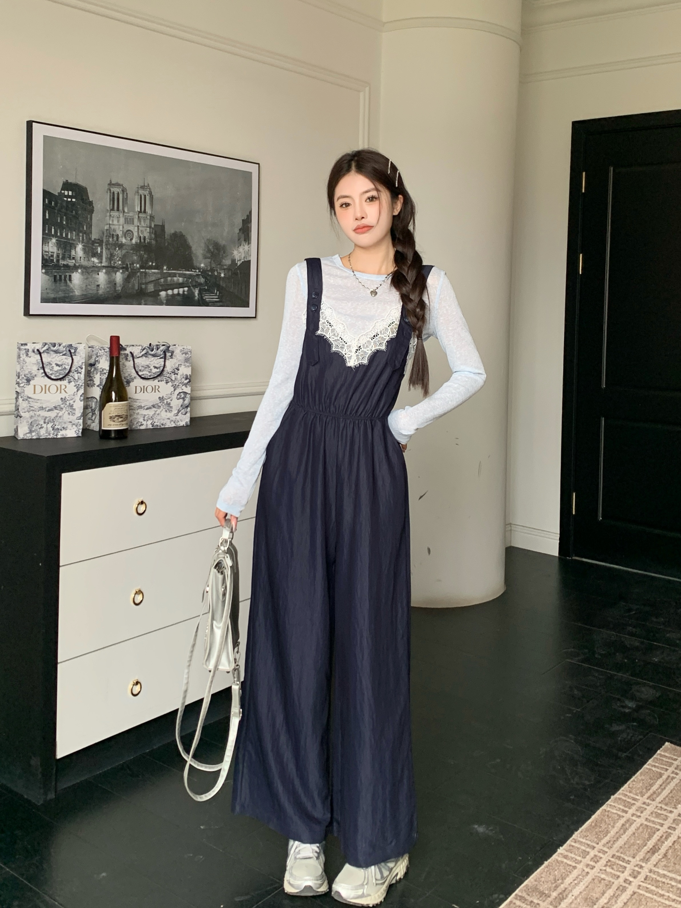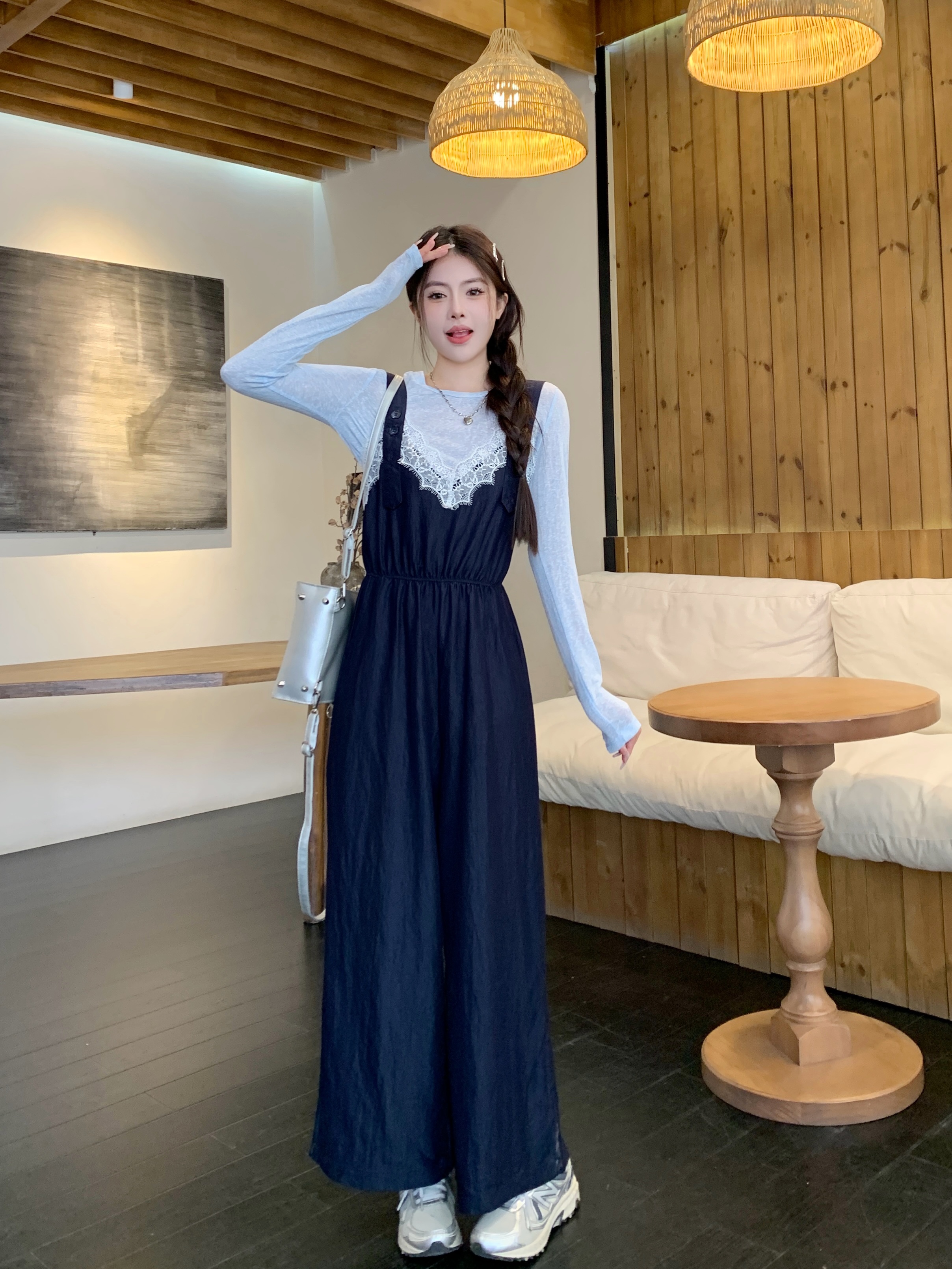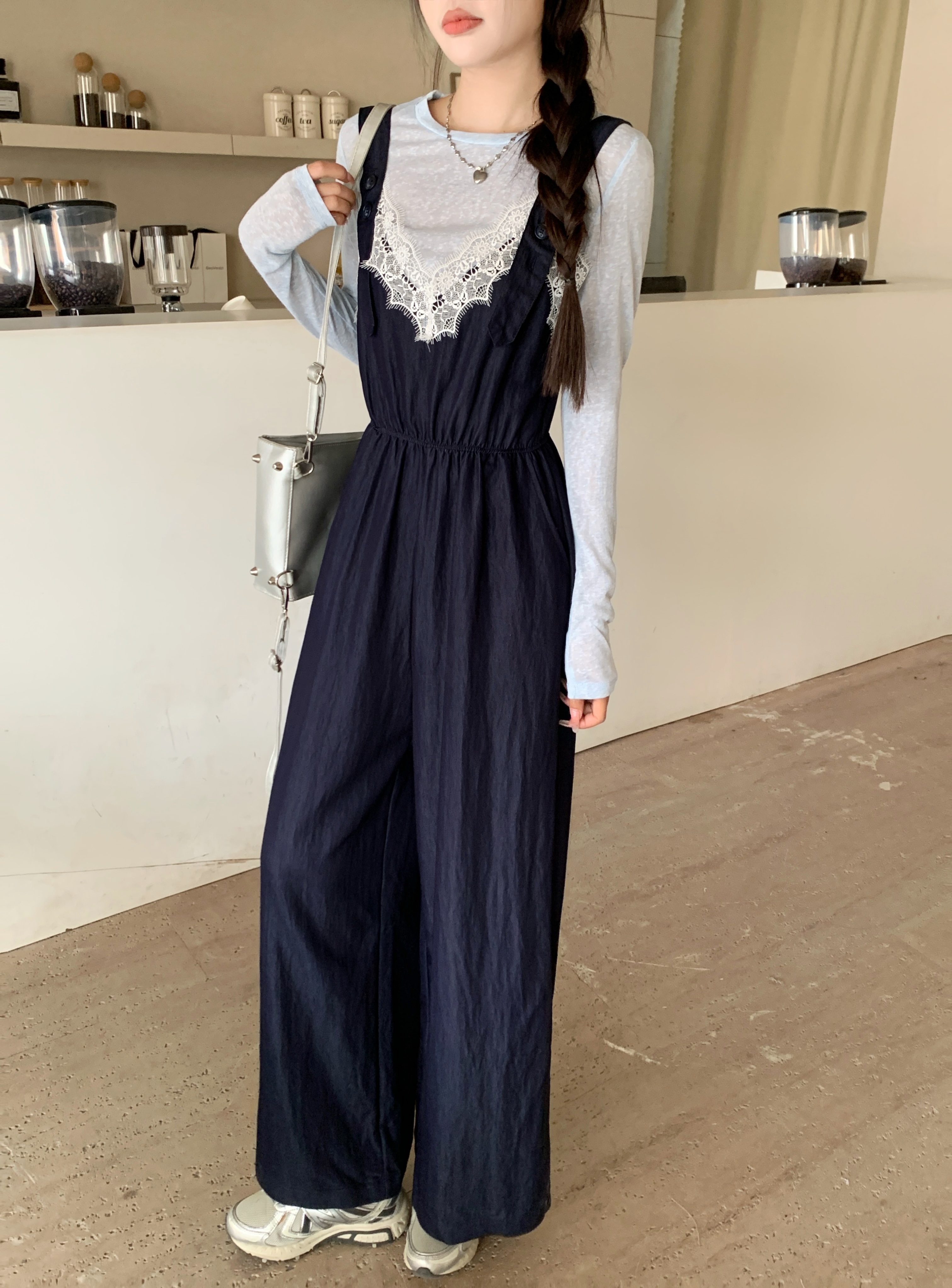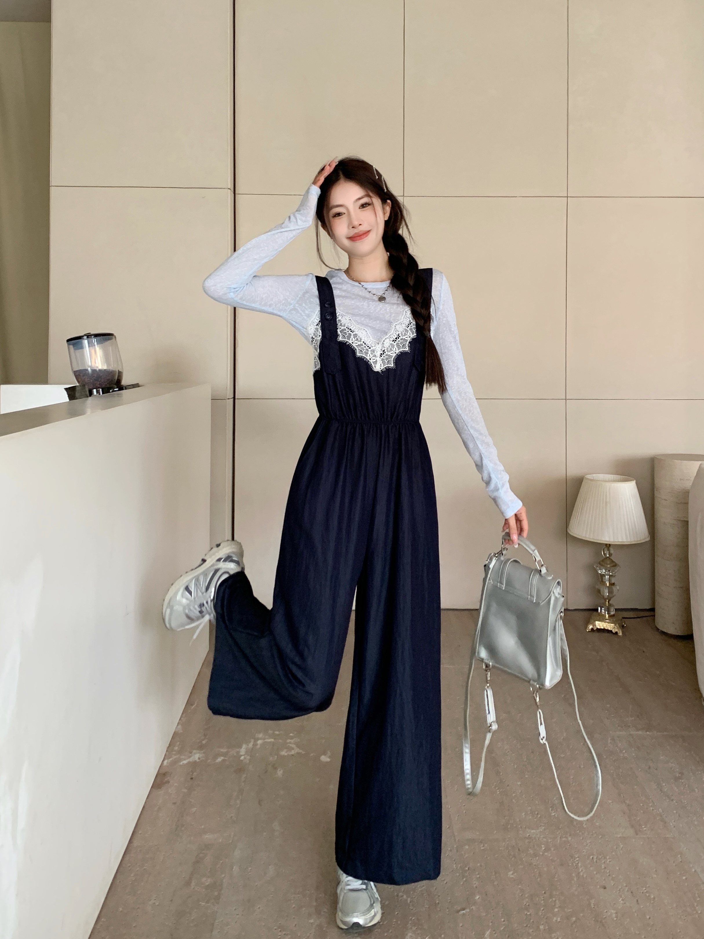 실사 빅 사이즈 레이스 조각 점프 슈트 새로운 스택 착용 멜빵 하이웨이스트 넓은 다리 슬림해 보이는 캐주얼 단추 긴 바지