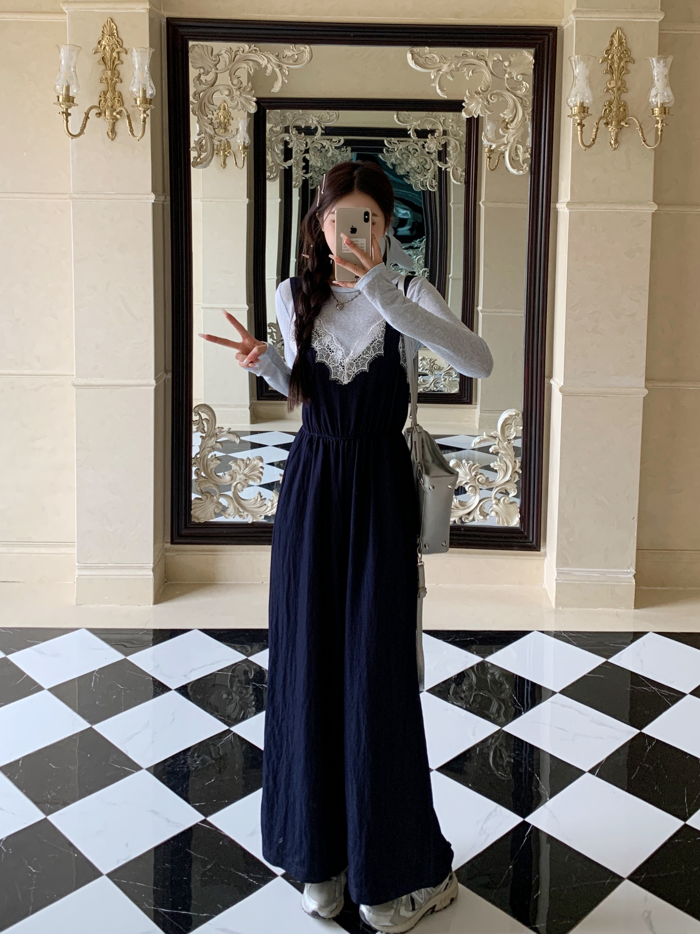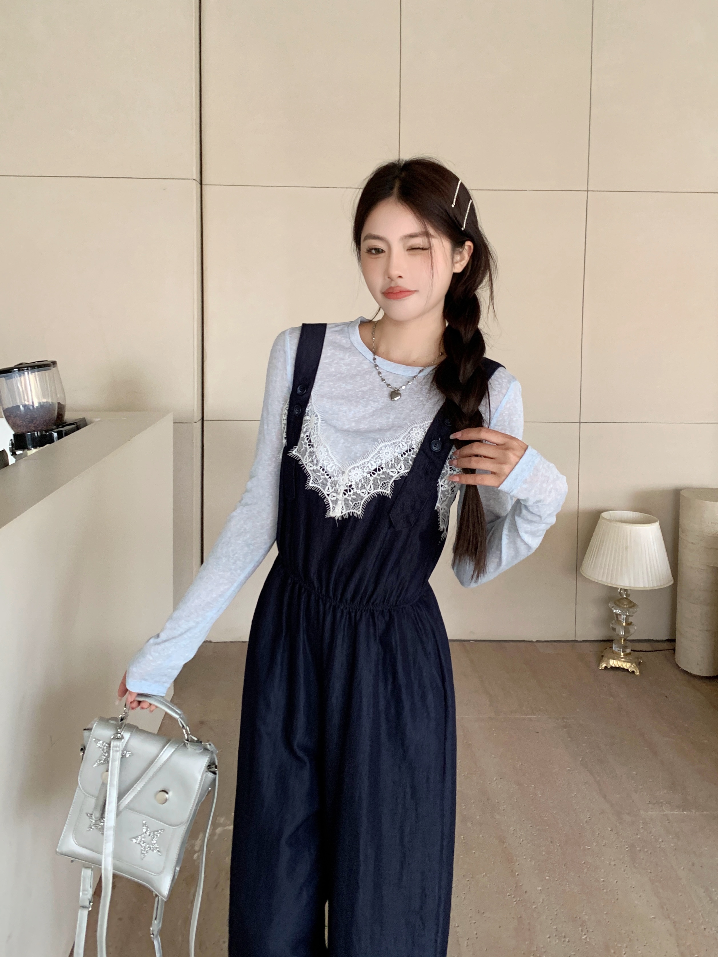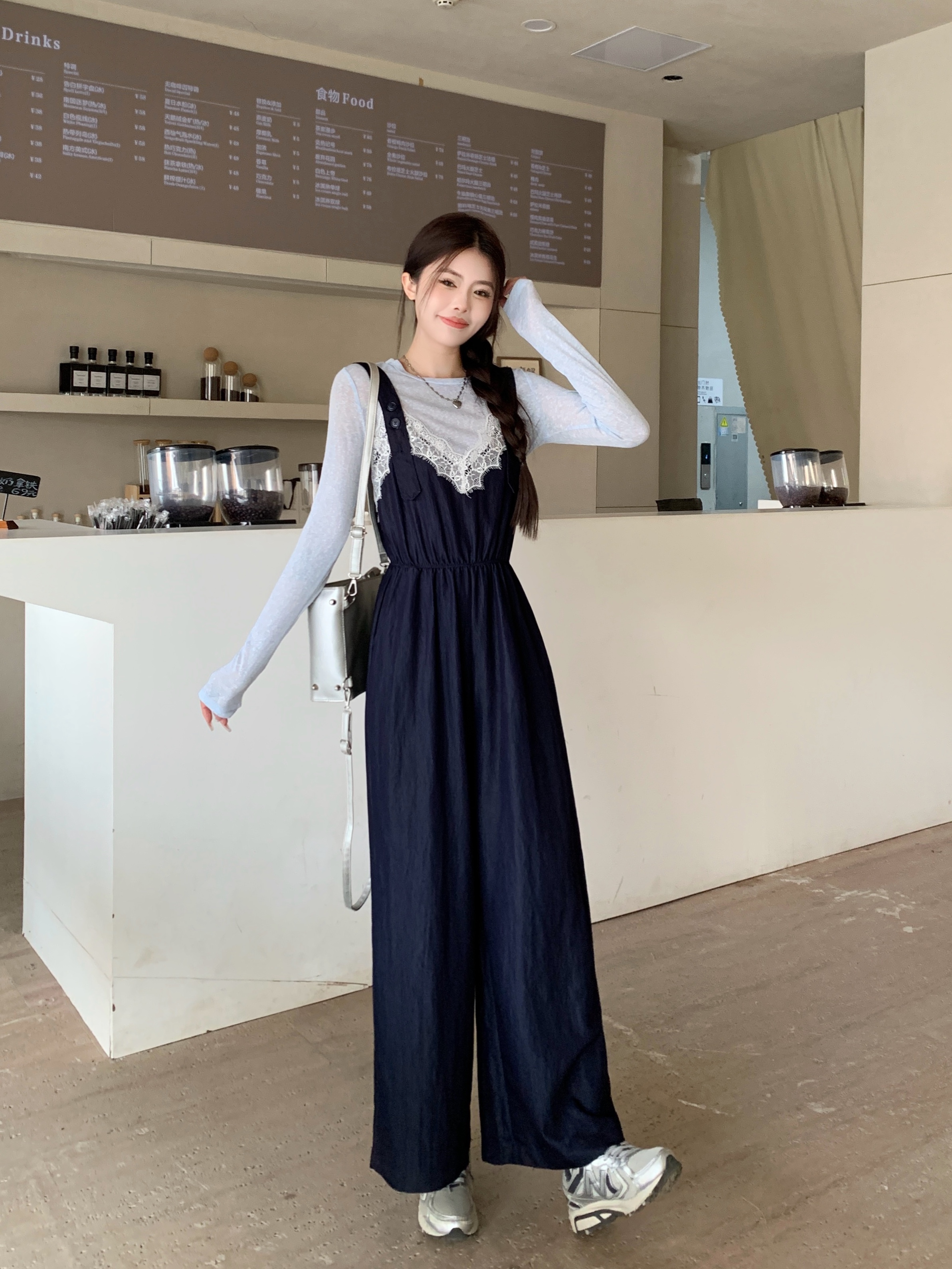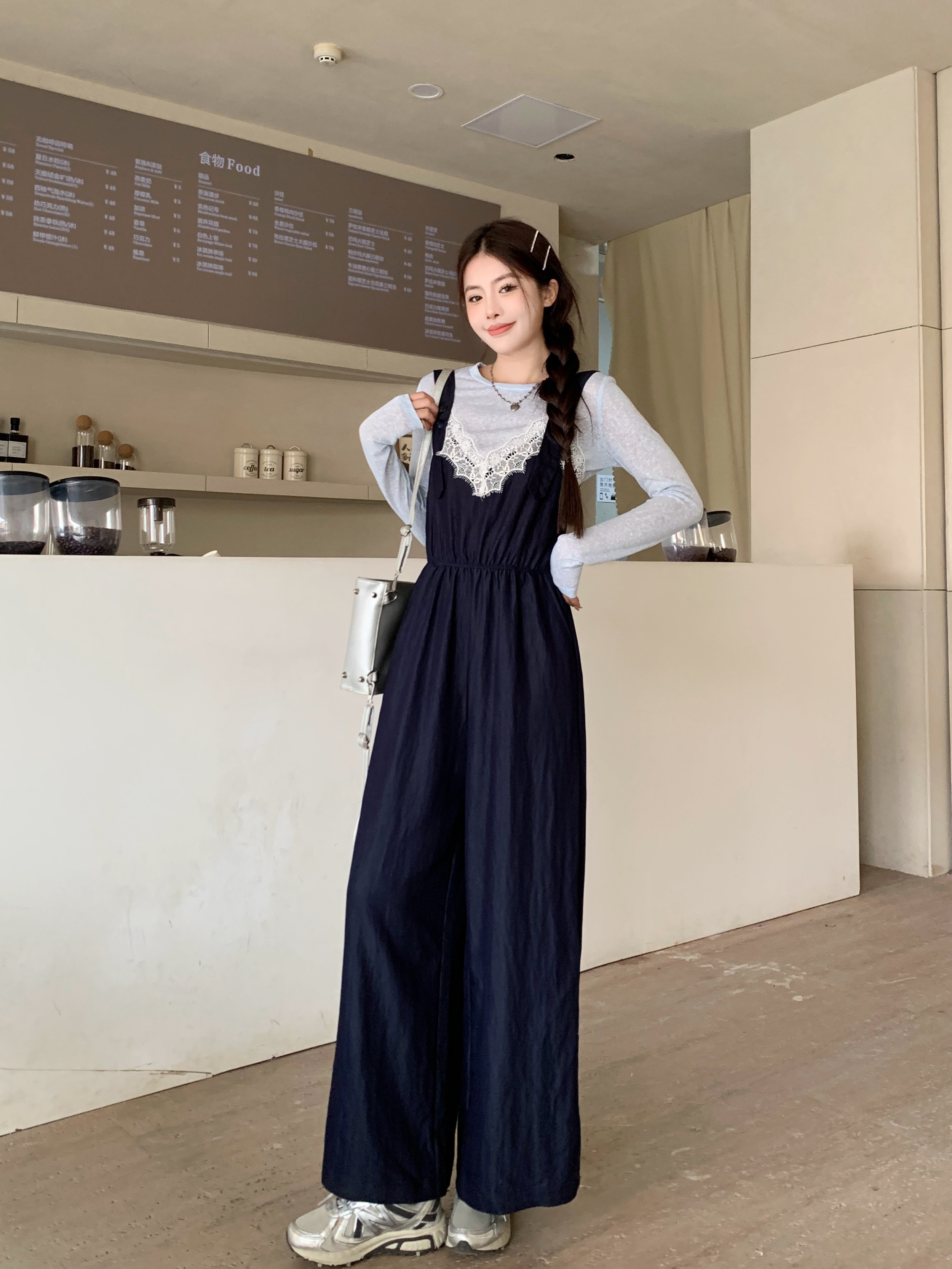 실사 빅 사이즈 레이스 조각 점프 슈트 새로운 스택 착용 멜빵 하이웨이스트 넓은 다리 슬림해 보이는 캐주얼 단추 긴 바지