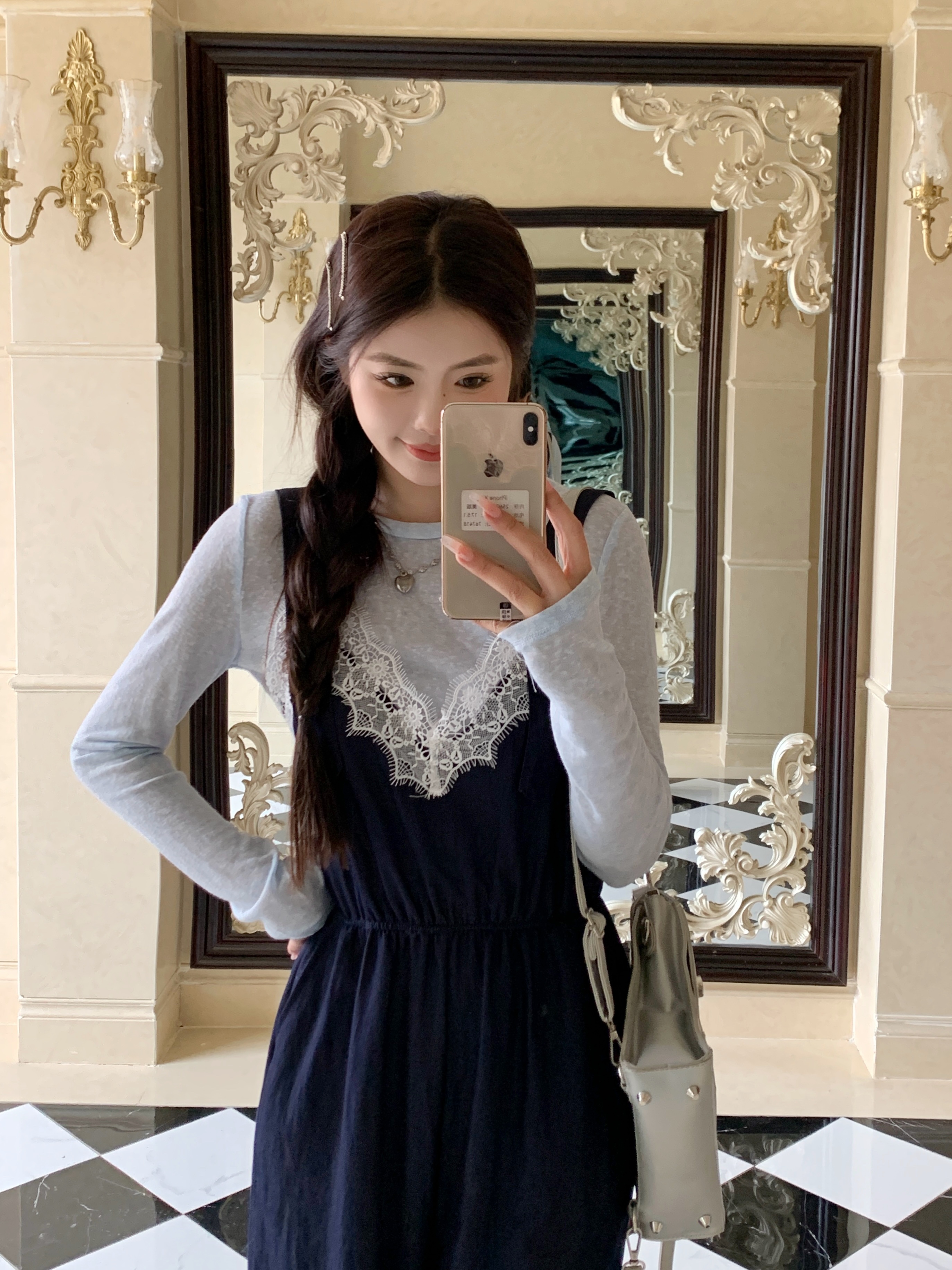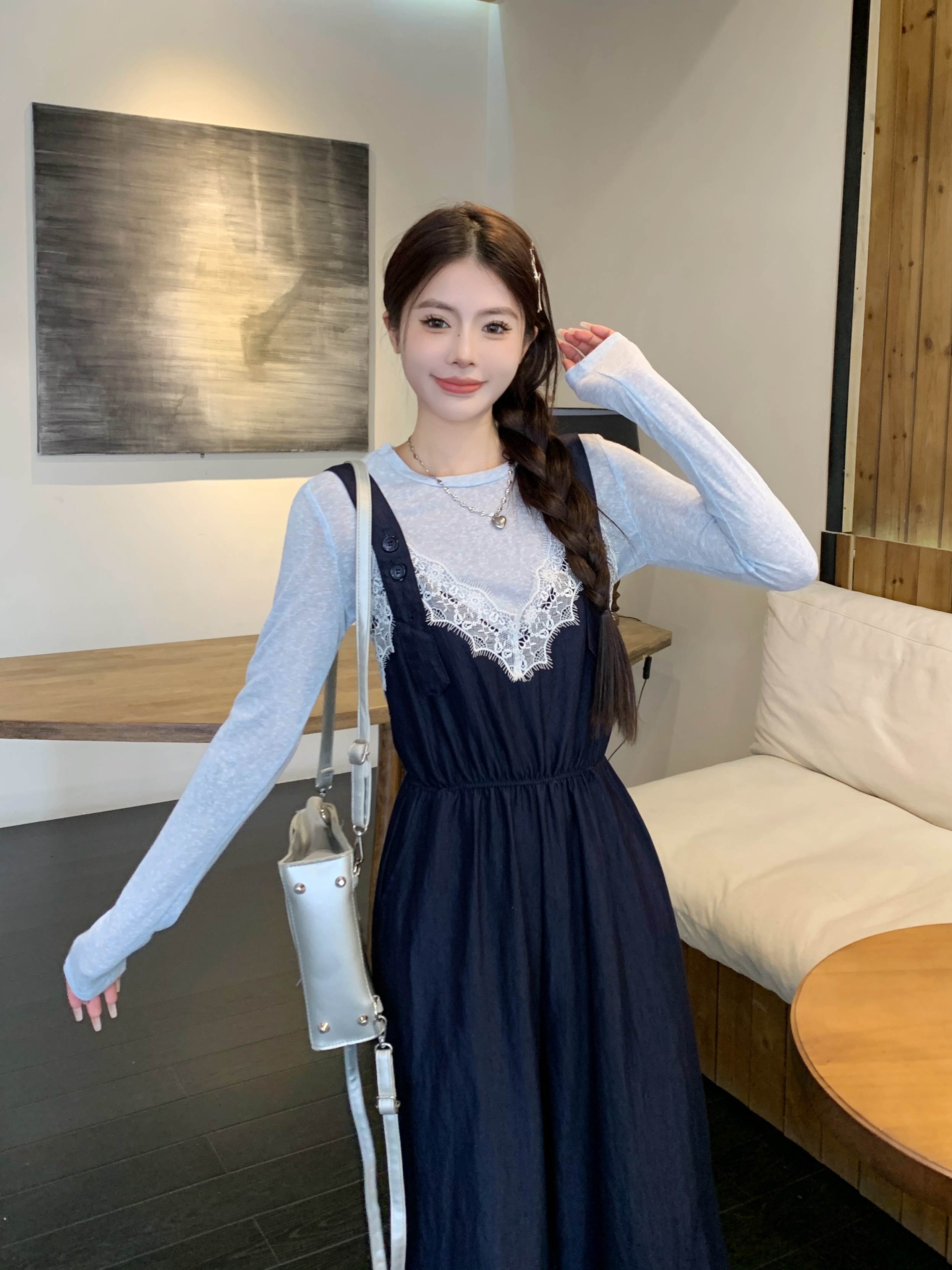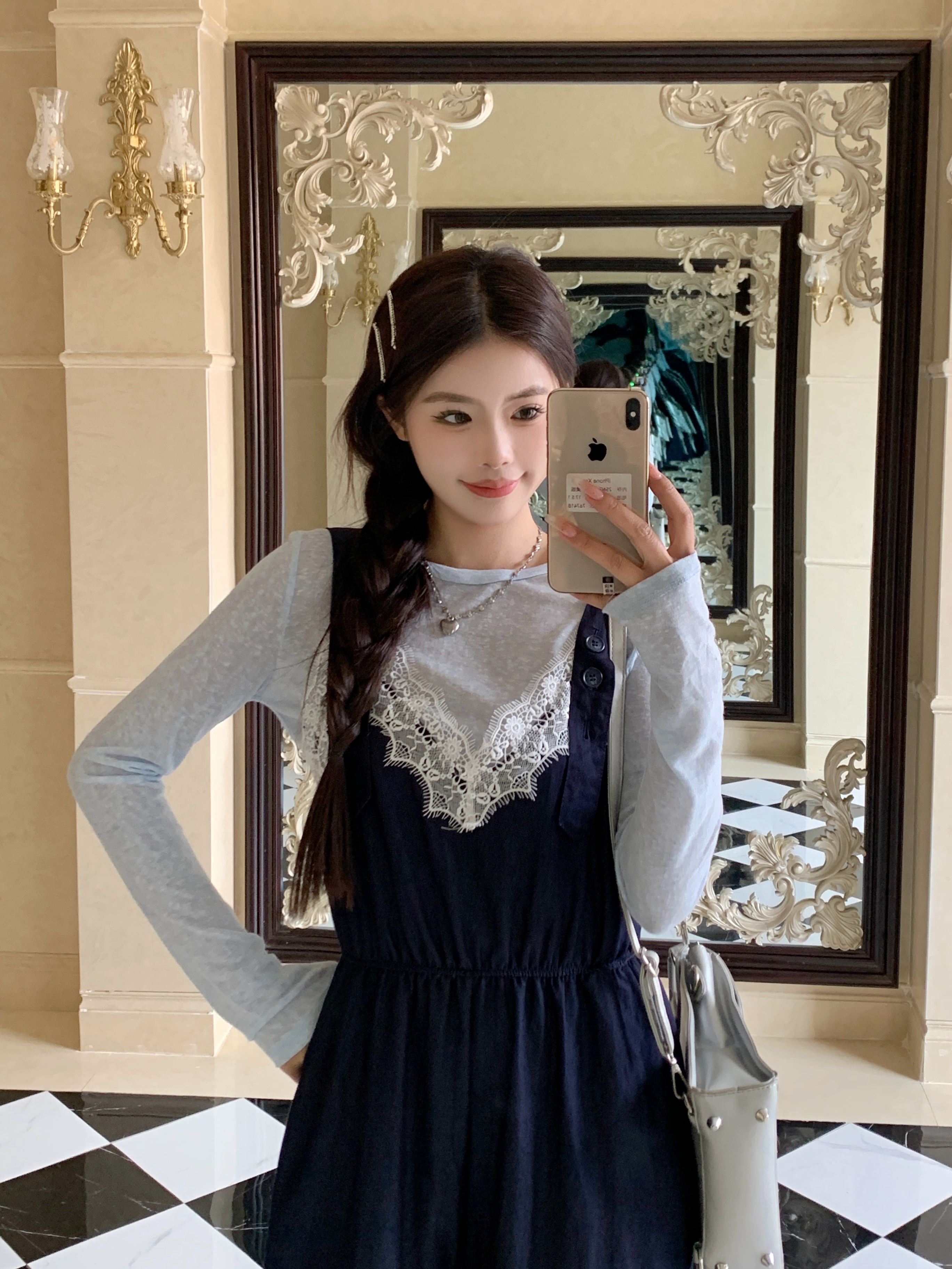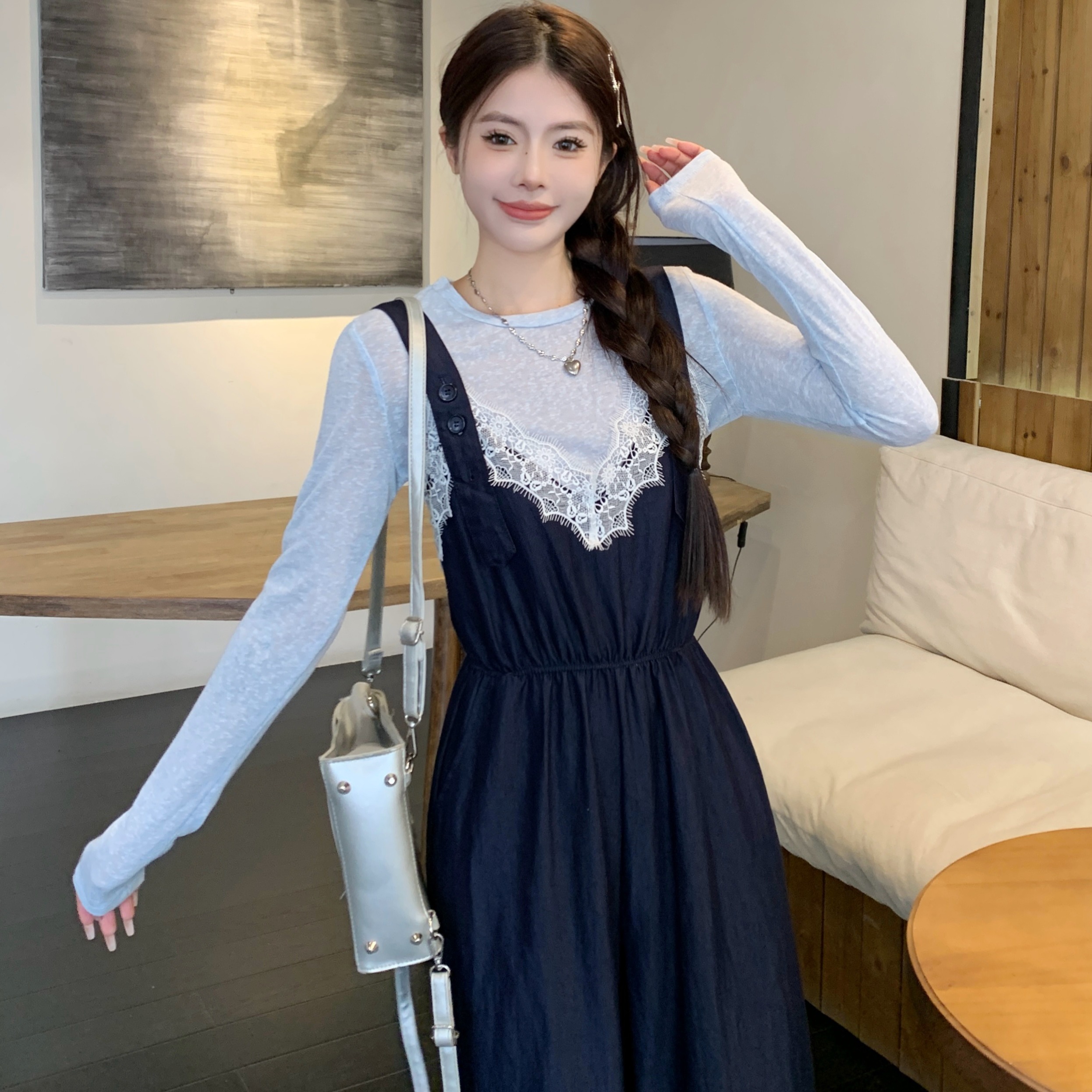 실사 꽃무늬 레이스 광장 칼라 레이스업 캐미솔 목이버섯 레이스 반신 스커트 중간 길이 큰 진자 우산 치마