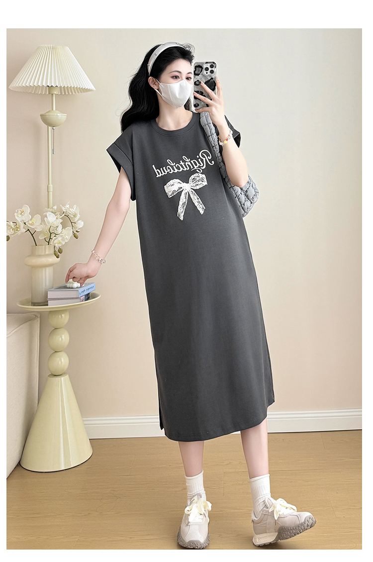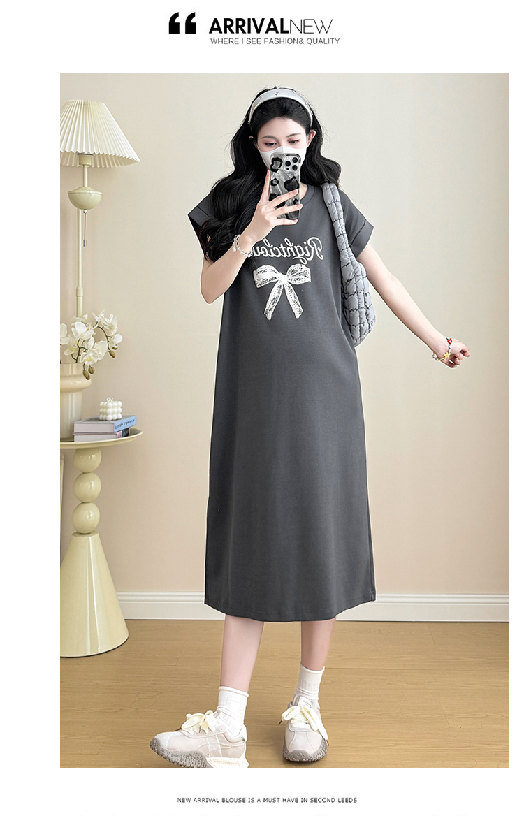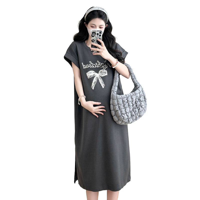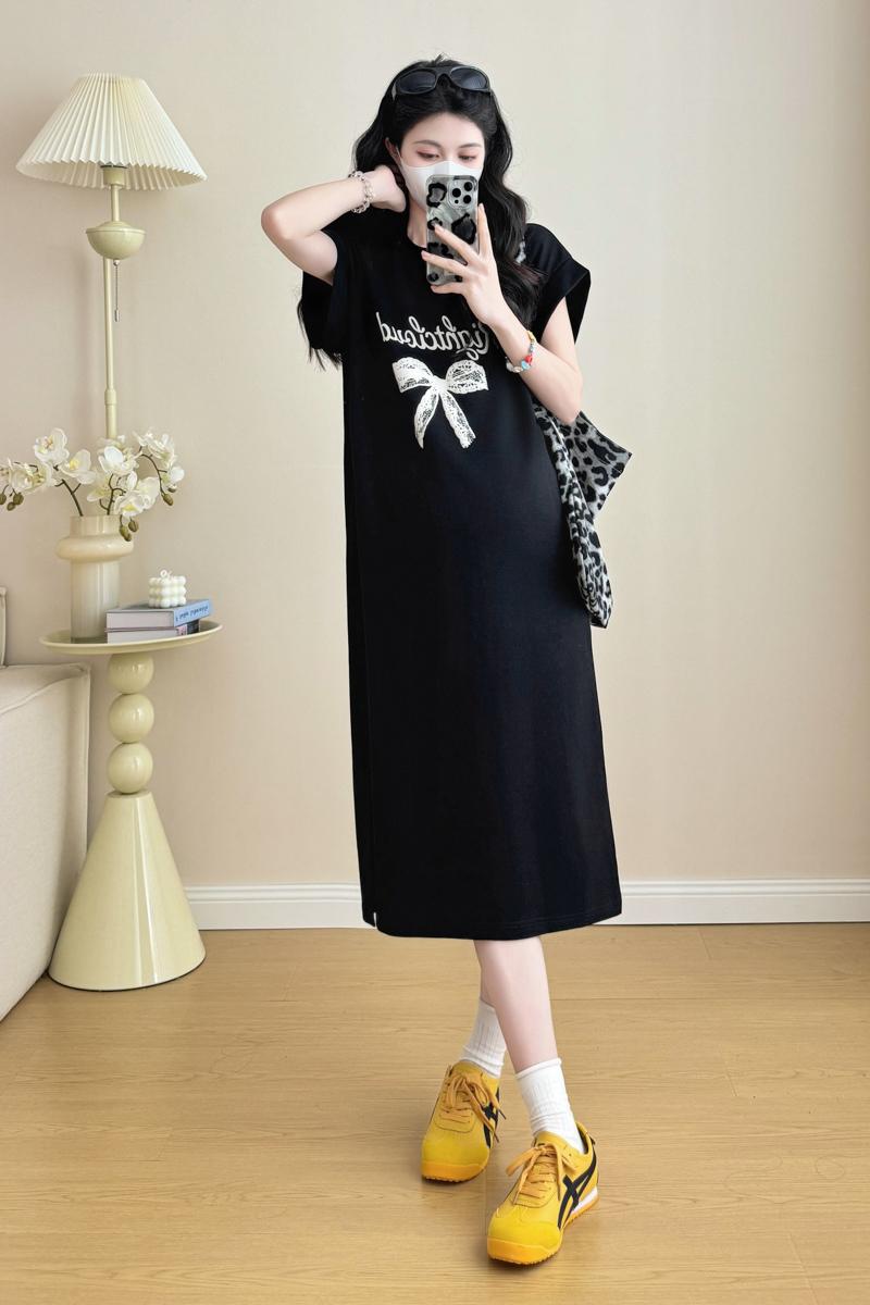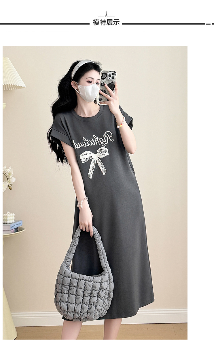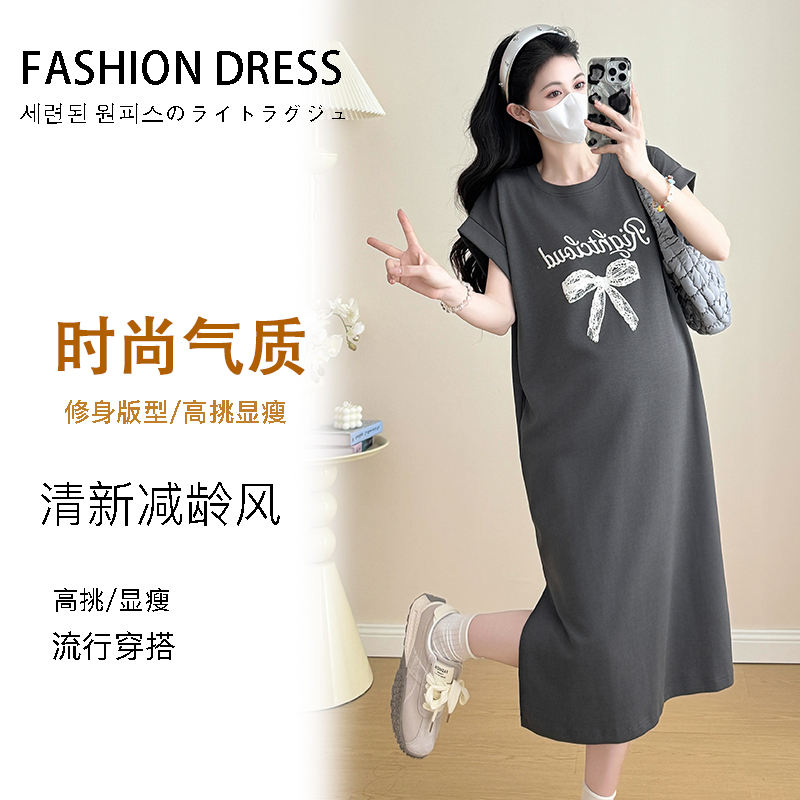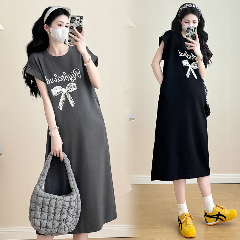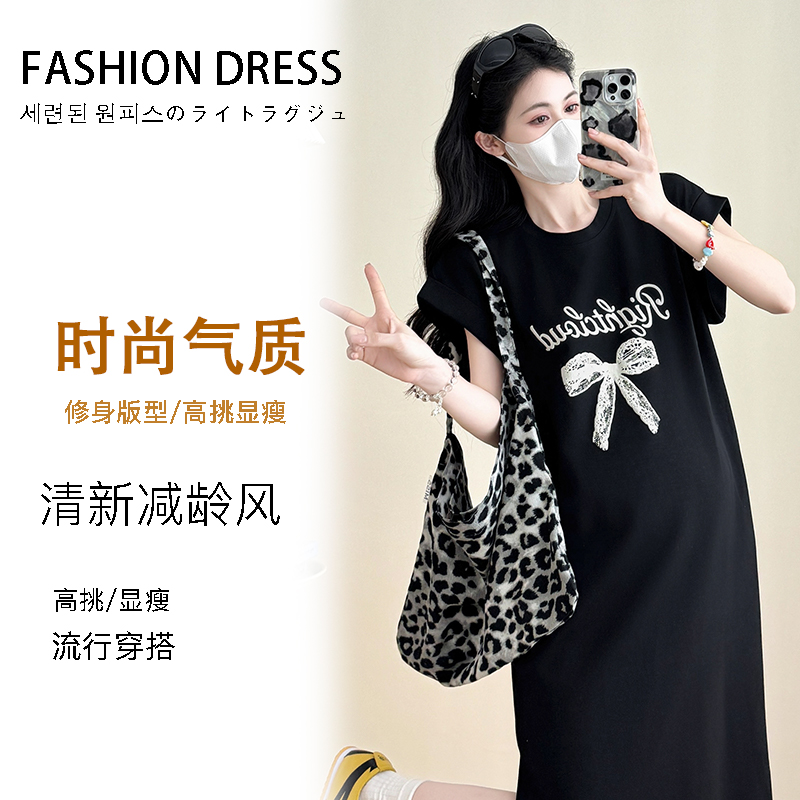 실사 지금 지금 2026 임산부 새로운 라운드 넥 알파벳 반팔 티셔츠 길다 치마 여름 루즈핏 캐주얼 드레스