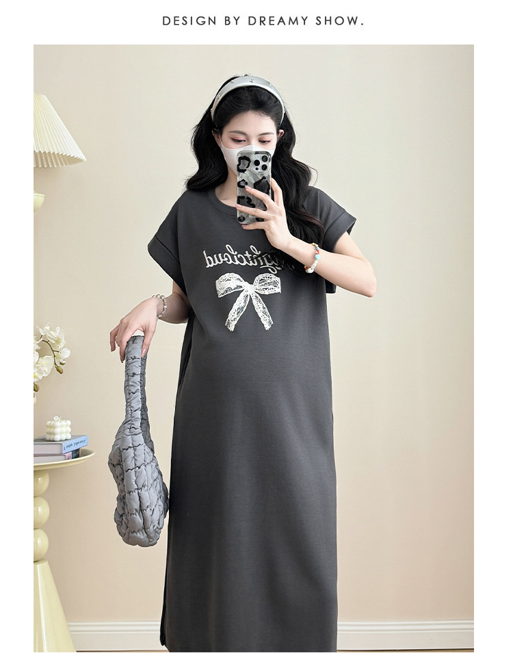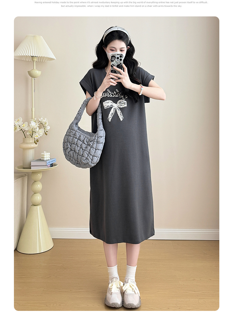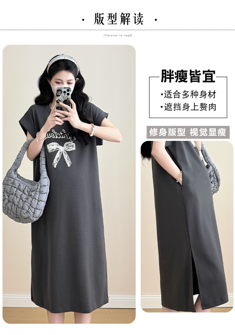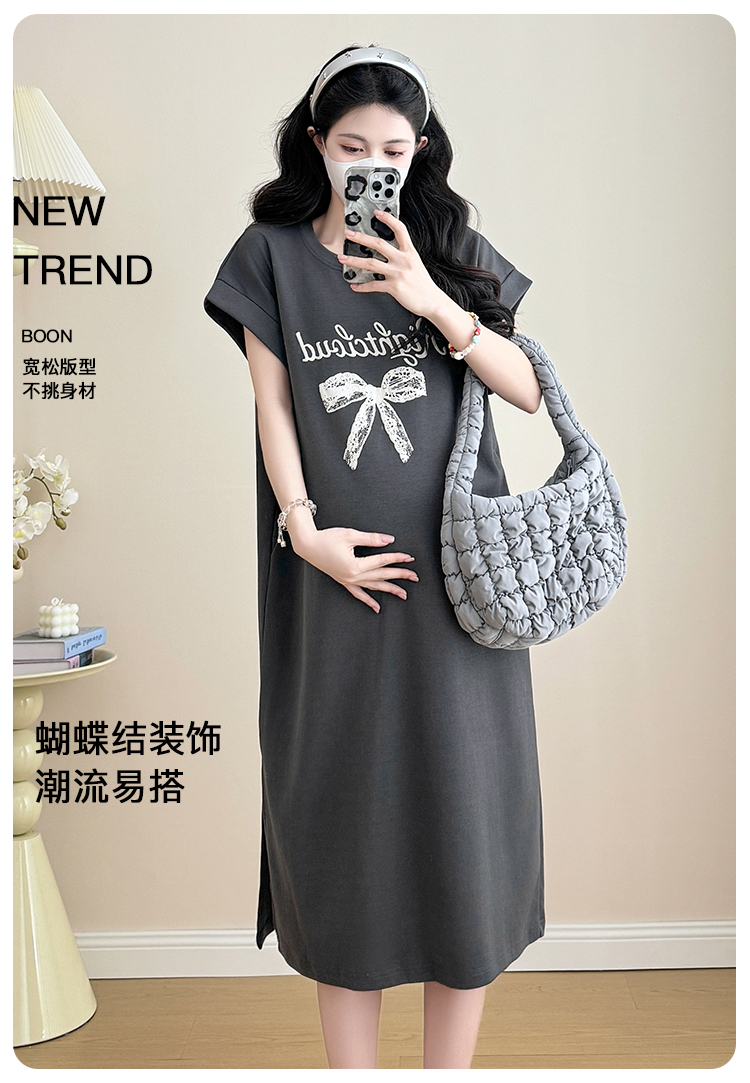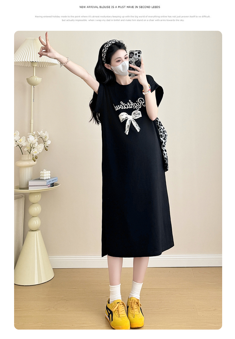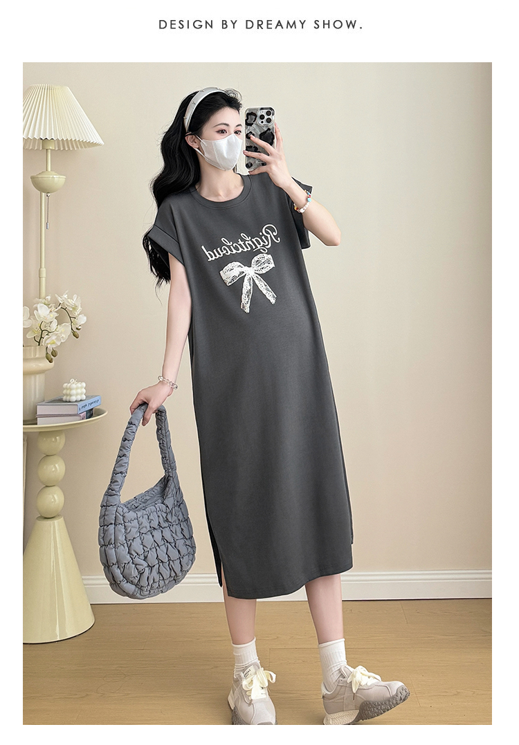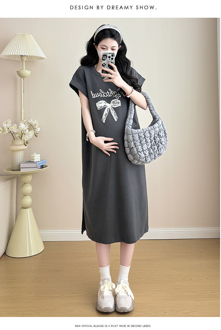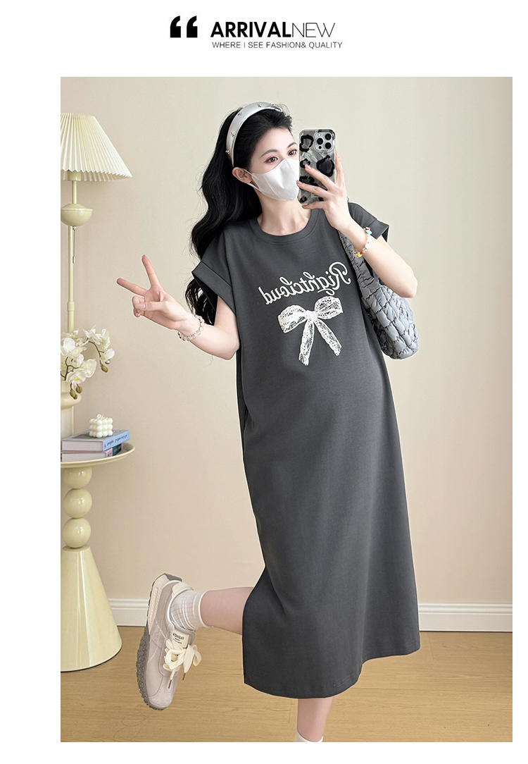 실사 지금 지금 2026 임산부 새로운 라운드 넥 알파벳 반팔 티셔츠 길다 치마 여름 루즈핏 캐주얼 드레스
