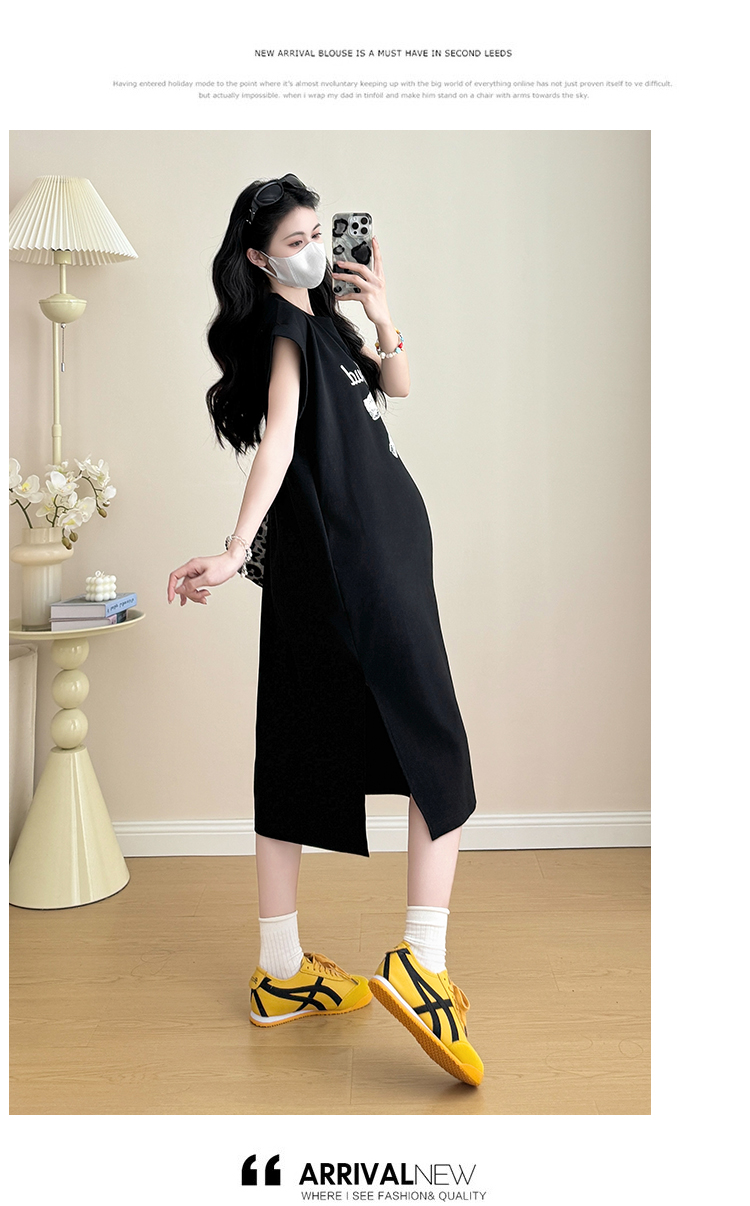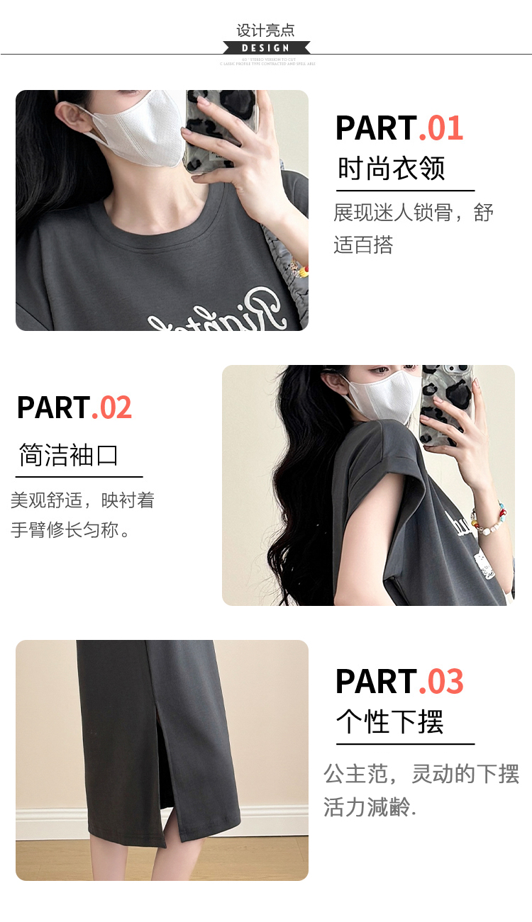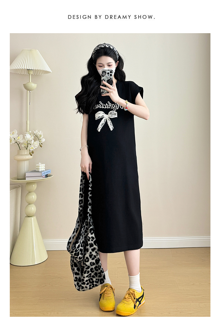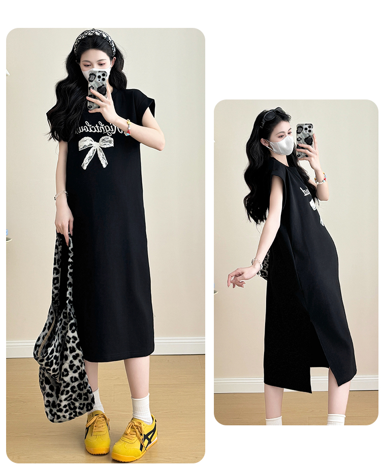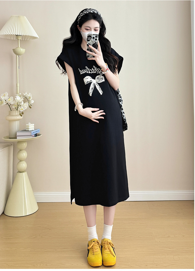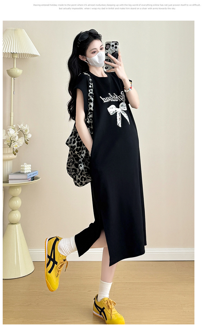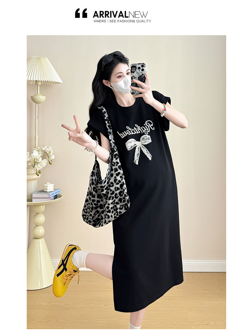 실사 지금 지금 2026 임산부 새로운 라운드 넥 알파벳 반팔 티셔츠 길다 치마 여름 루즈핏 캐주얼 드레스