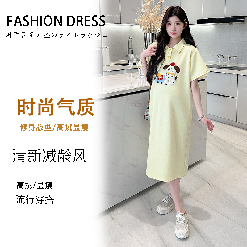 2026 실사 여름 새로운 슬림해 보이는 여성 자수 패키지 과립 버클 중간 길이 임산부 패션 폴로 칼라 드레스