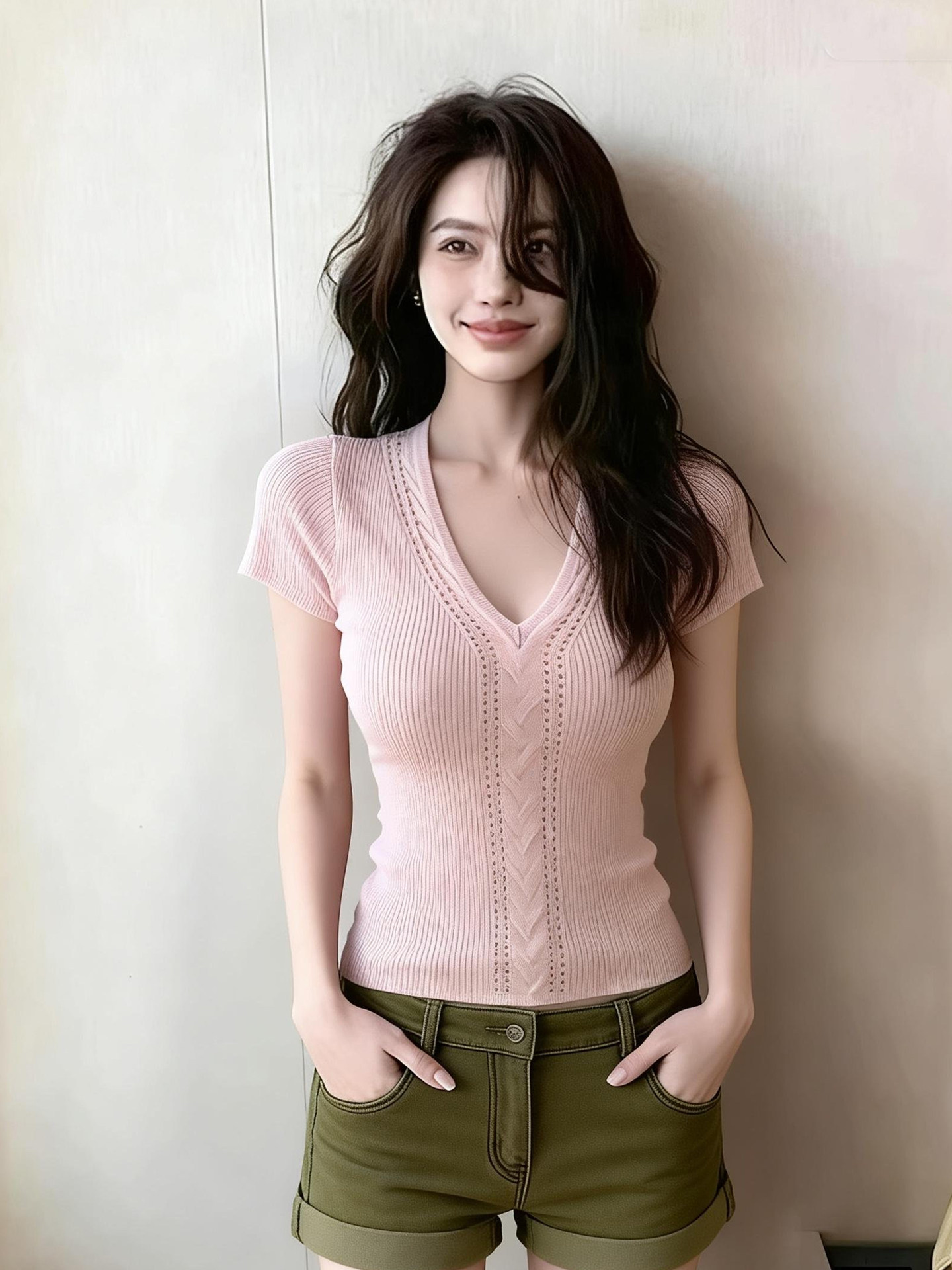 순수한 욕망 바람 V넥 홀로우 아웃 자카드 니트 티셔츠 여성 디자인 센스 몸매 가꾸기 슬림해 보이는 부드러운 바람 맨위
