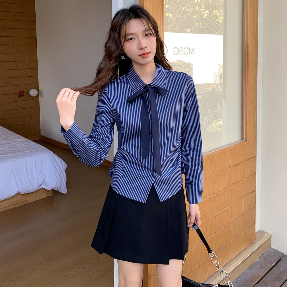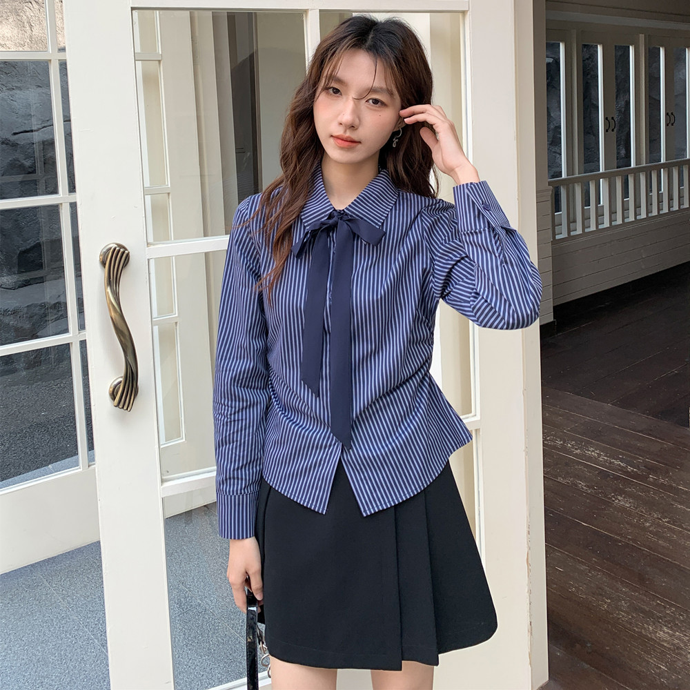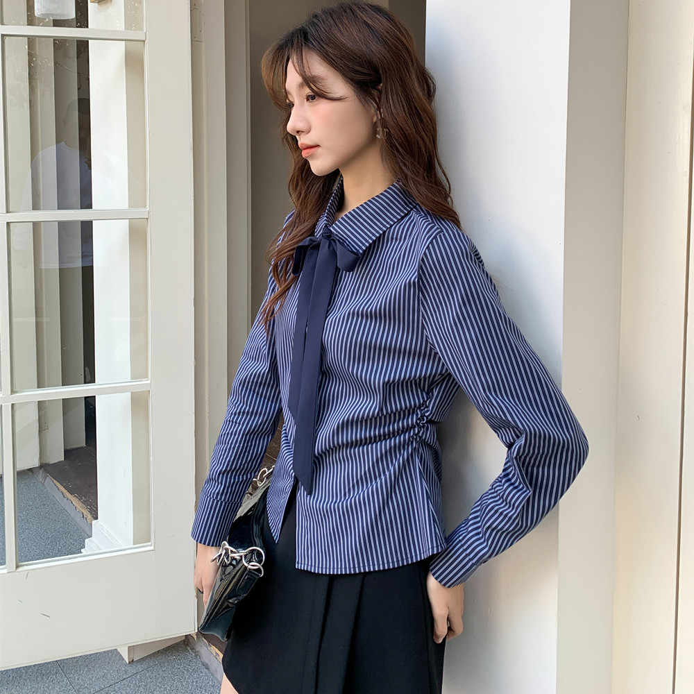 실사 학원 스타일 핫걸 셔츠 긴팔 여성 스트라이프 디자인 센스 몸매 가꾸기 허리 수축 셔츠