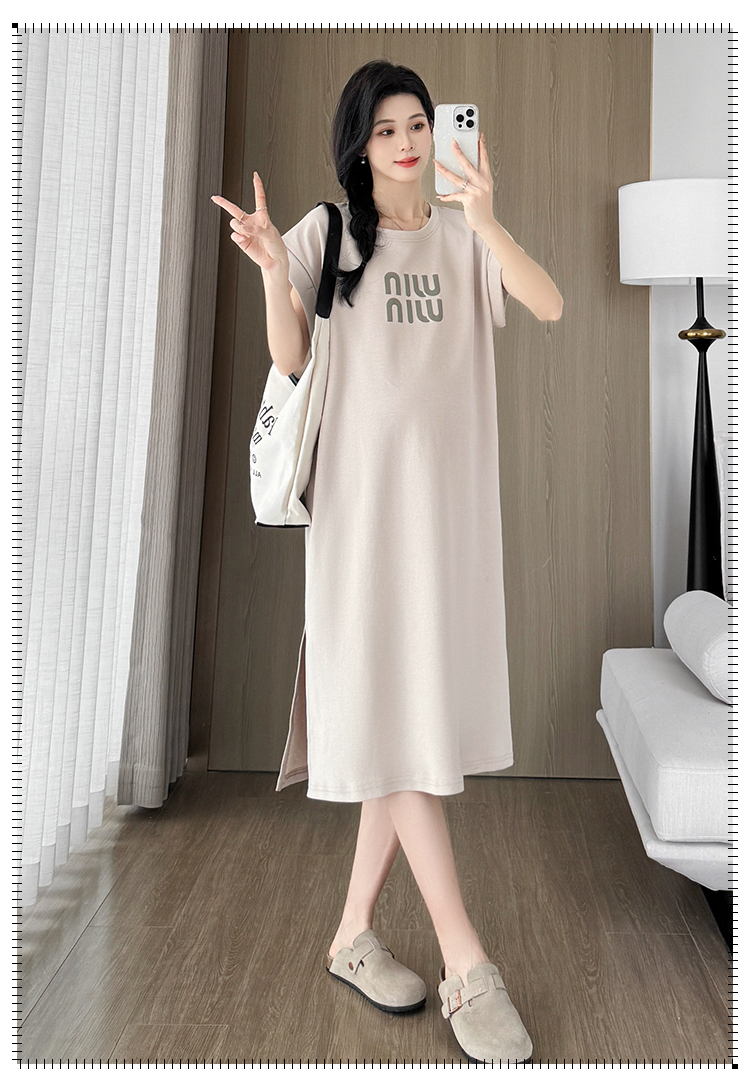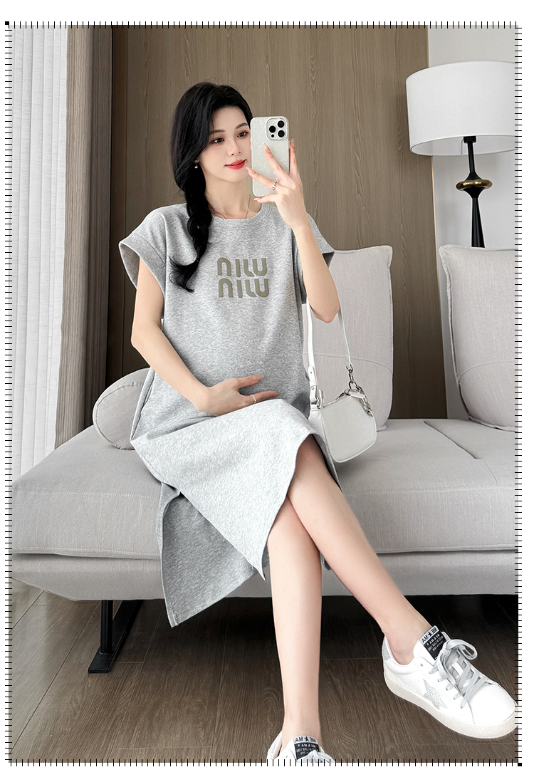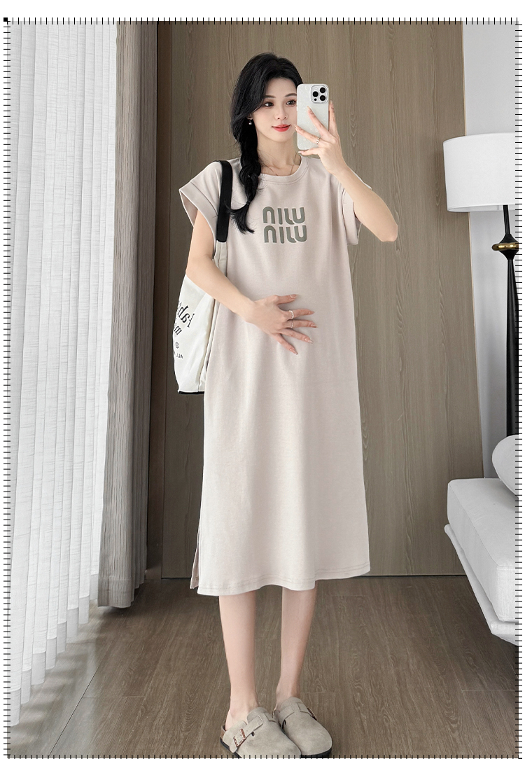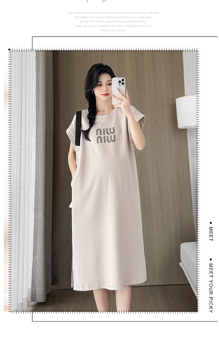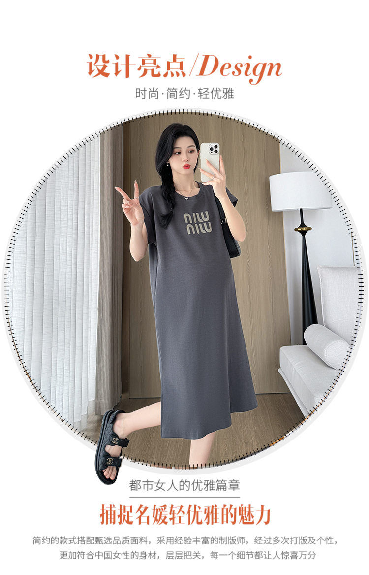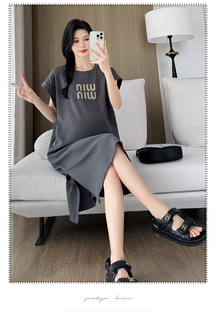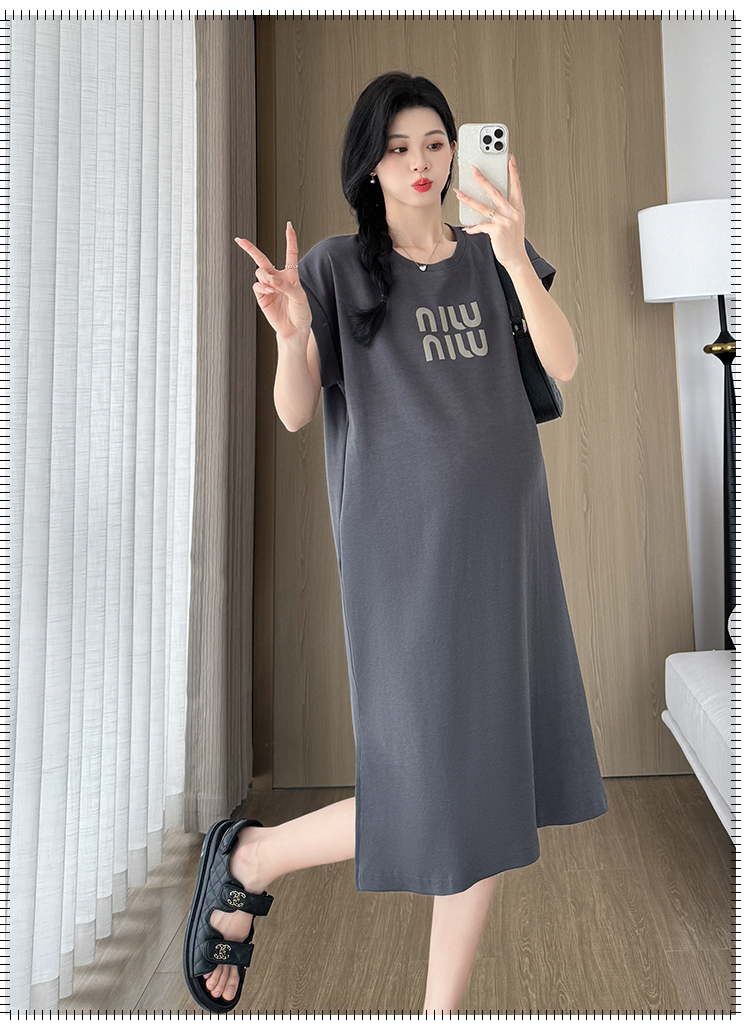 실사 지금 지금 2026 임산부 새로운 라운드 넥 알파벳 반팔 티셔츠 길다 치마 여름 루즈핏 캐주얼 드레스
