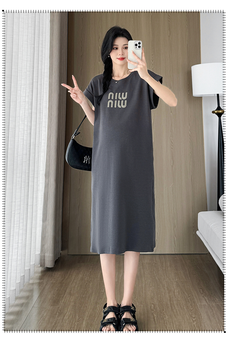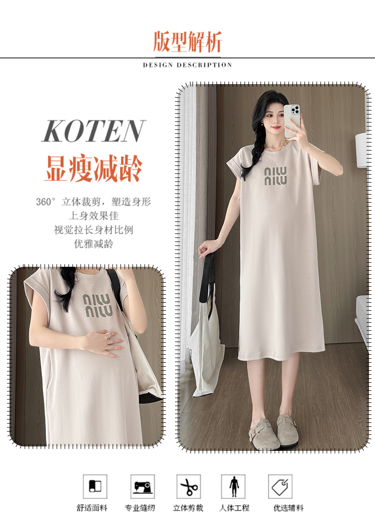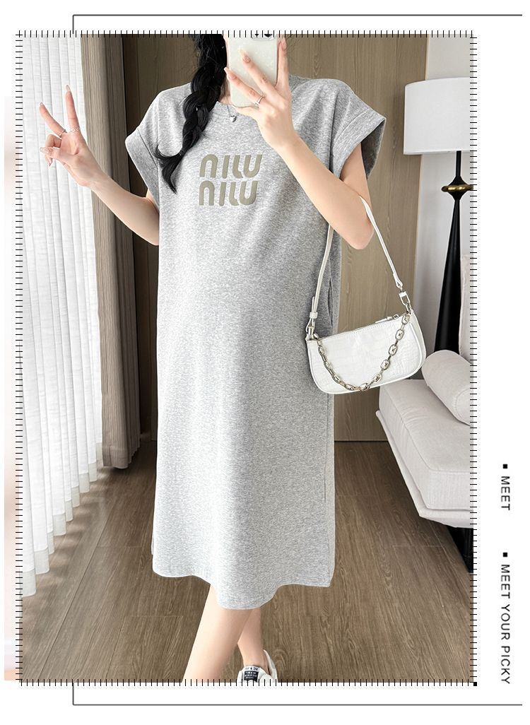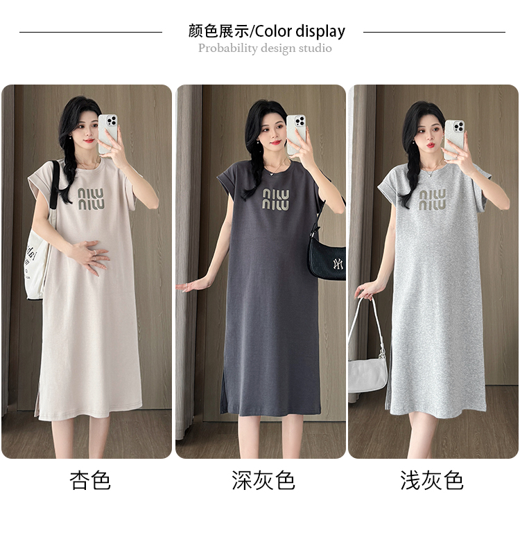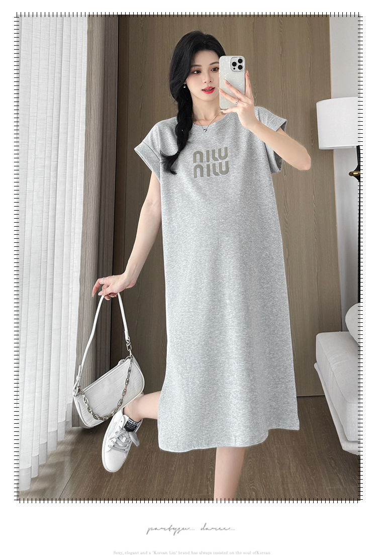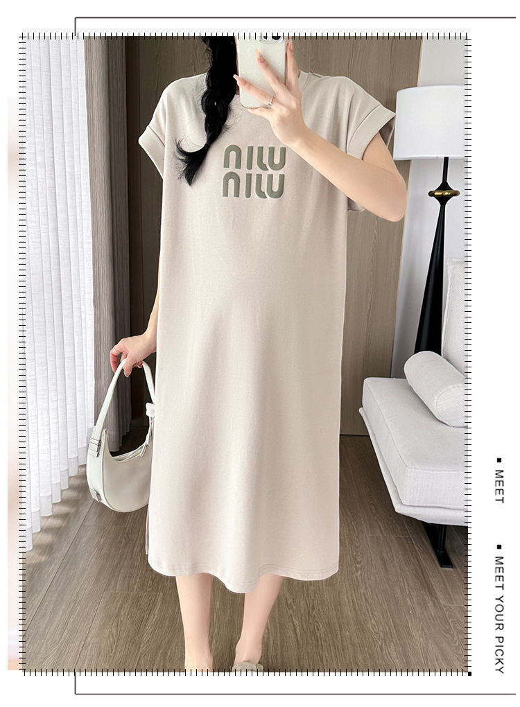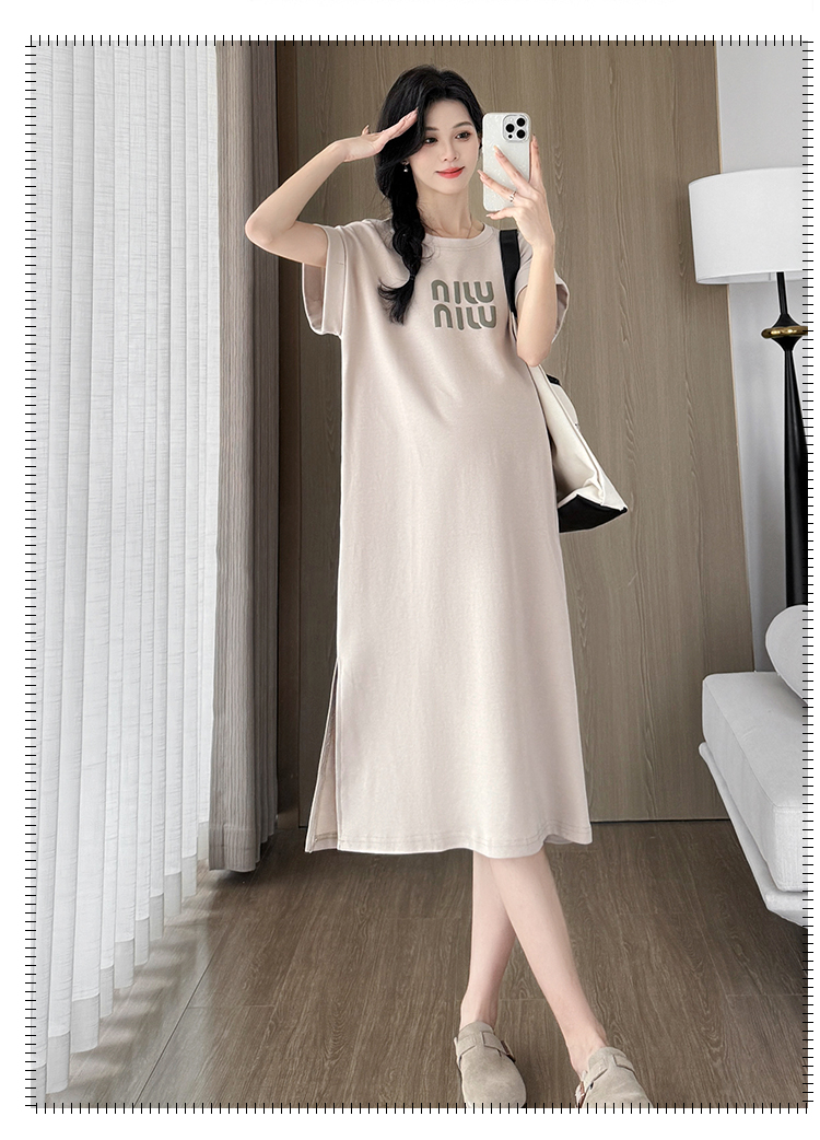 실사 지금 지금 2026 임산부 새로운 라운드 넥 알파벳 반팔 티셔츠 길다 치마 여름 루즈핏 캐주얼 드레스