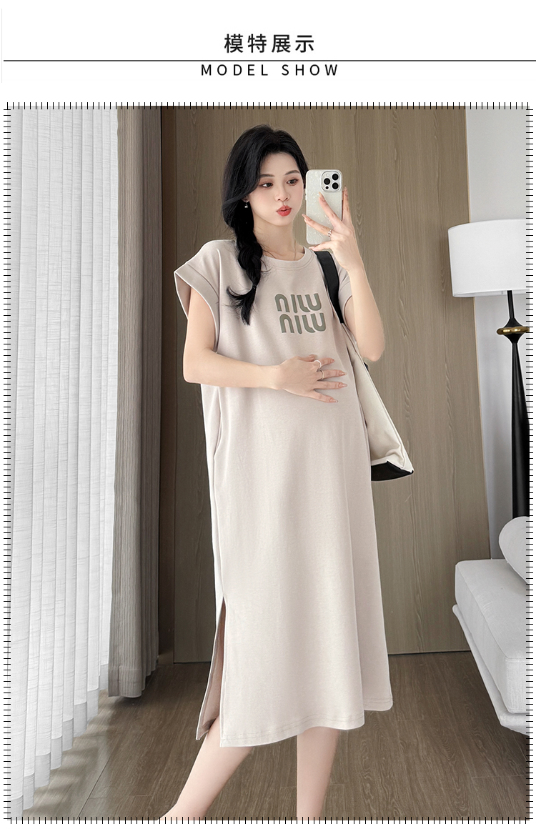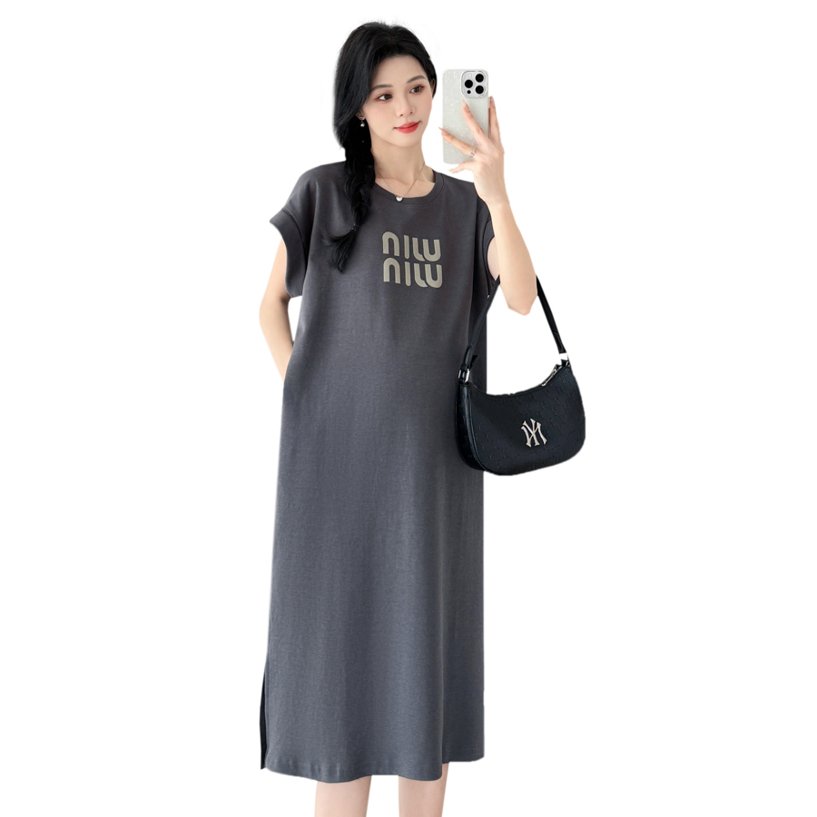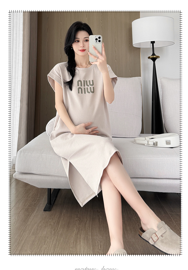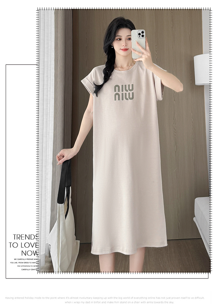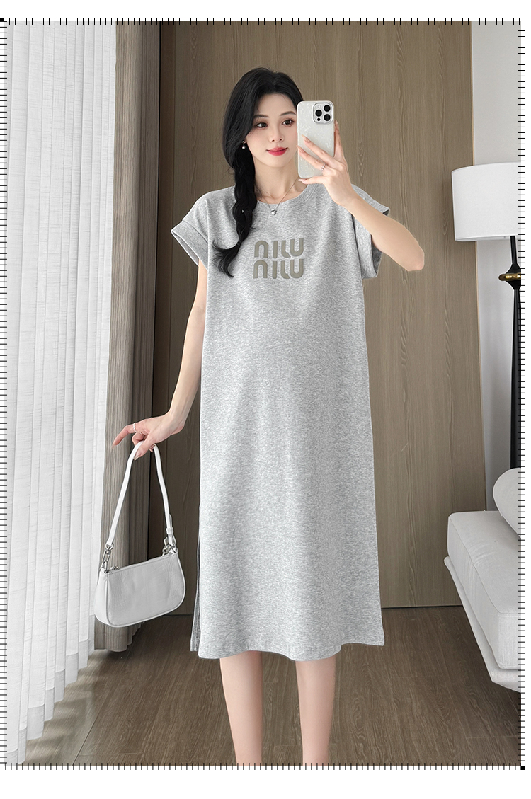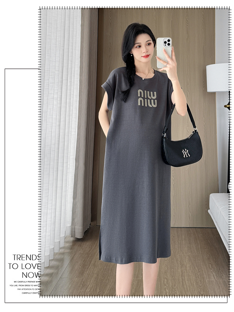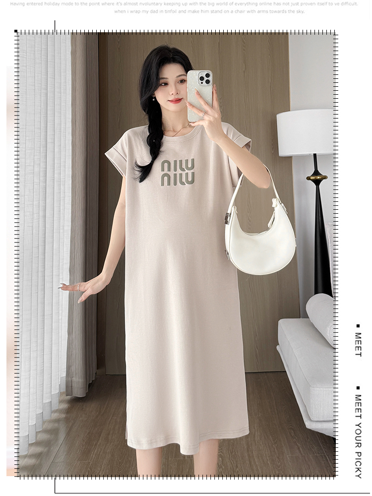 실사 지금 지금 2026 임산부 새로운 라운드 넥 알파벳 반팔 티셔츠 길다 치마 여름 루즈핏 캐주얼 드레스
