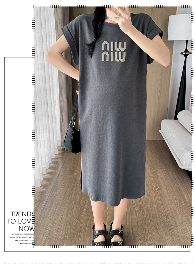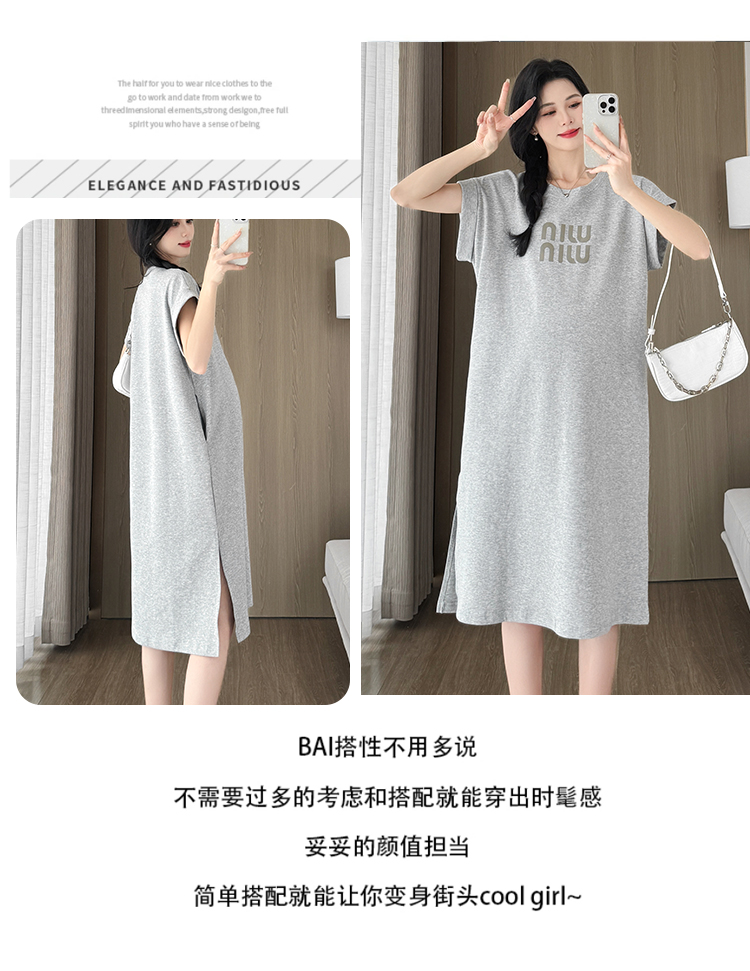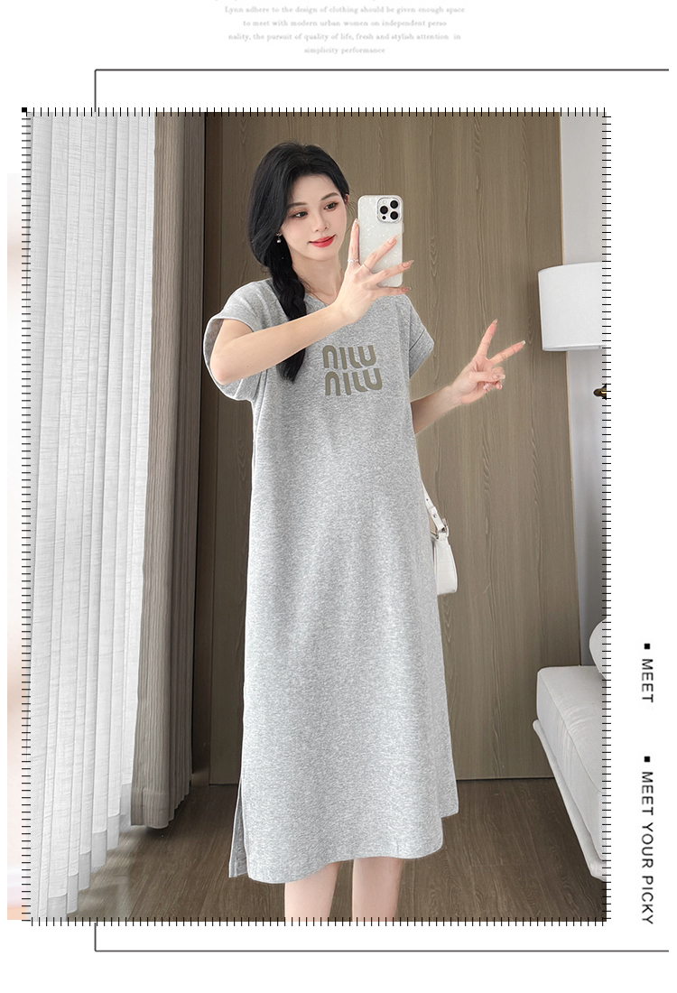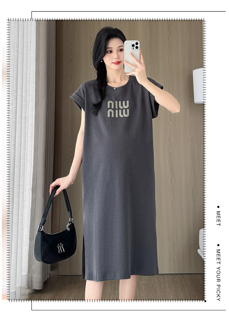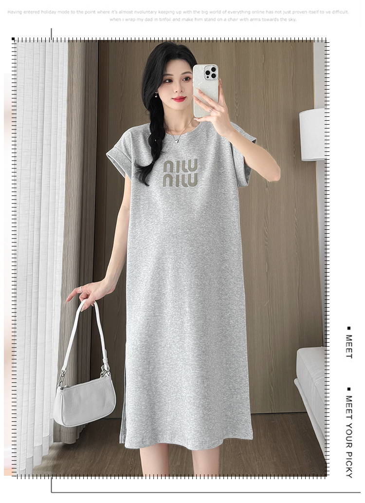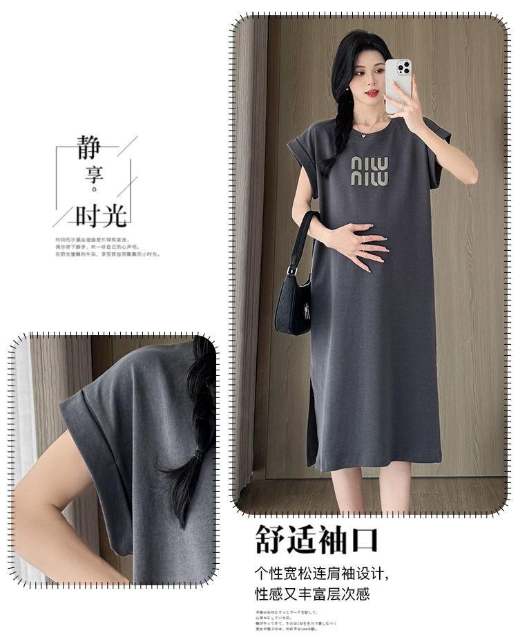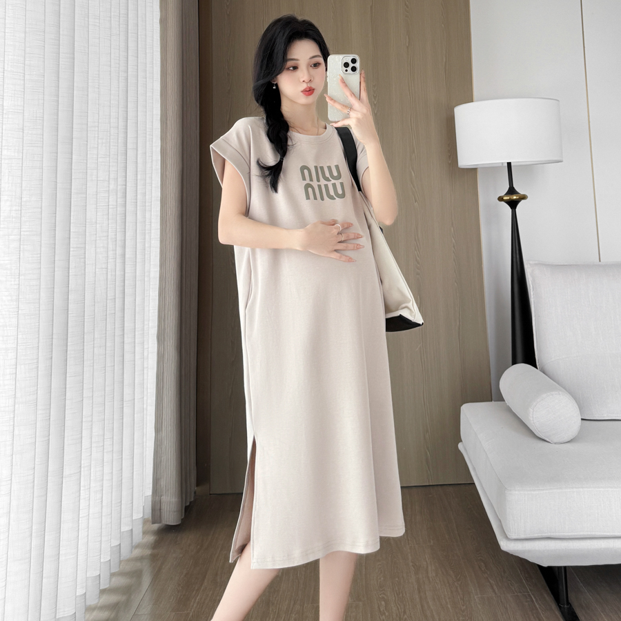 실사 지금 지금 2026 임산부 새로운 라운드 넥 알파벳 반팔 티셔츠 길다 치마 여름 루즈핏 캐주얼 드레스