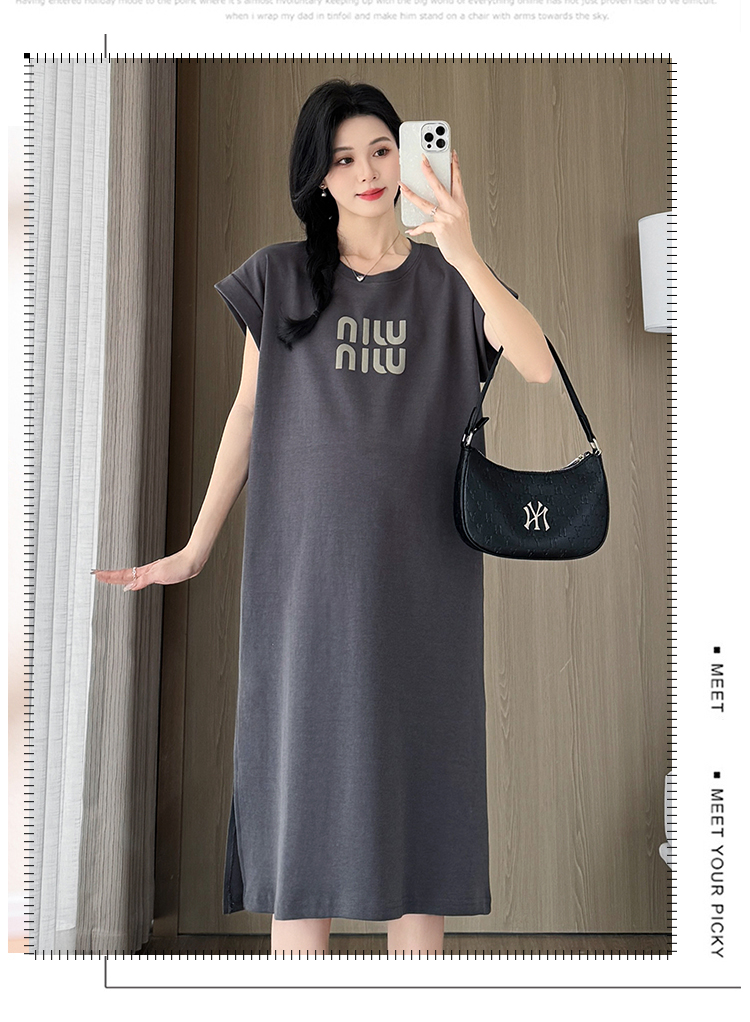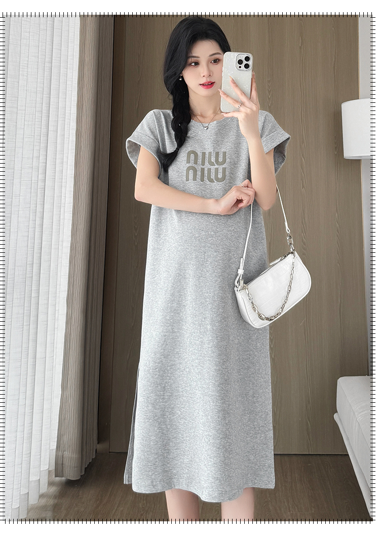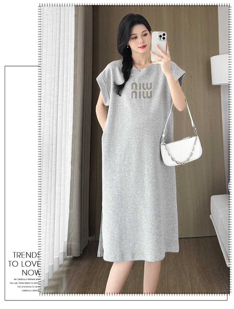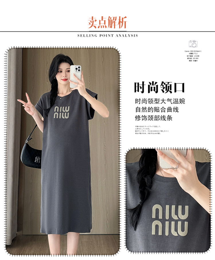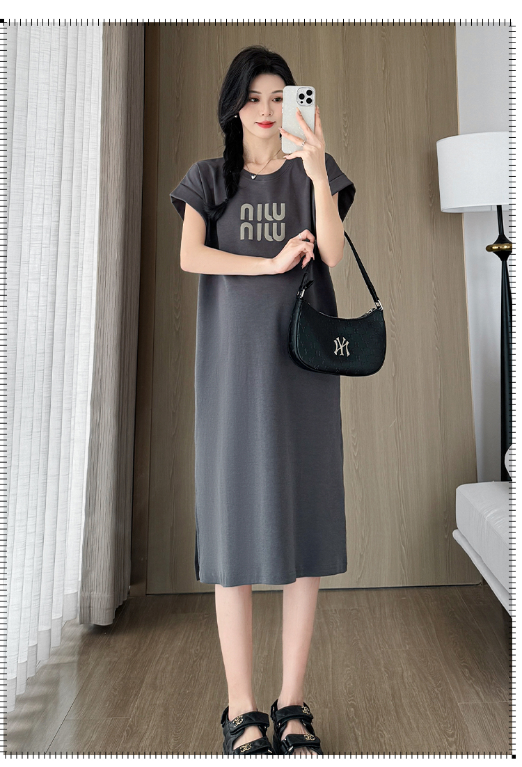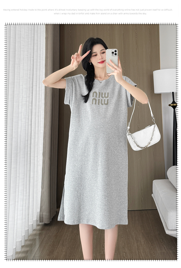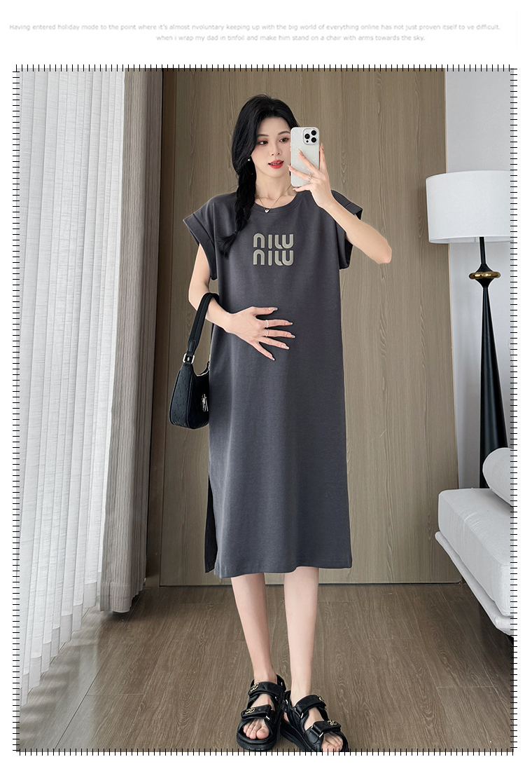 실사 지금 지금 2026 임산부 새로운 라운드 넥 알파벳 반팔 티셔츠 길다 치마 여름 루즈핏 캐주얼 드레스