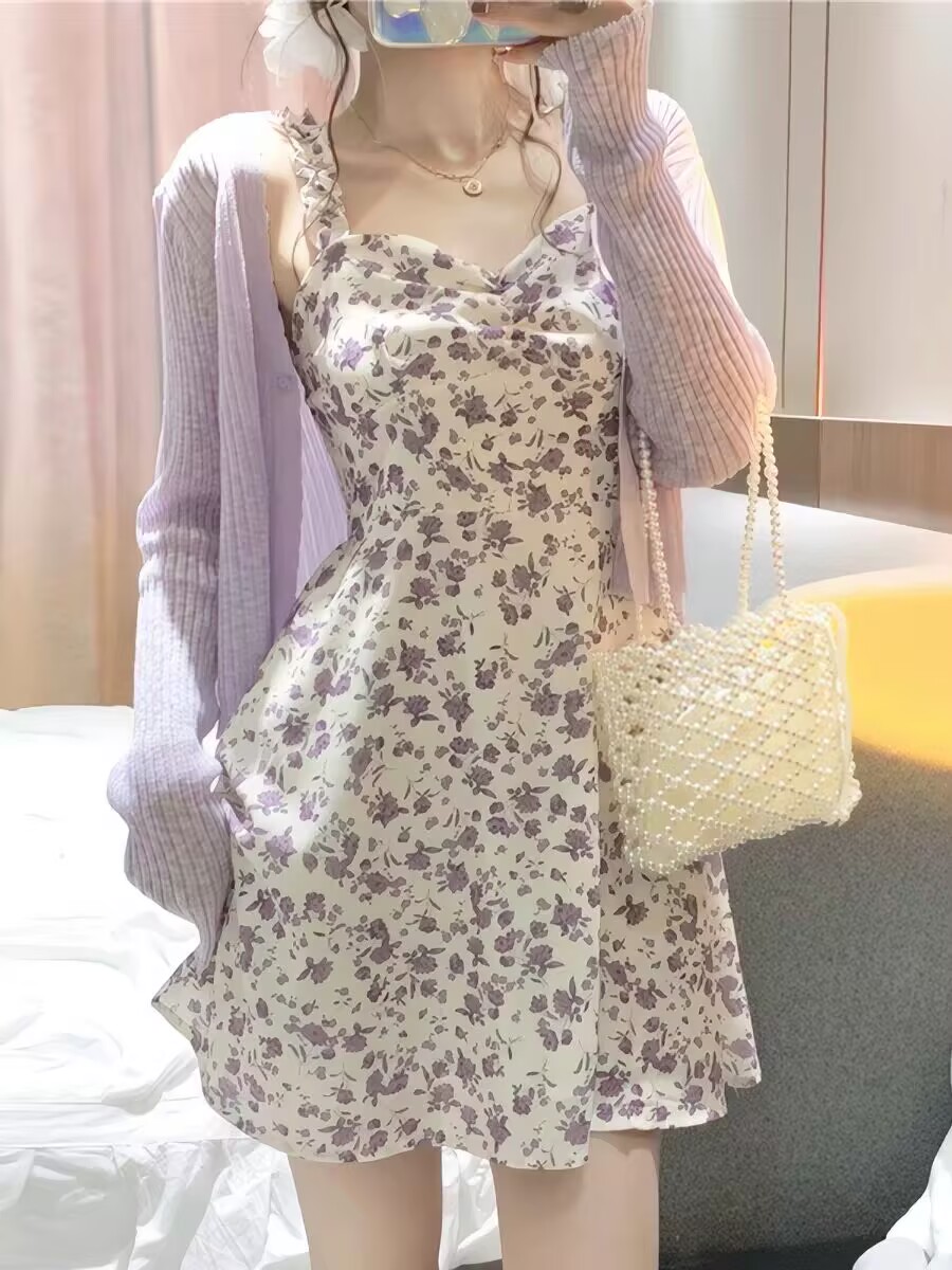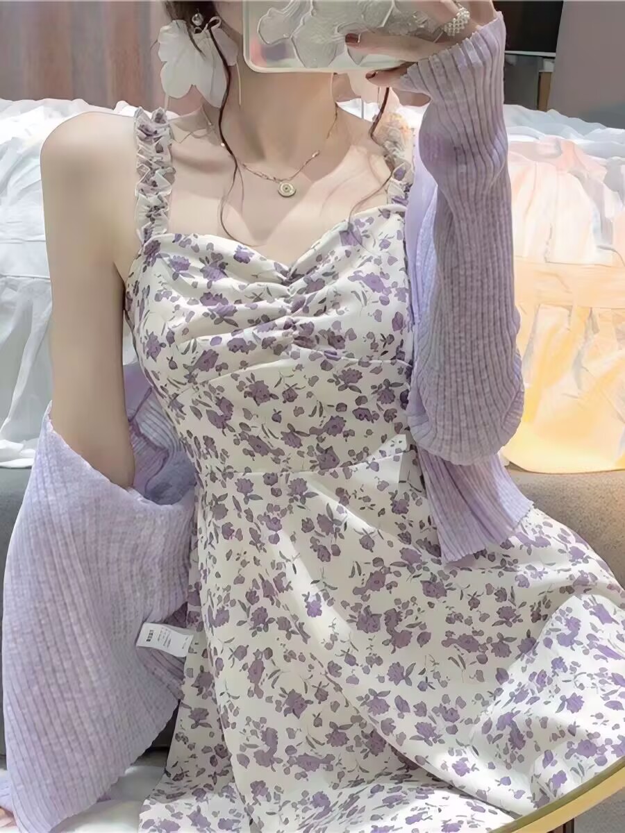 2026 새로운 프랑스식 고급 센스 작은 키 미니 스커트 보라색 꽃무늬 슬립 드레스 투피스 슈트 여성 여름
