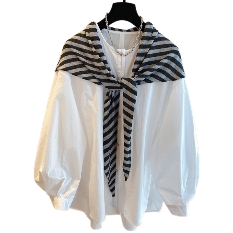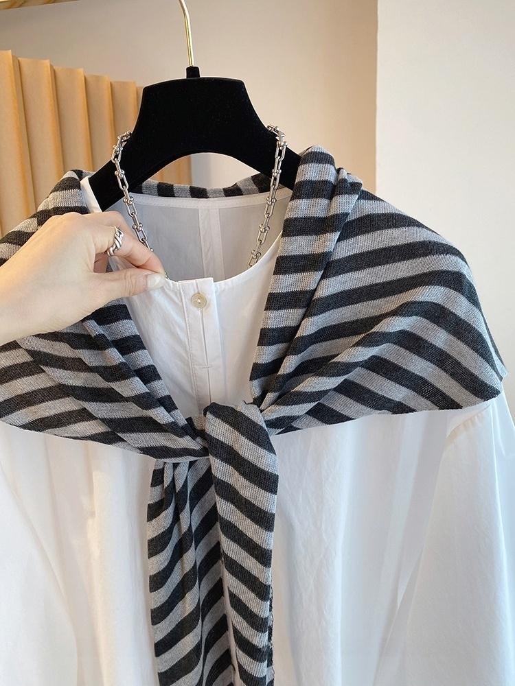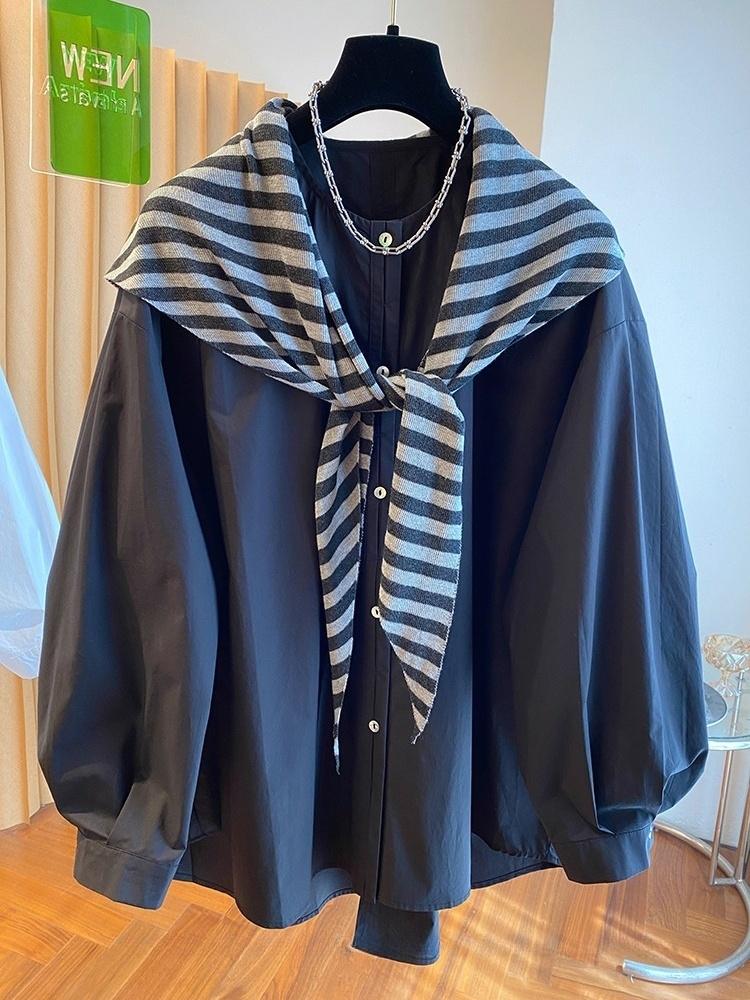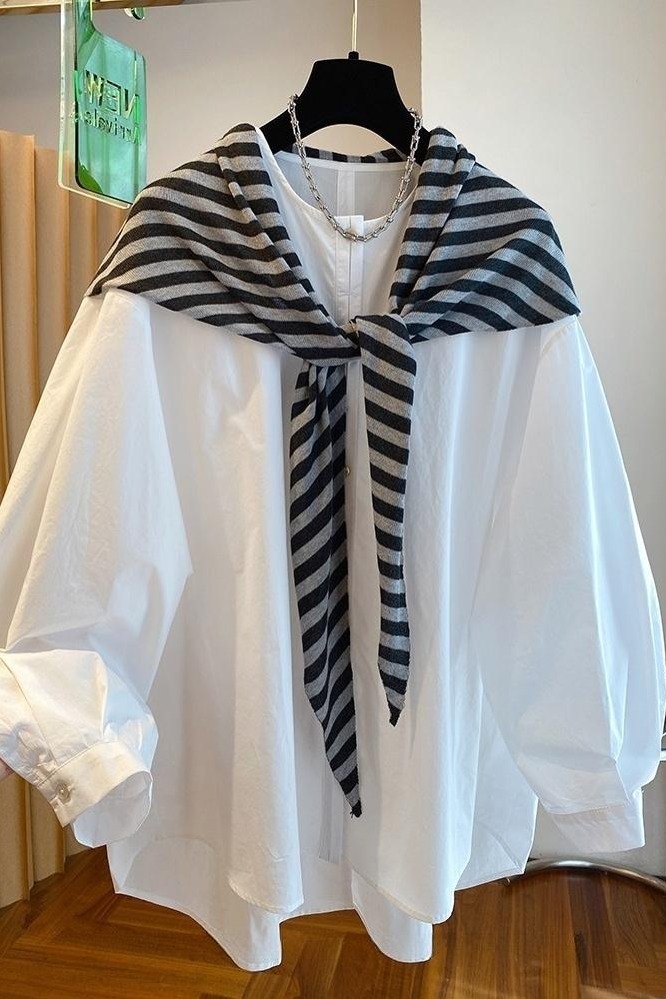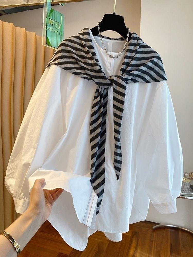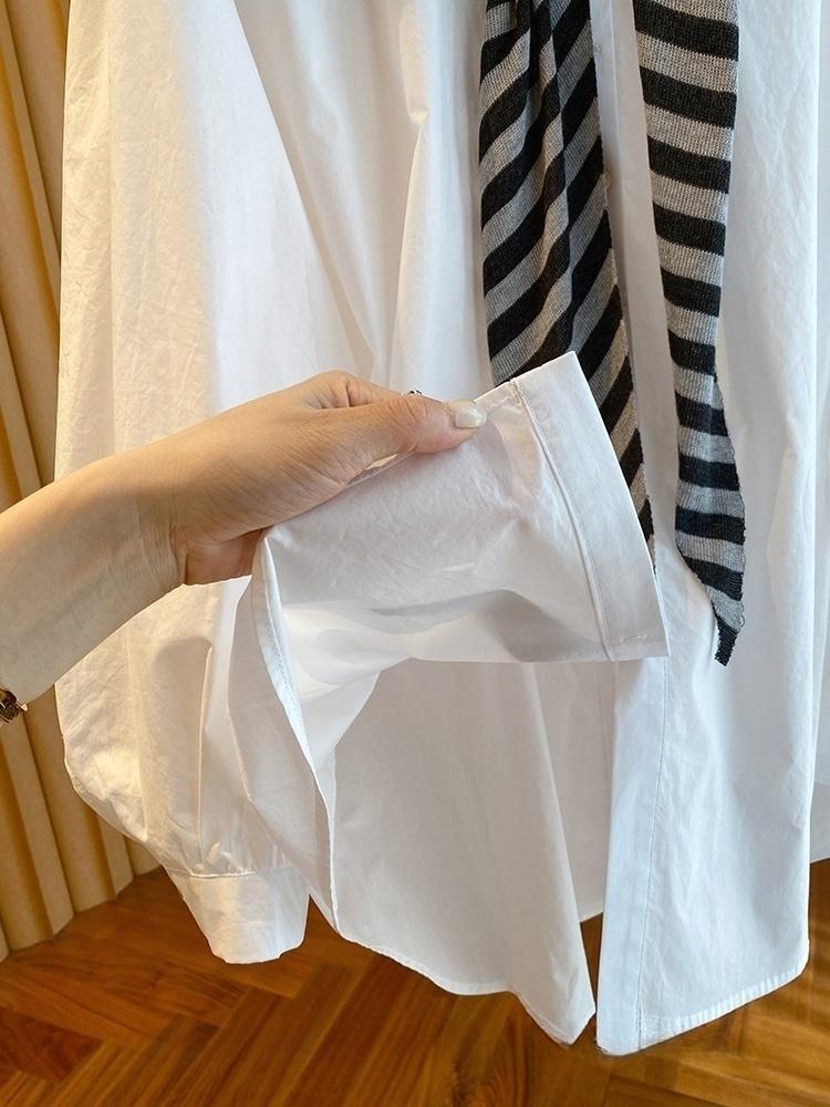 고급 센스 스트라이프 숄 긴팔 여성 셔츠 2026 새로운 봄 루즈핏 대 에디션 중간 길이 표지 엉덩이 맨위