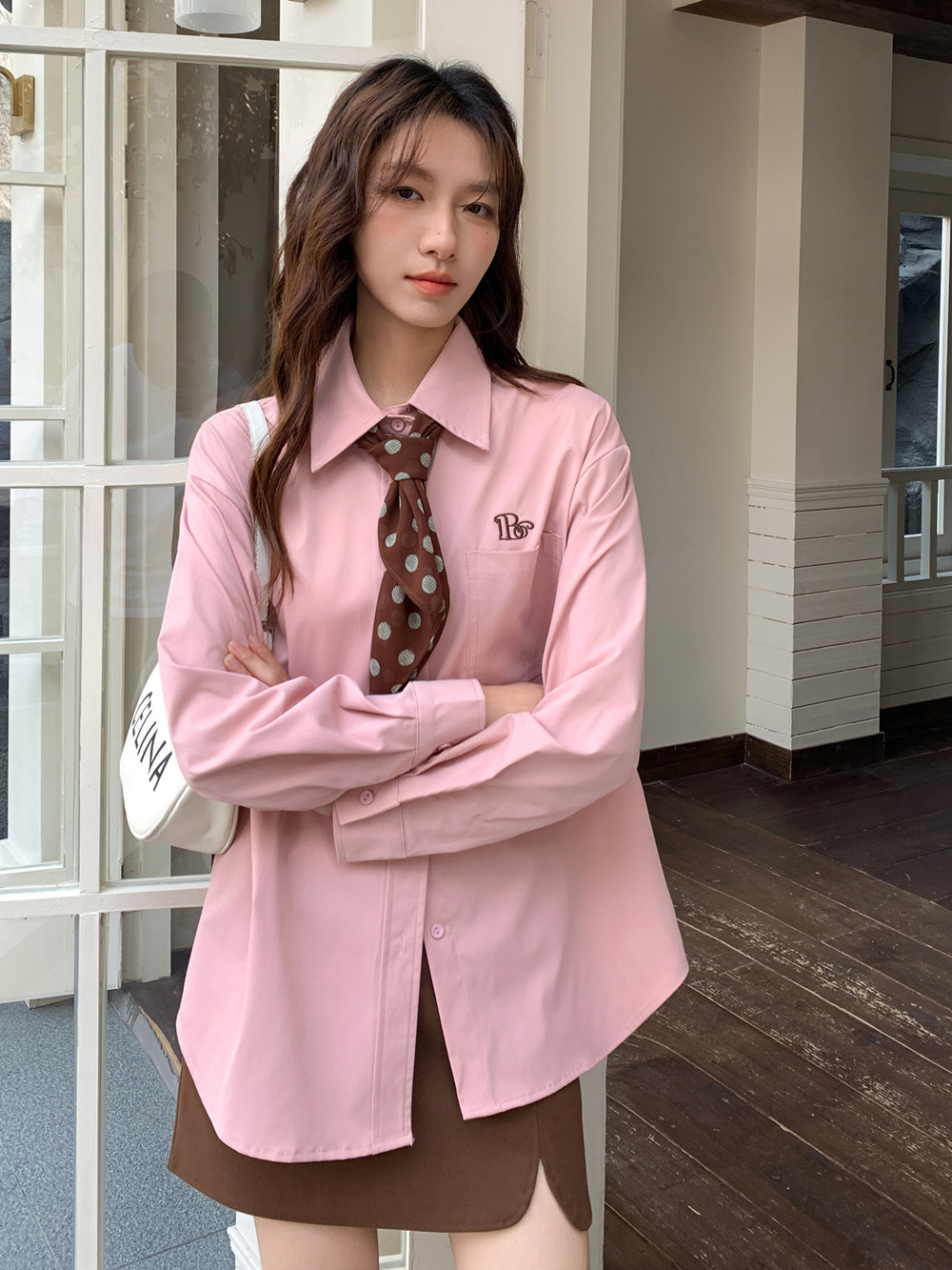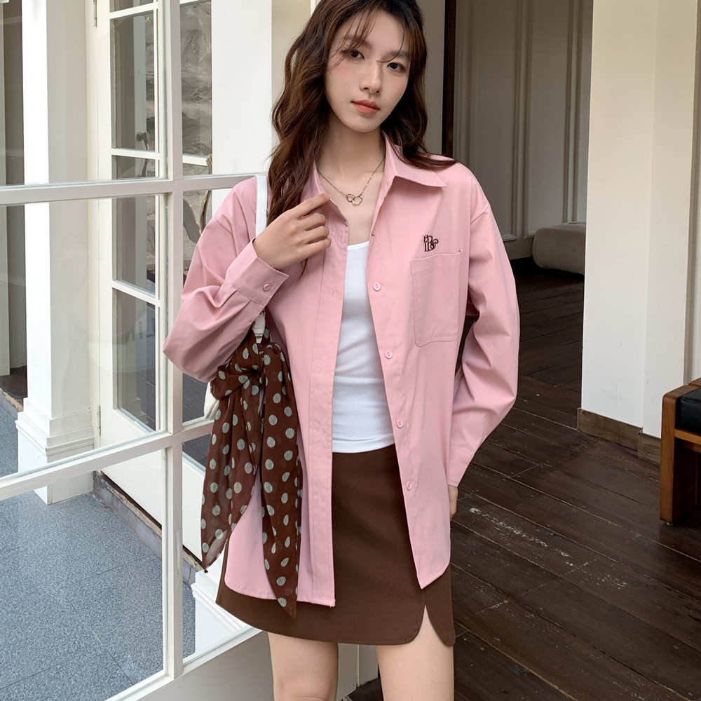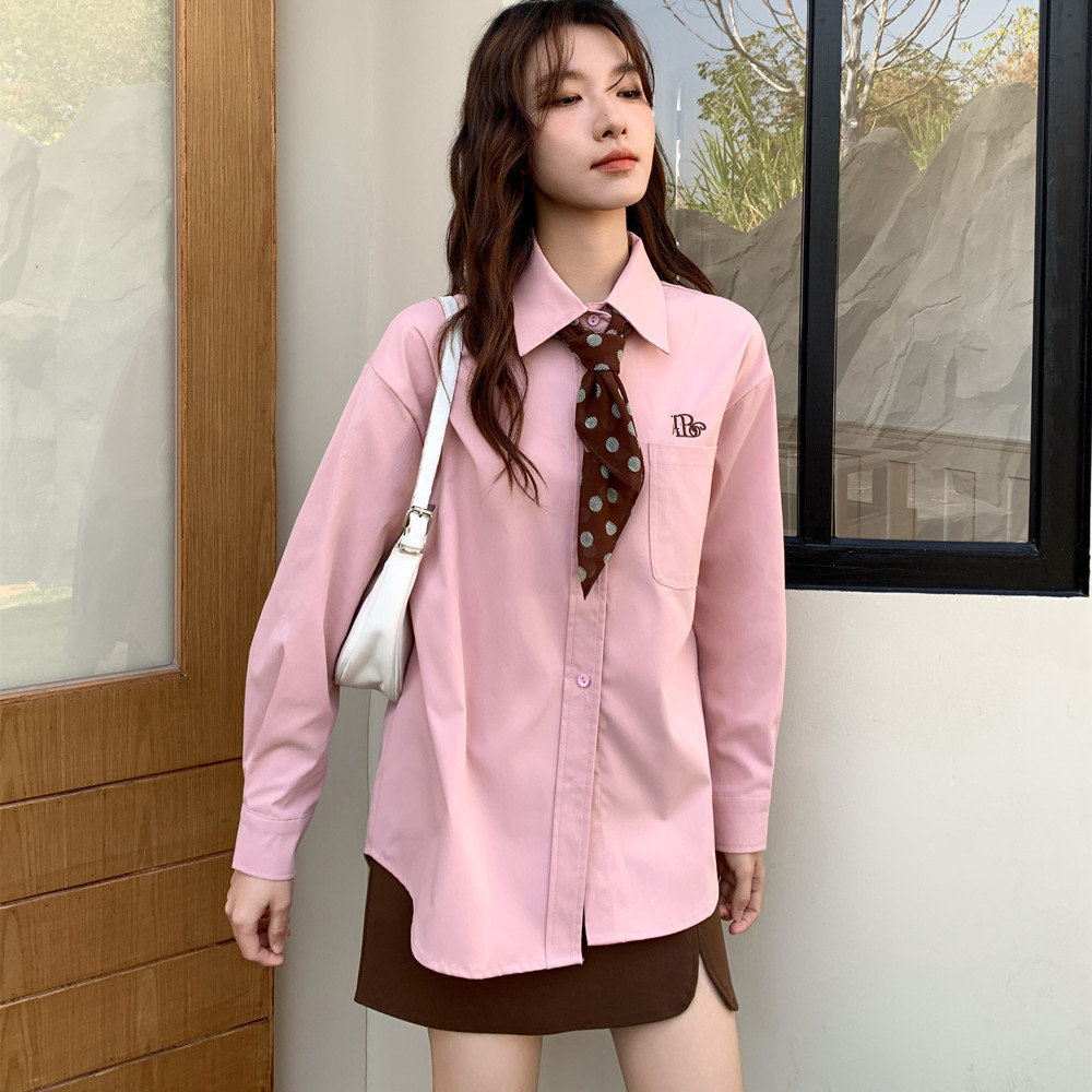 실사 미니멀리즘 자수 핑크색 셔츠 여성 긴 소매 고급 센스 루즈핏 캐주얼 셔츠 재킷 보내기 스카프