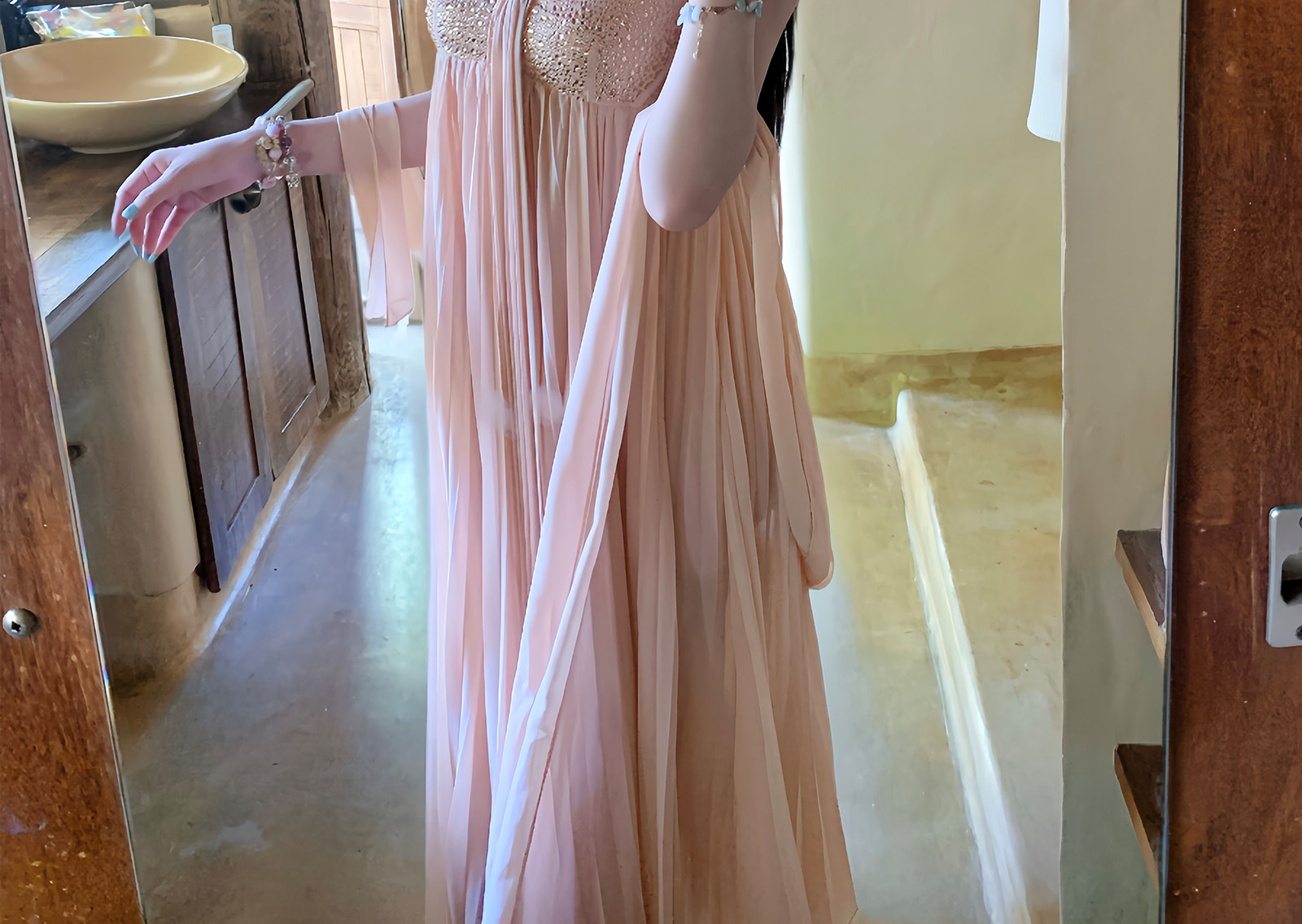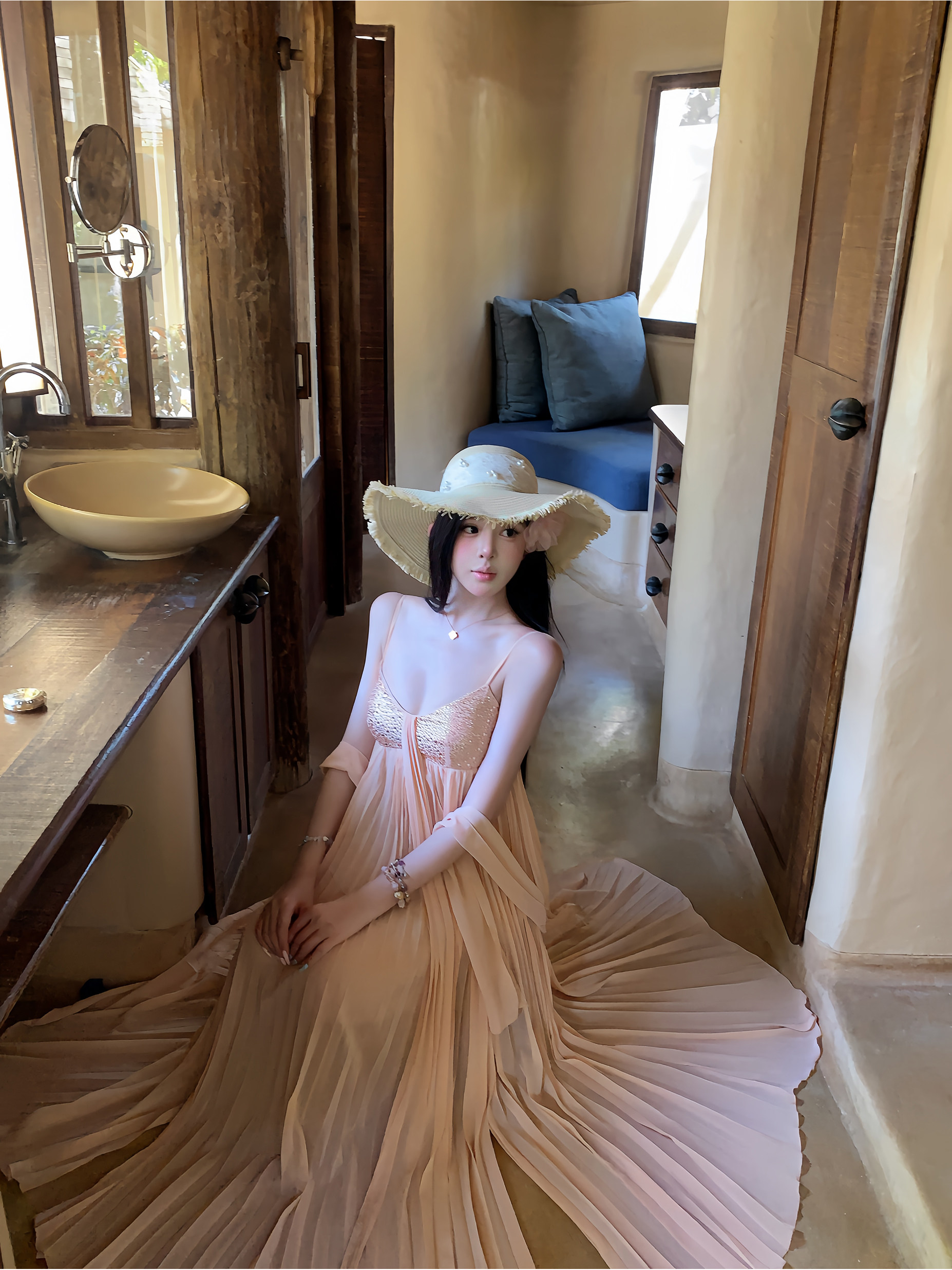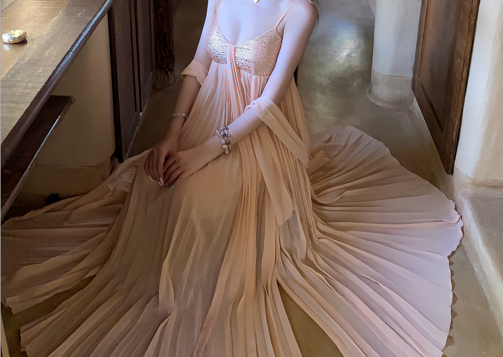 sisi jiang 矜贵 분말 훈련 빛 럭셔리 소녀 명문 여성 바람 허리 수축 자르기 슬림해 보이는 그라데이션 드레스