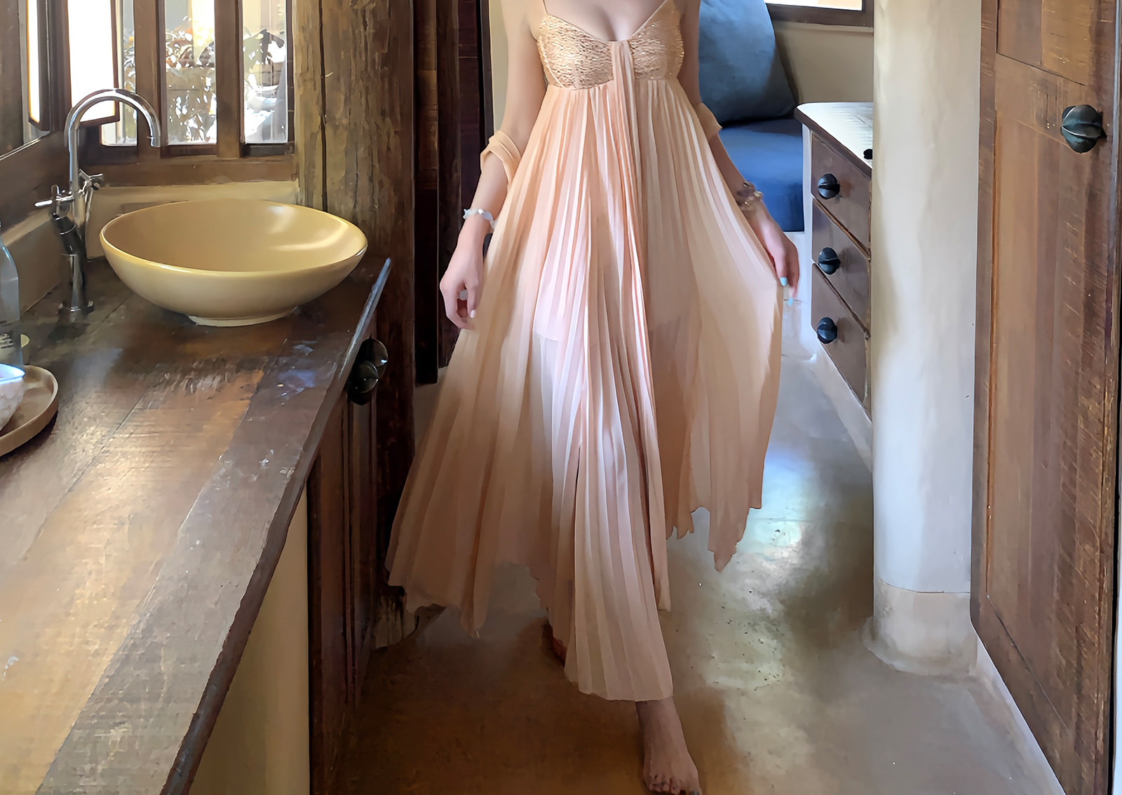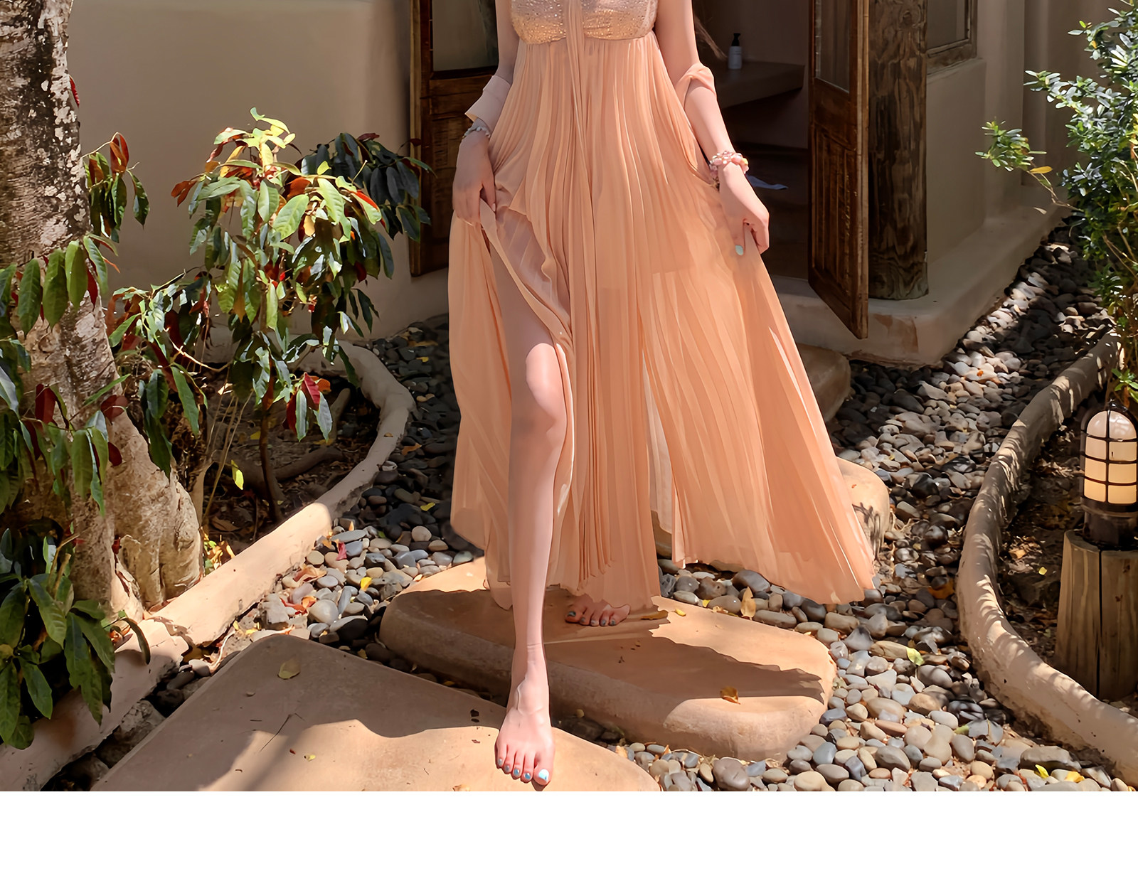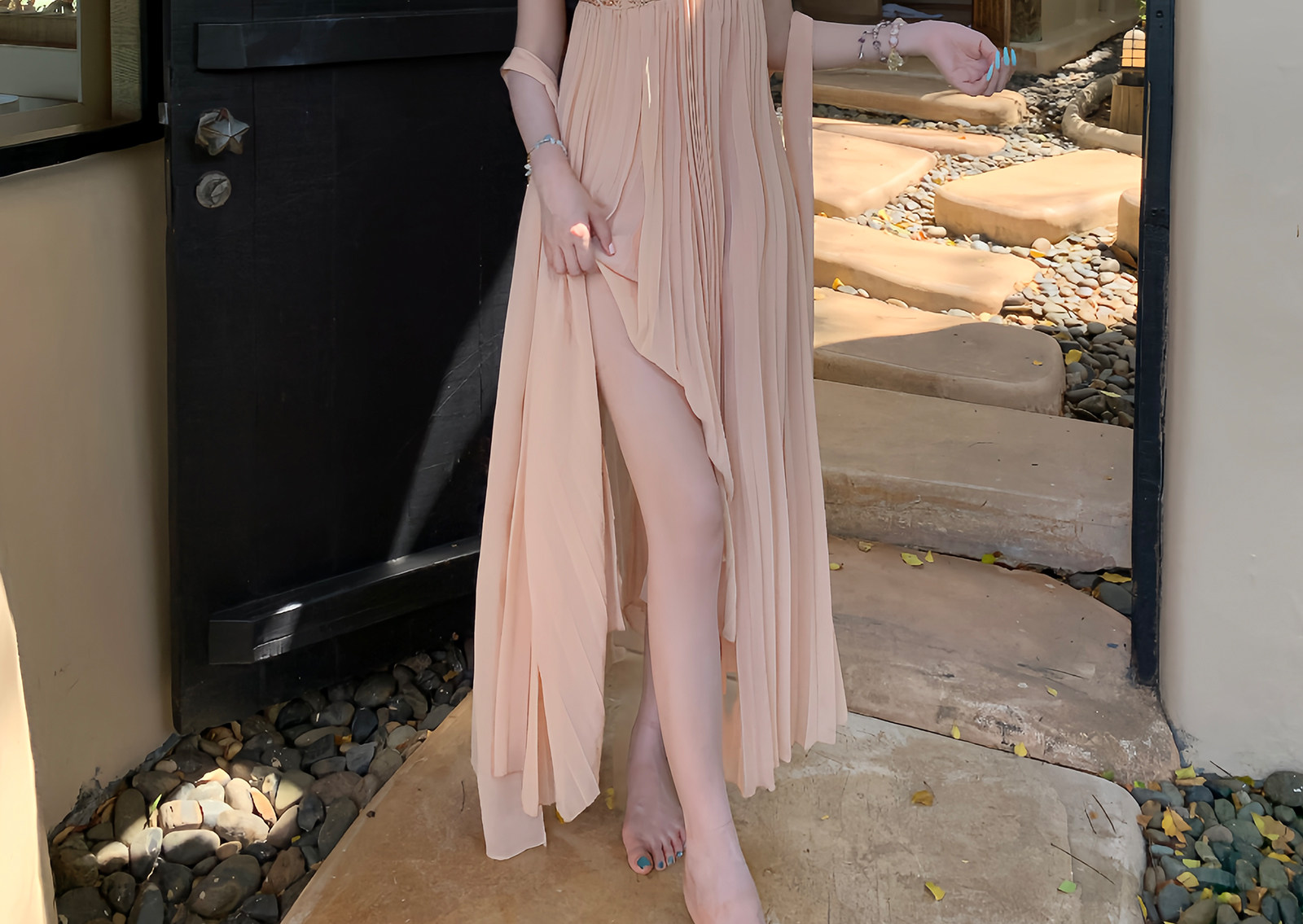 矜贵 분말 훈련 빛 럭셔리 소녀 명문 여성 바람 높음 세트 무거운 작업 백리스 허리 수축 자르기 슬림해 보이는 그라데이션 드레스