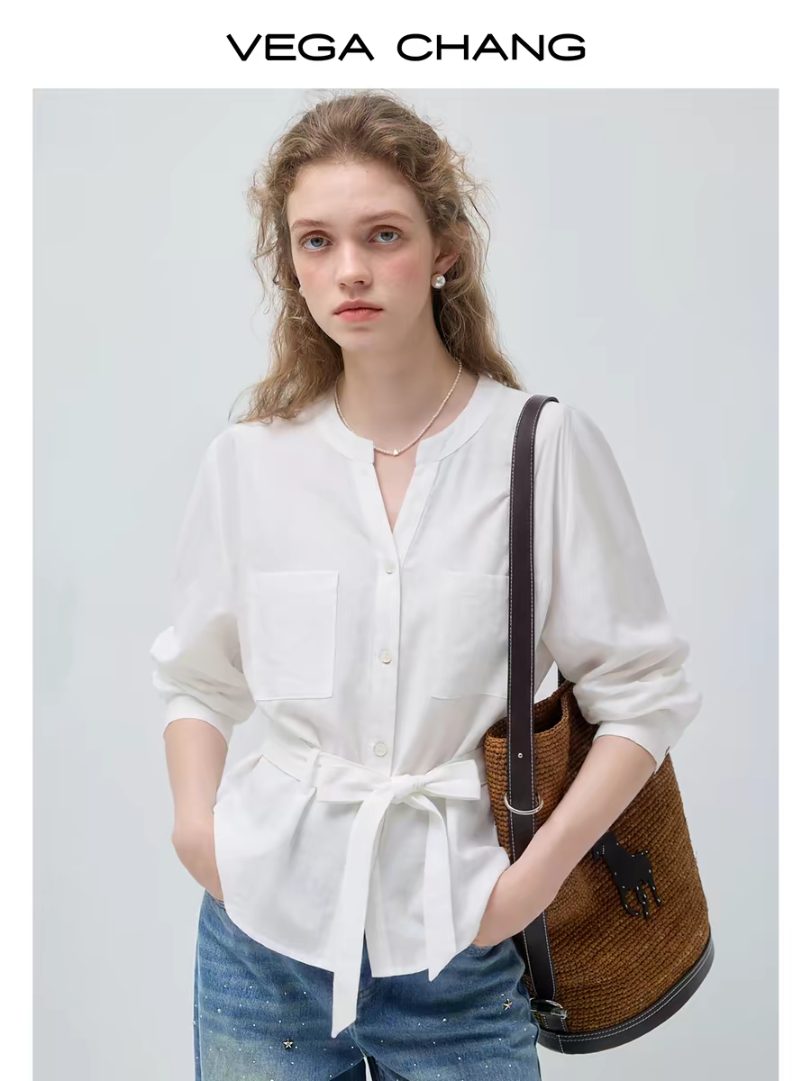 벤 그리스어 benxe 화이트 디자인 센스 긴팔 품격 도루 센스 뒤집다 접기 V넥 무거운 작업 자수 셔츠 여성 셔츠