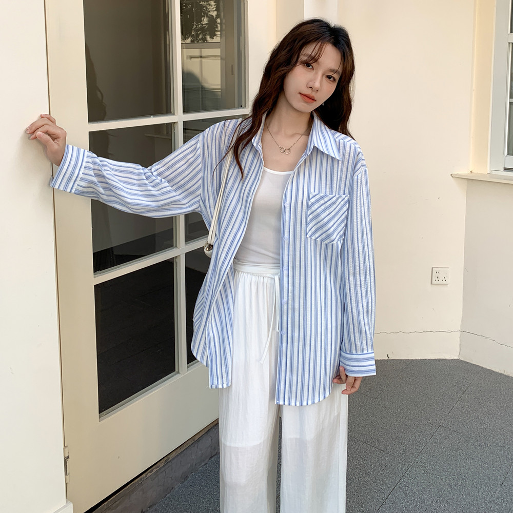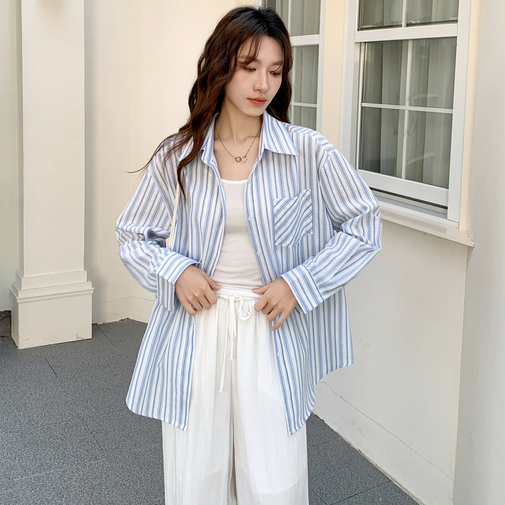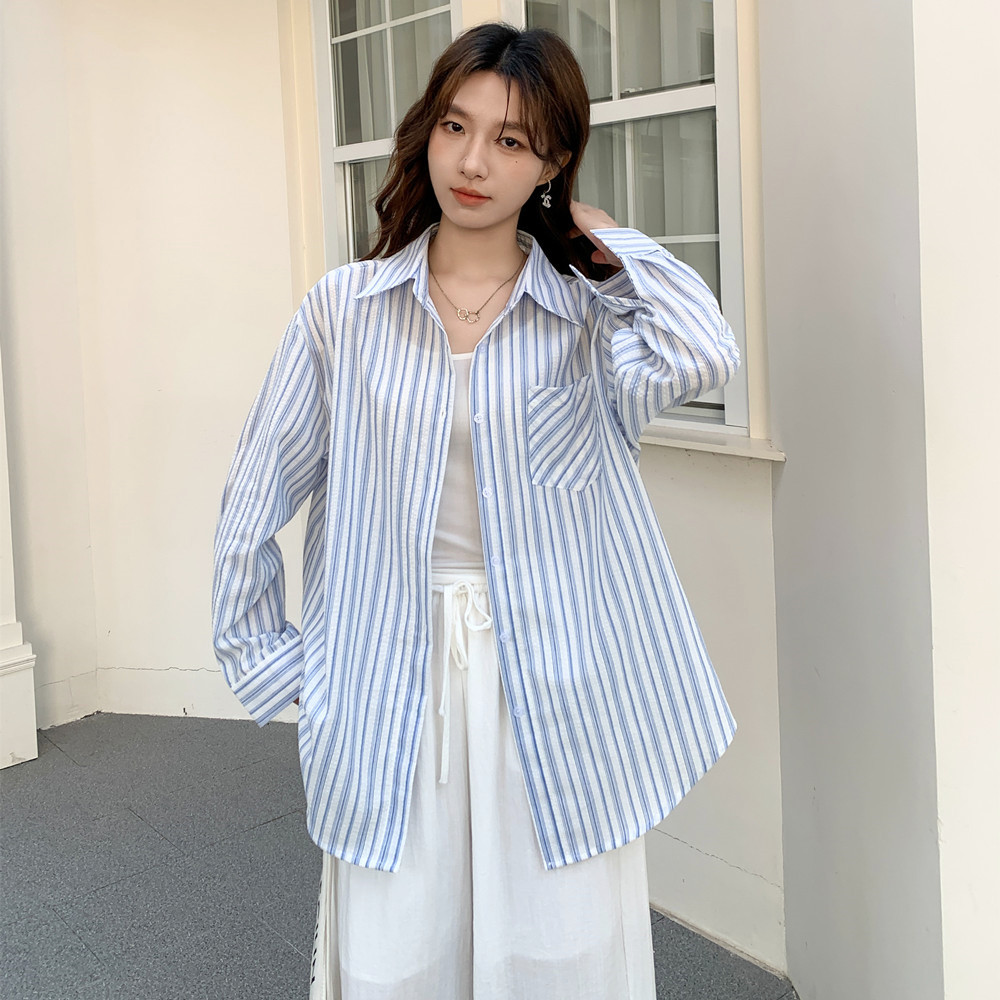 실사 스트라이프 긴팔 여성 셔츠 한 부서 루즈핏 느긋한 작은 대중 외부 가져 가라. 자외선 차단 맨위