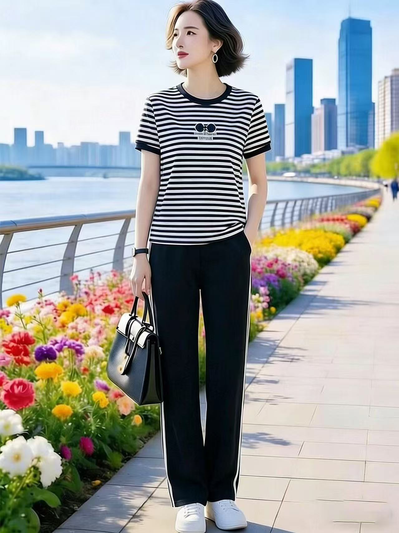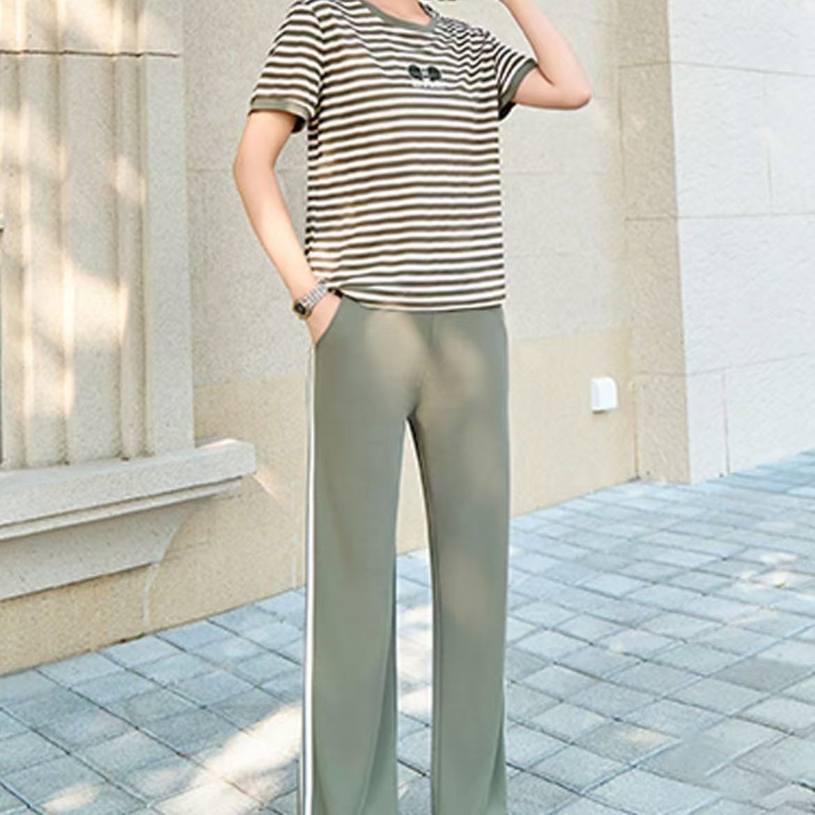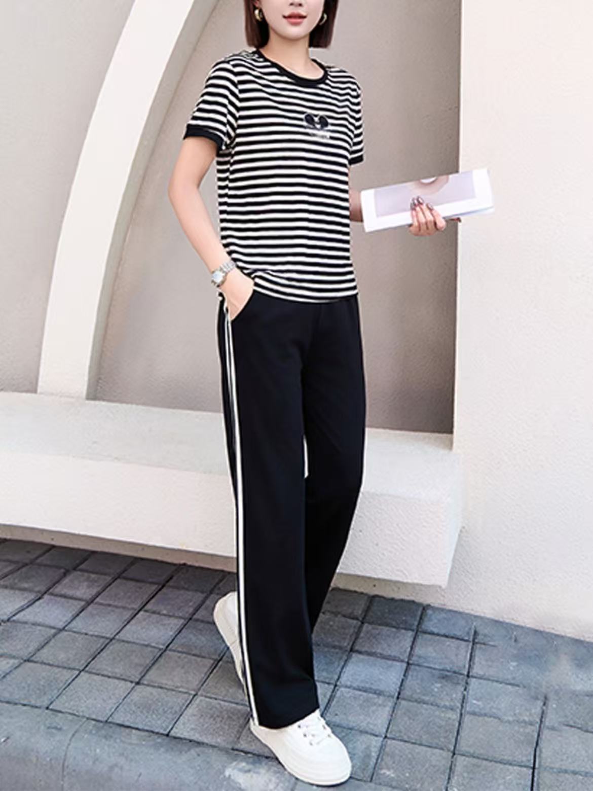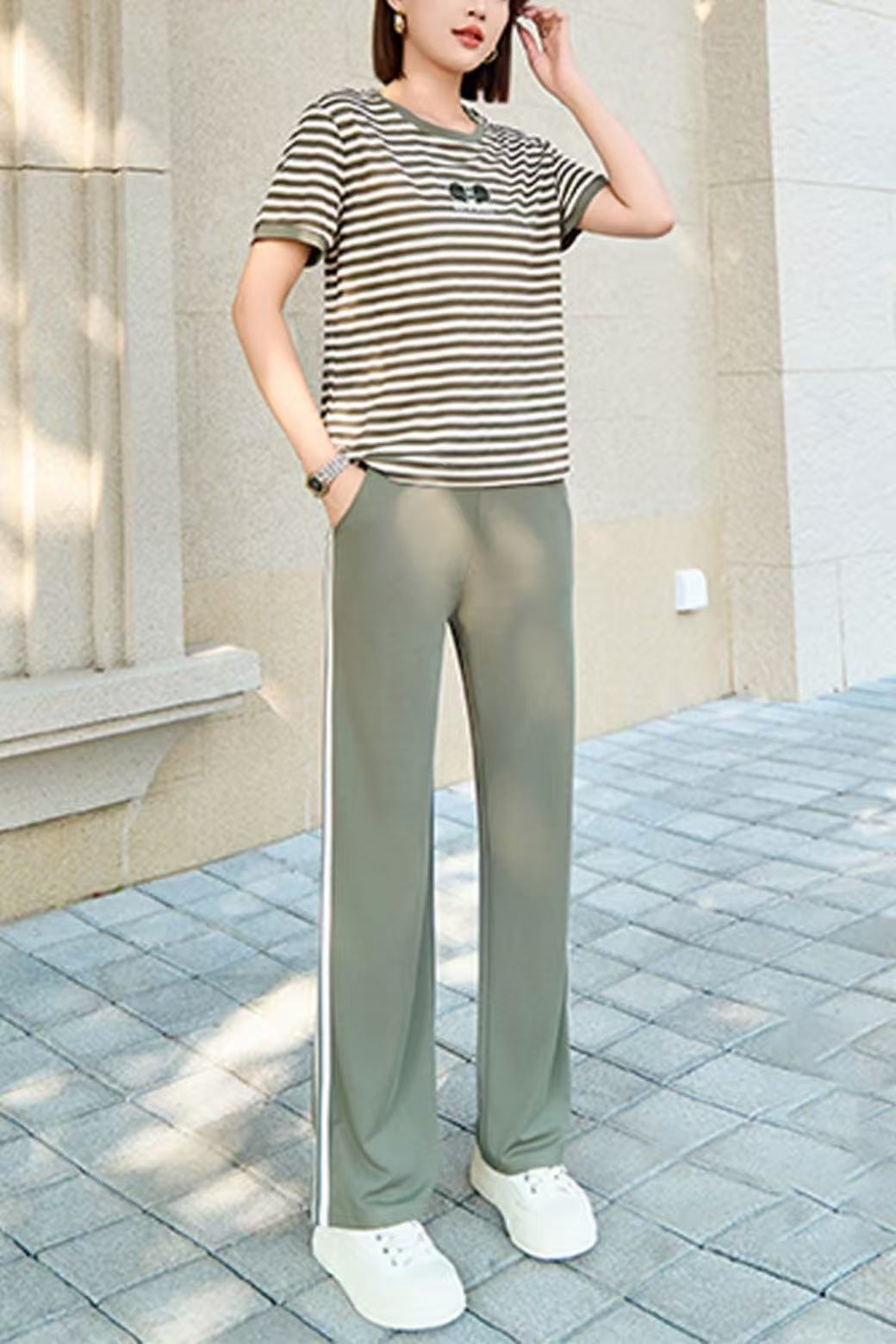 배색 니트 스웨터 허리밴드 캐주얼 바지 세트 여름 새로운