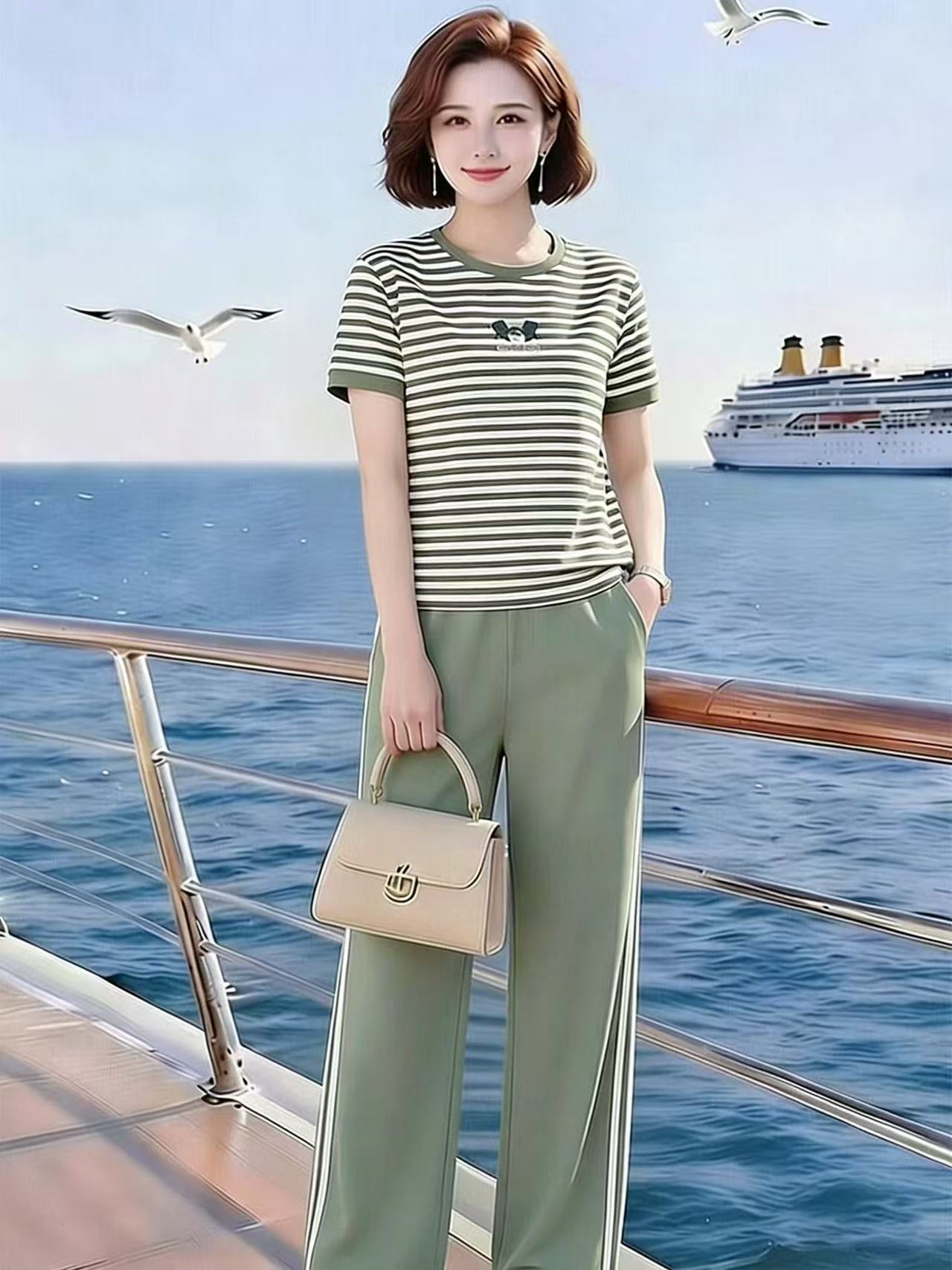 문예 스트라이프 프린트 맨위 허리밴드 루즈핏 9부 바지 세트 여름