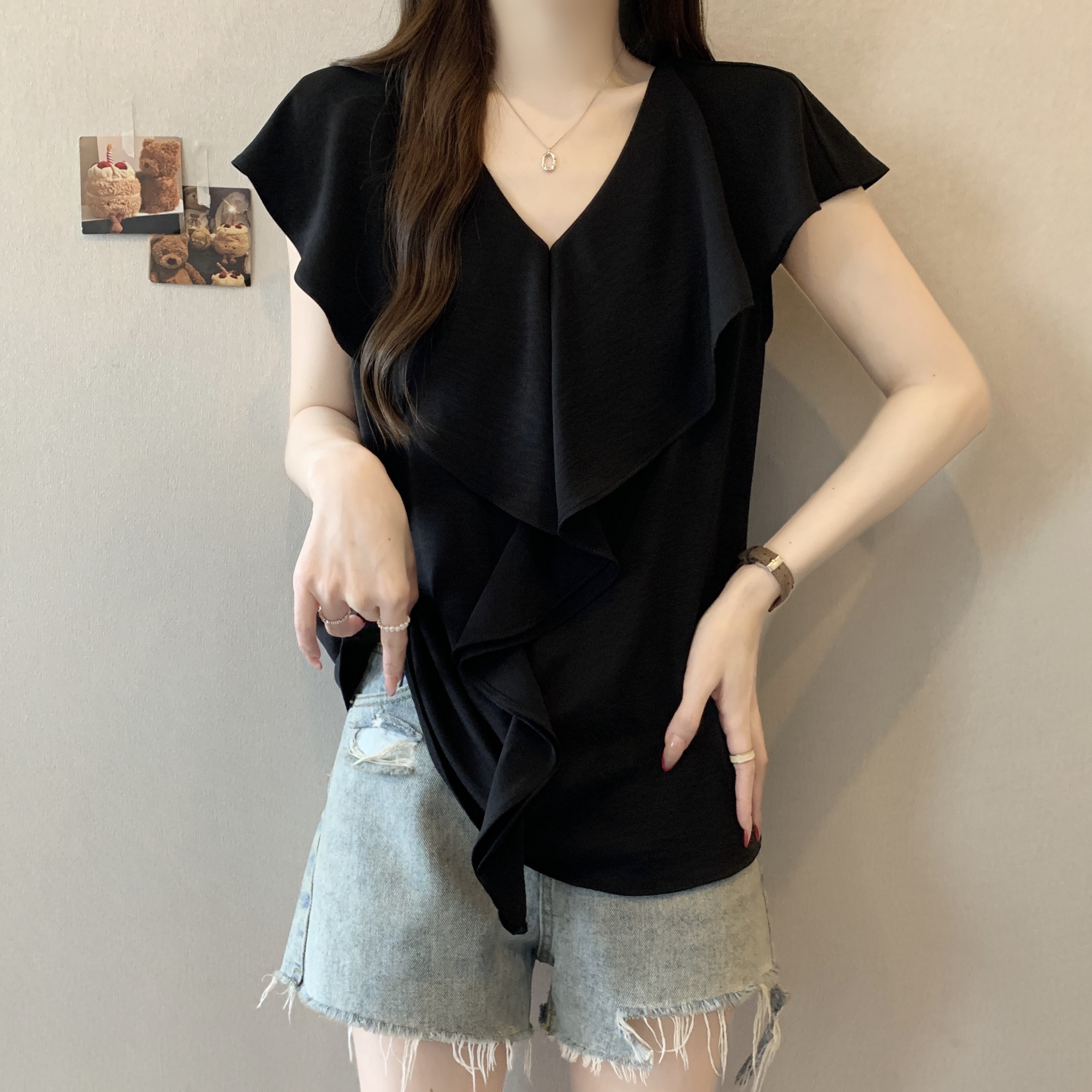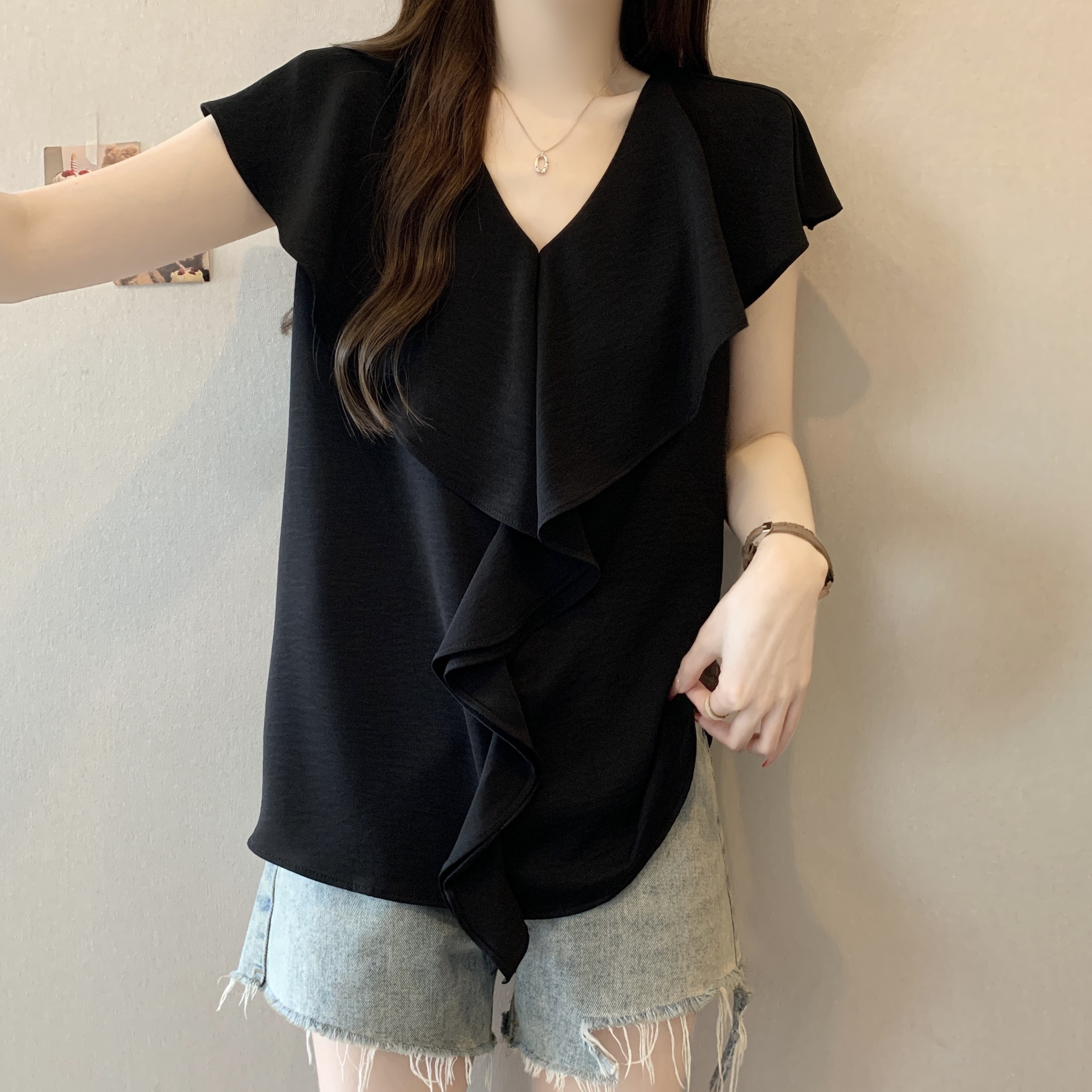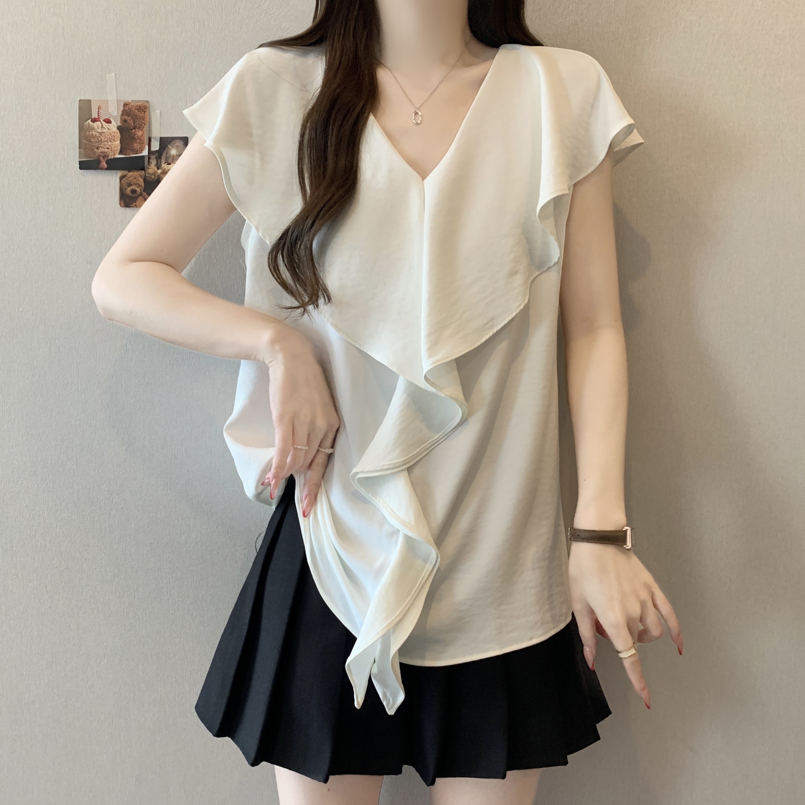 실사 2809# 마이크로 지방 mm 새틴 광택 비싼 가스 V넥 프릴 반팔 셔츠 Feifei 소매 슬림해 보이는 맨위