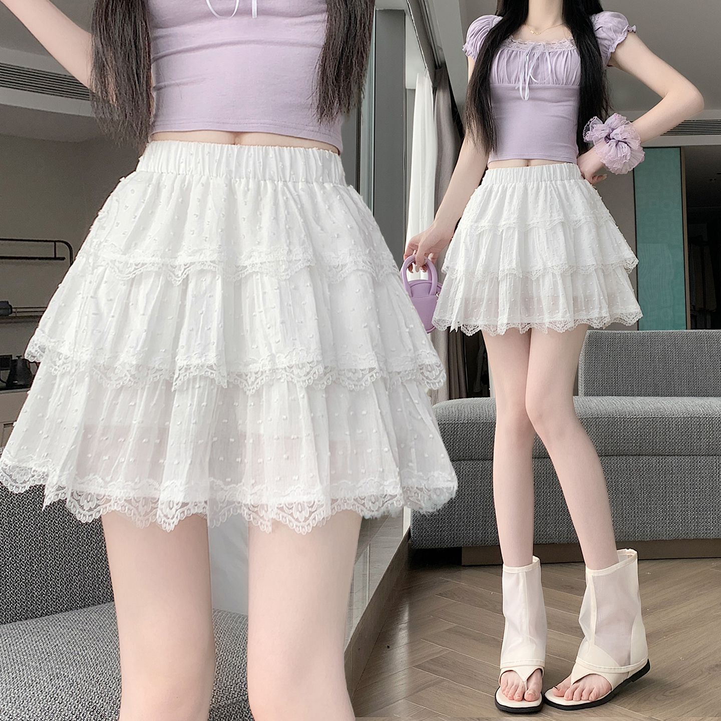 실사 2026 여름 한 부서 달콤함 화이트 레이스 레이스 패치워크 퍼프 노출 방지 반신 한 마디 케이크 미니 스커트