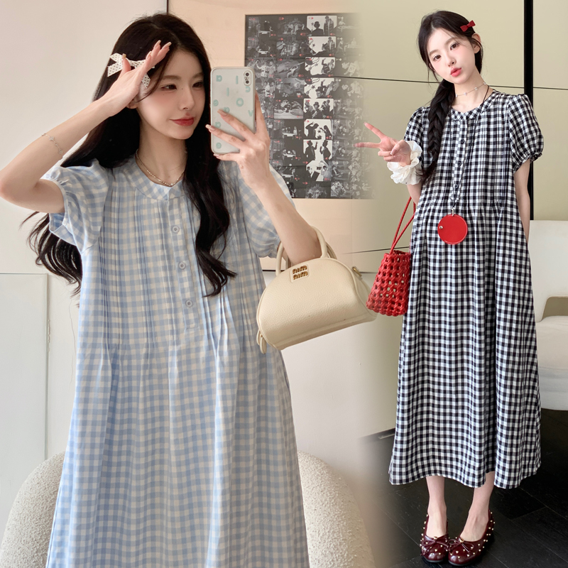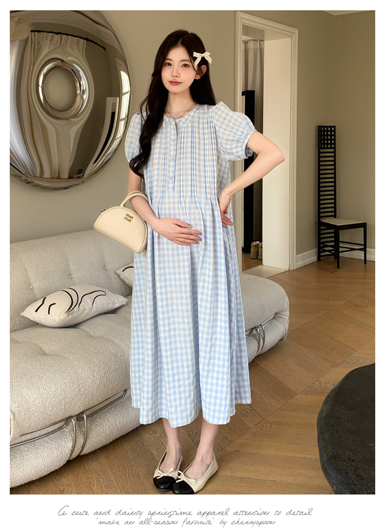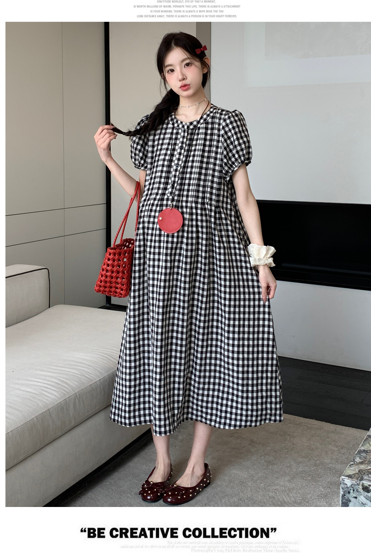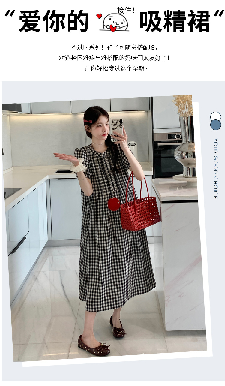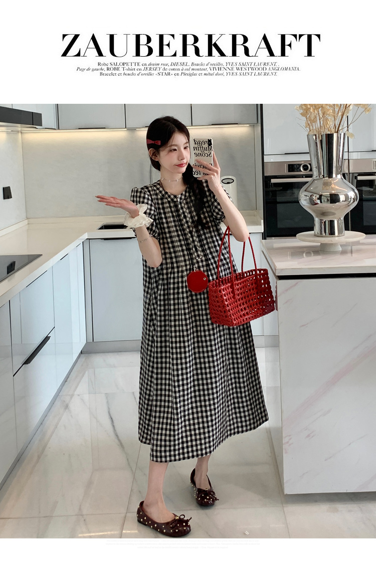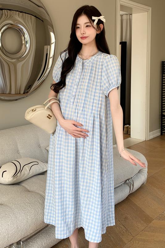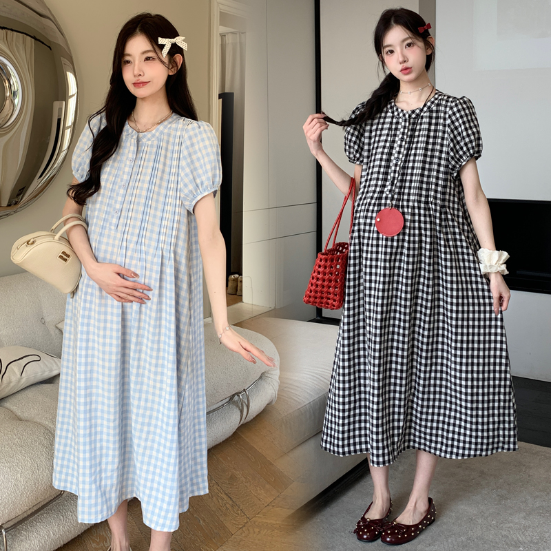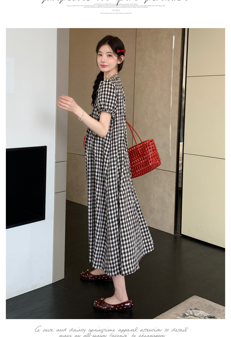 실사 지금 지금 2026 여름 새로운 임신 엄마 거품 소매 프랑스식 레트로 체크무늬 드레스 미니멀리즘 가슴 수신 Pleat