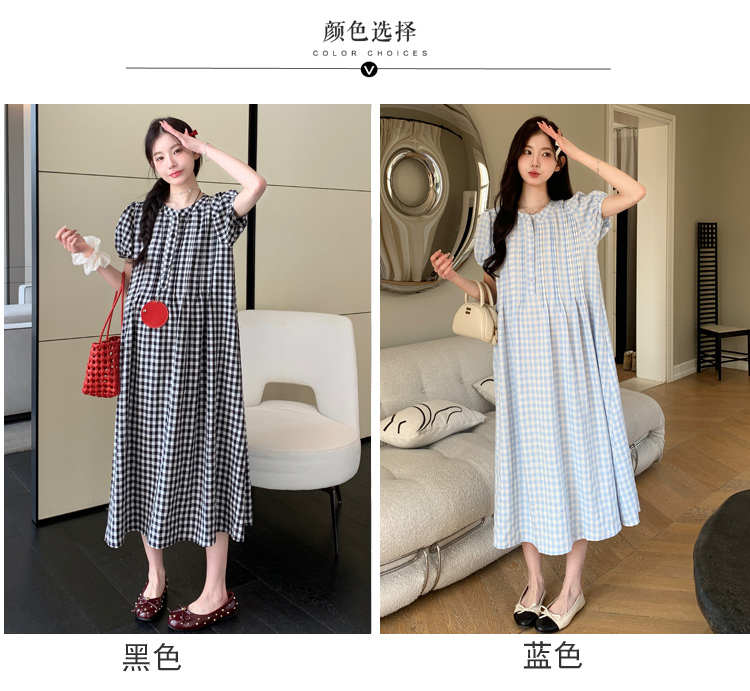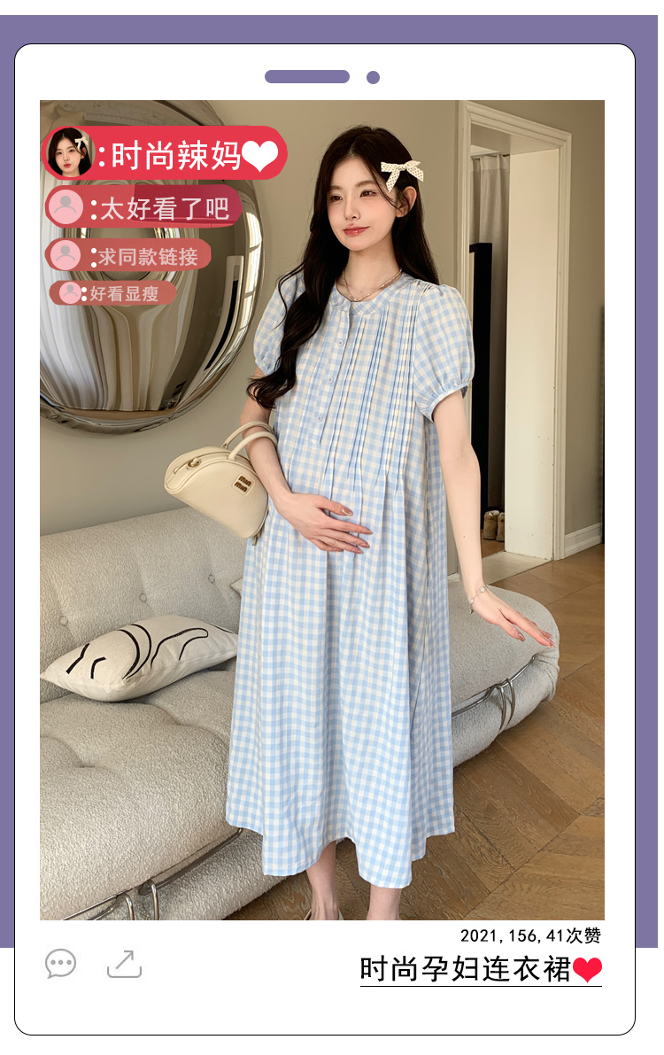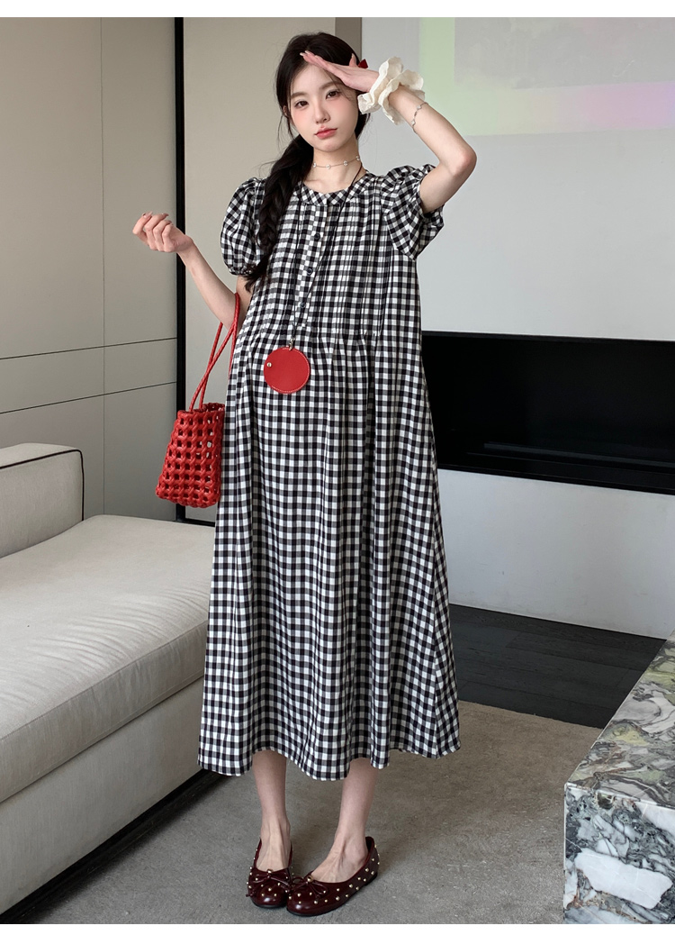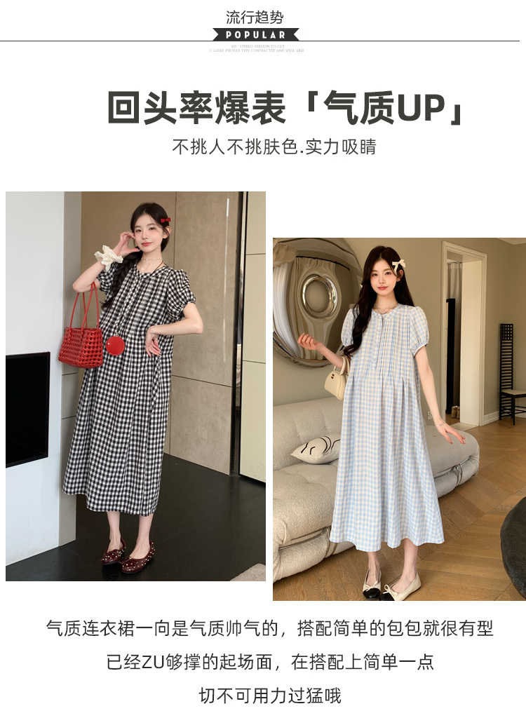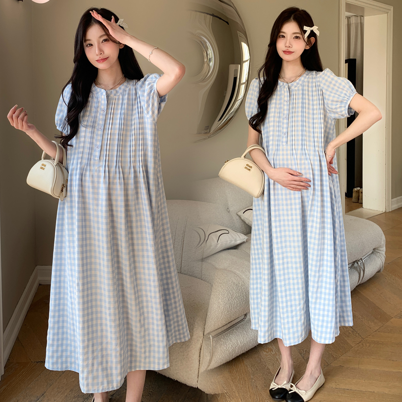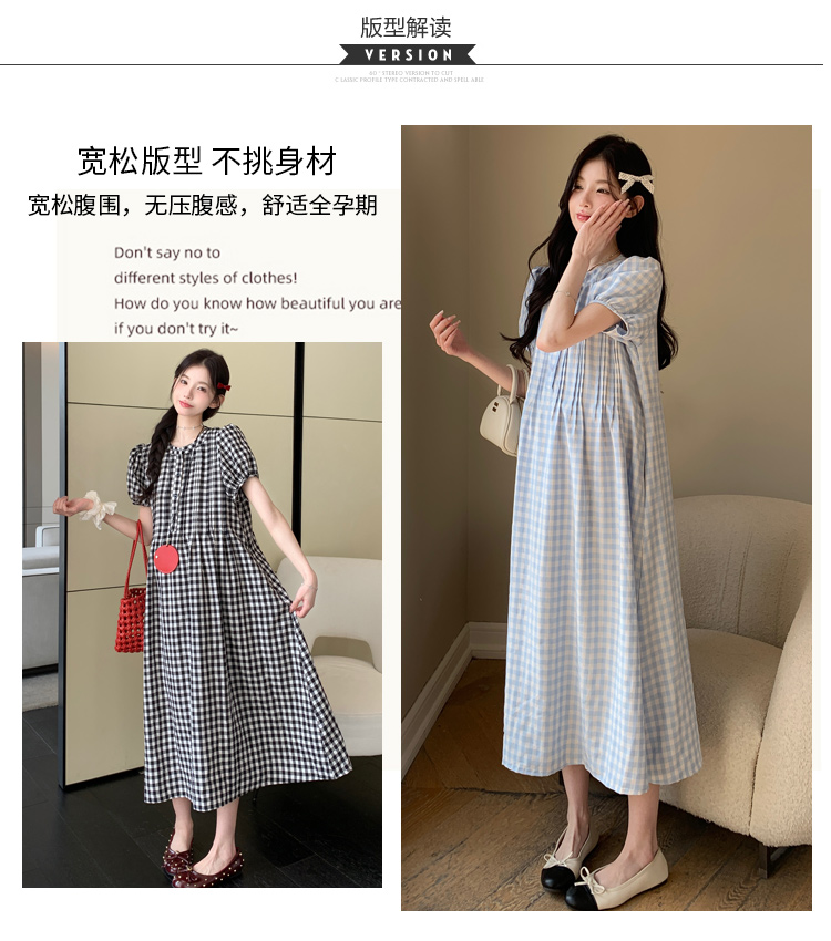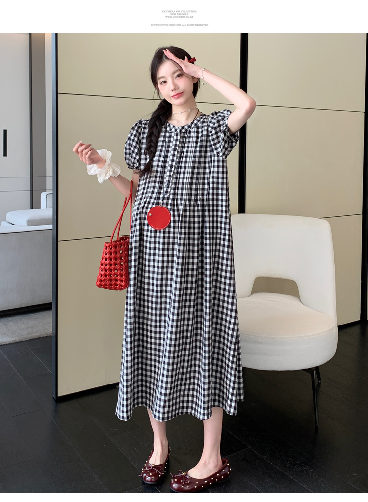 실사 지금 지금 2026 여름 새로운 임신 엄마 거품 소매 프랑스식 레트로 체크무늬 드레스 미니멀리즘 가슴 수신 Pleat