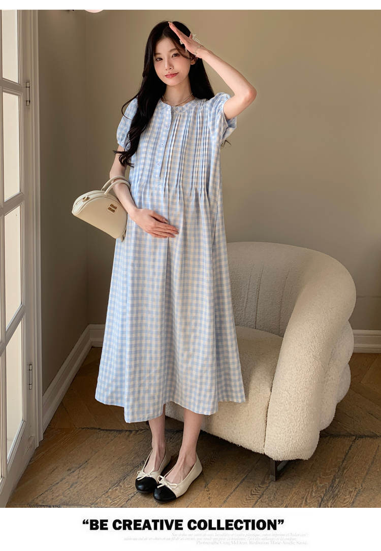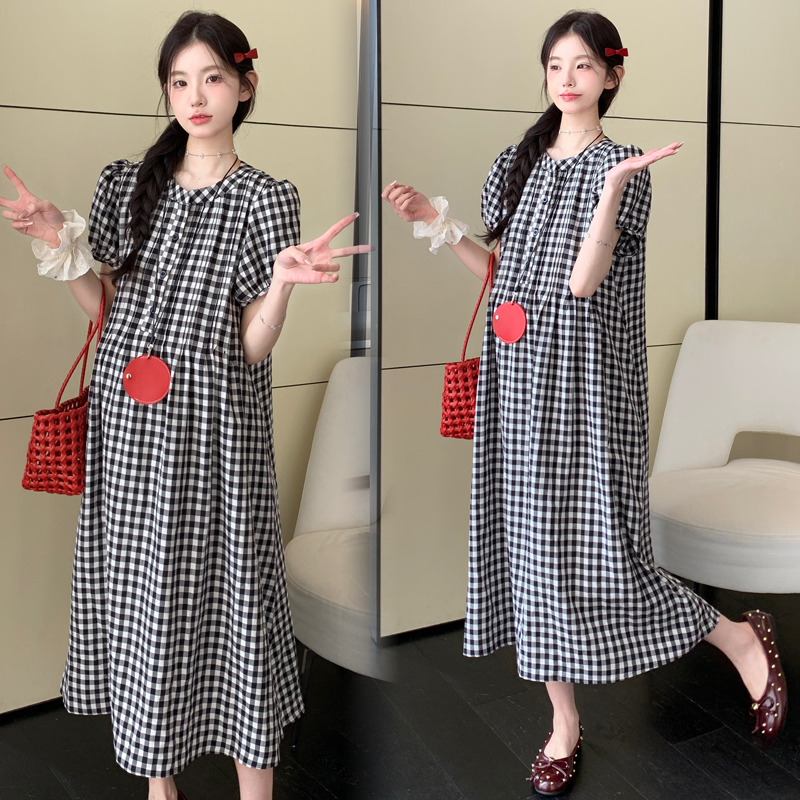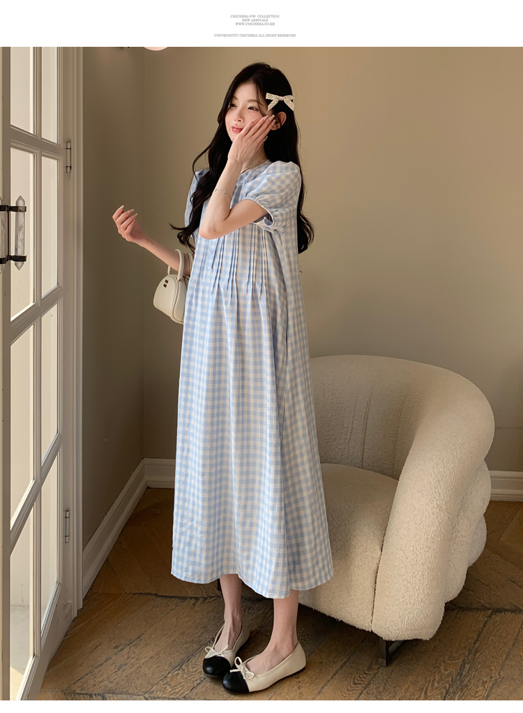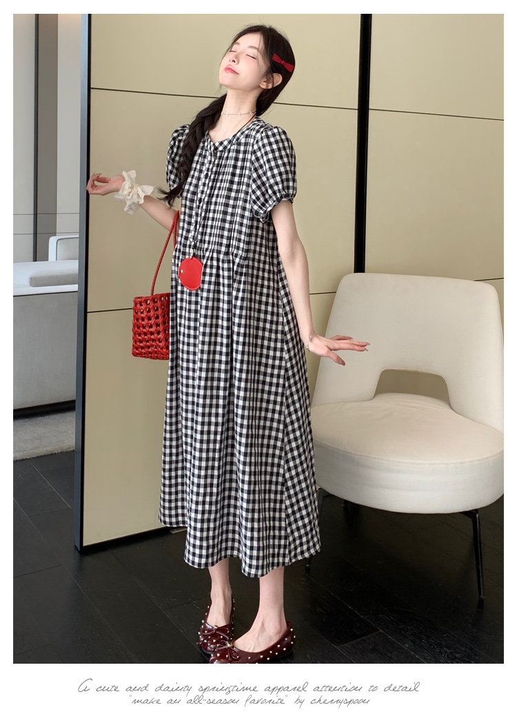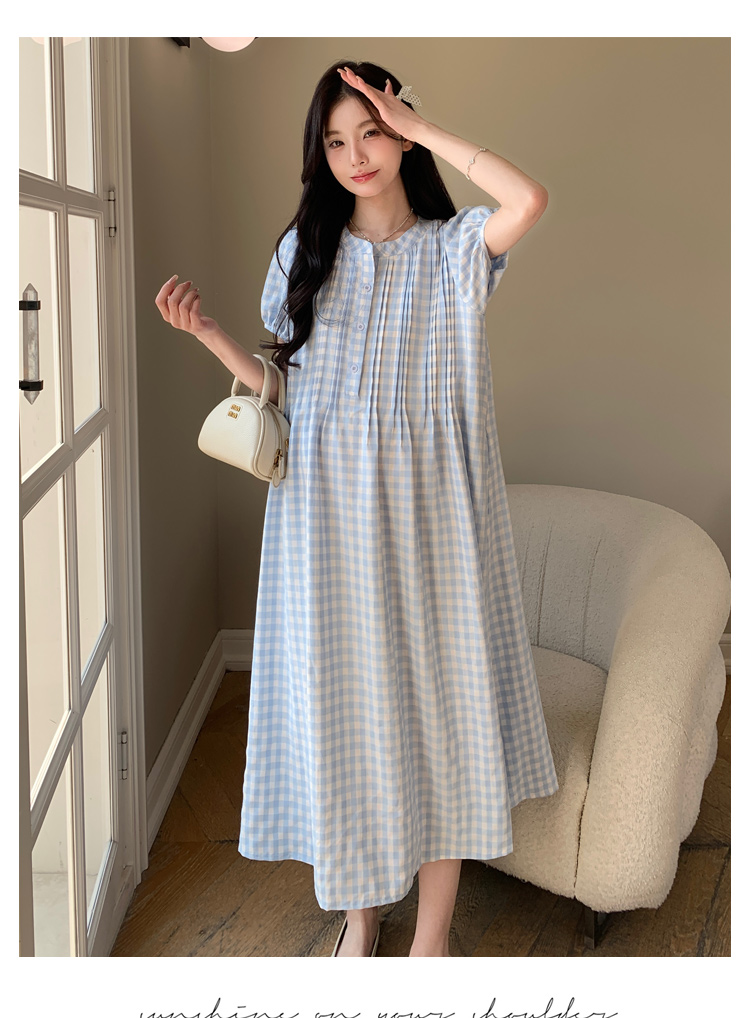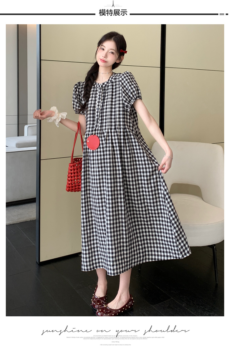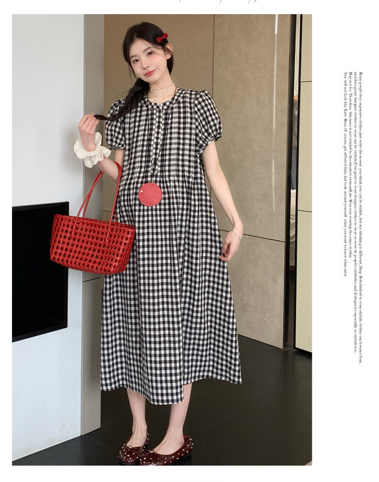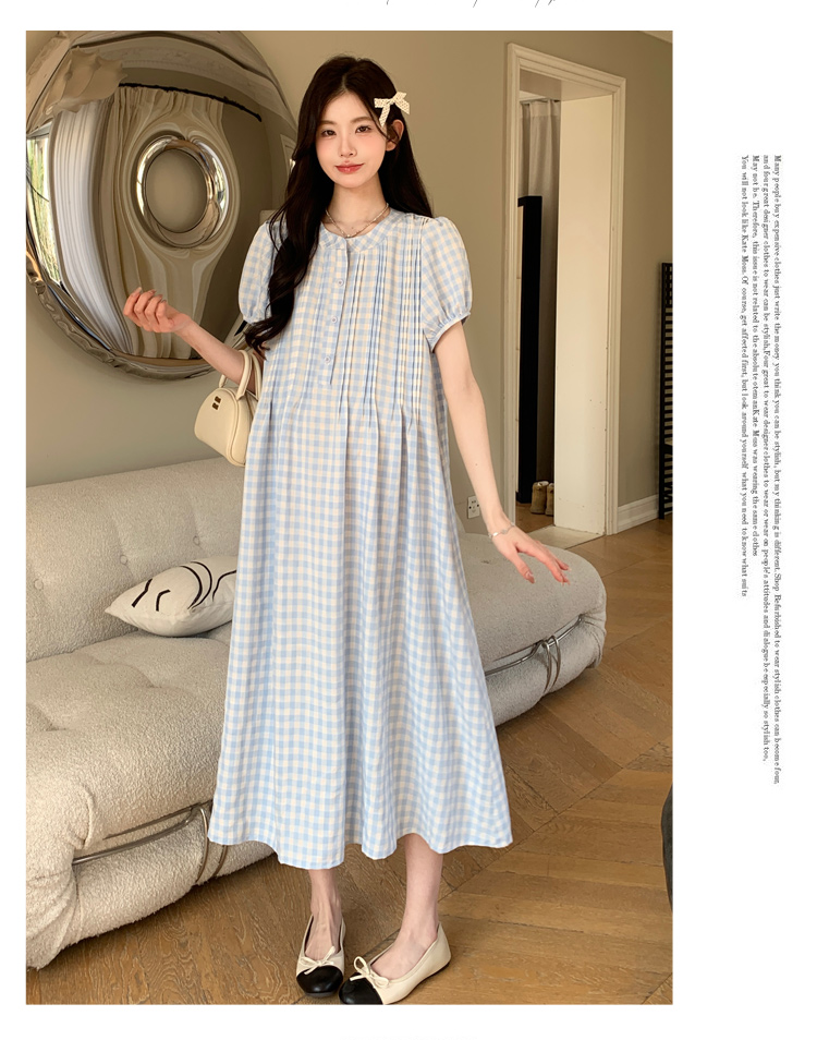 실사 지금 지금 2026 여름 새로운 임신 엄마 거품 소매 프랑스식 레트로 체크무늬 드레스 미니멀리즘 가슴 수신 Pleat