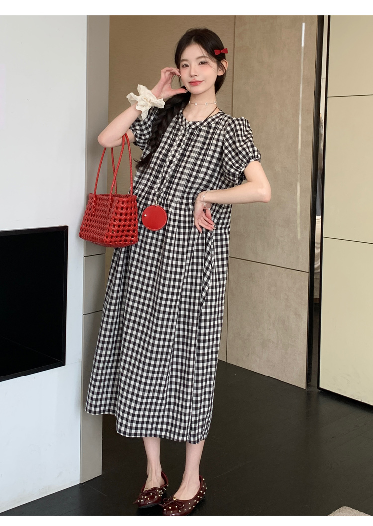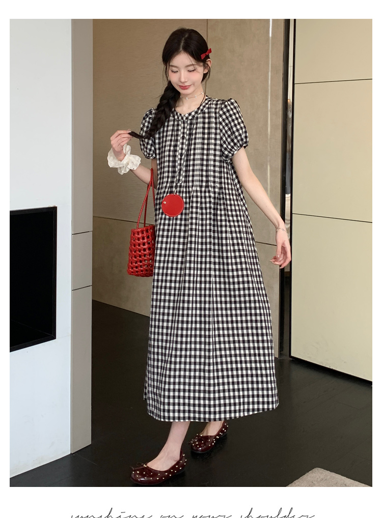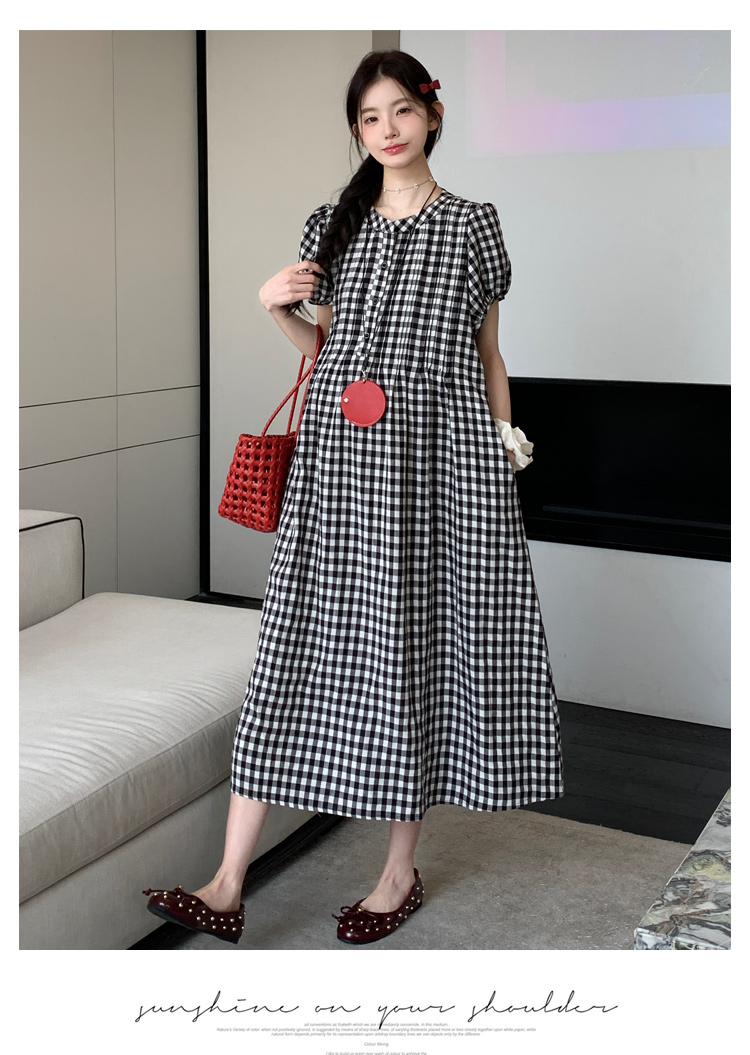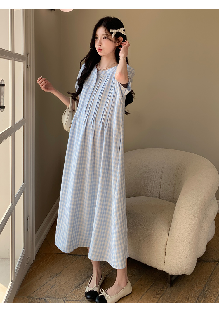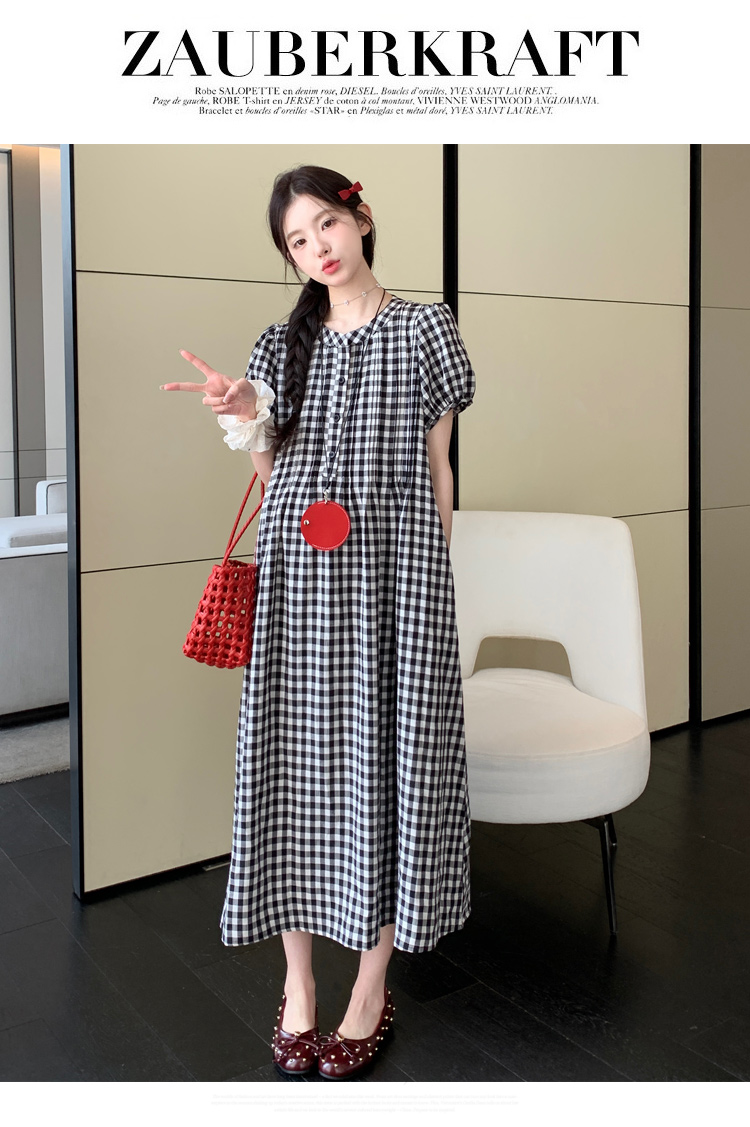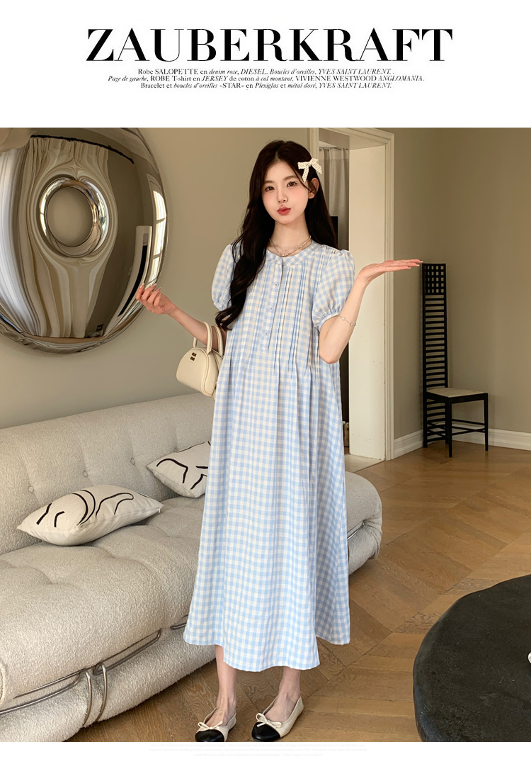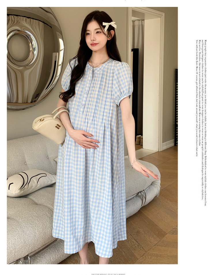 실사 지금 지금 2026 여름 새로운 임신 엄마 거품 소매 프랑스식 레트로 체크무늬 드레스 미니멀리즘 가슴 수신 Pleat