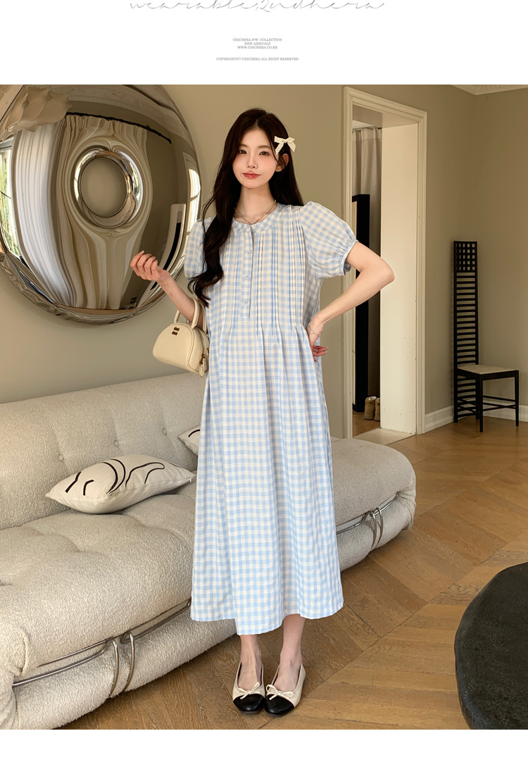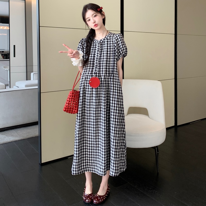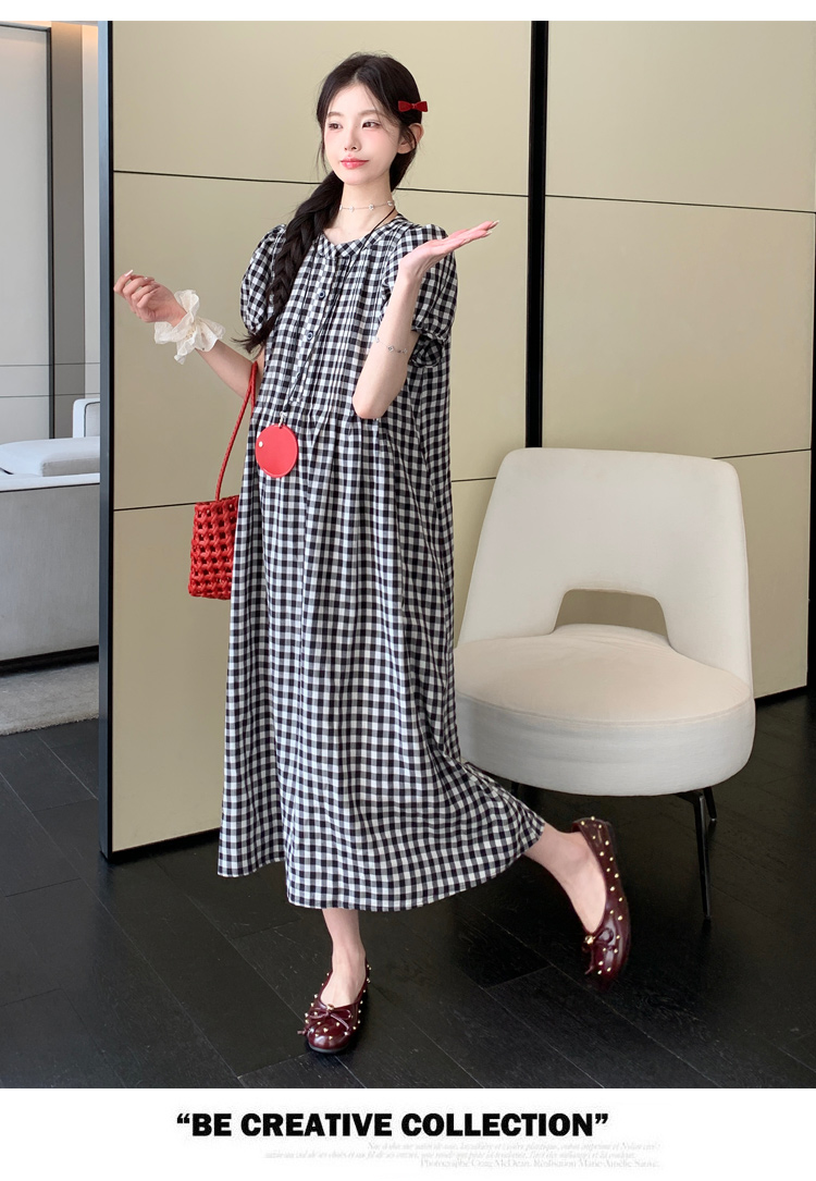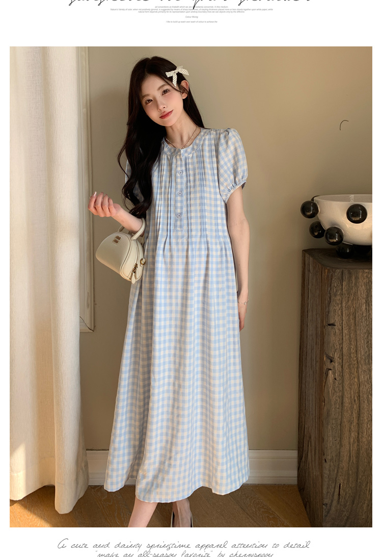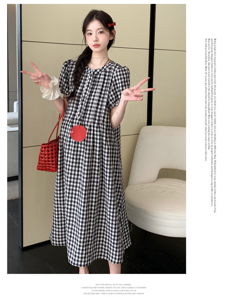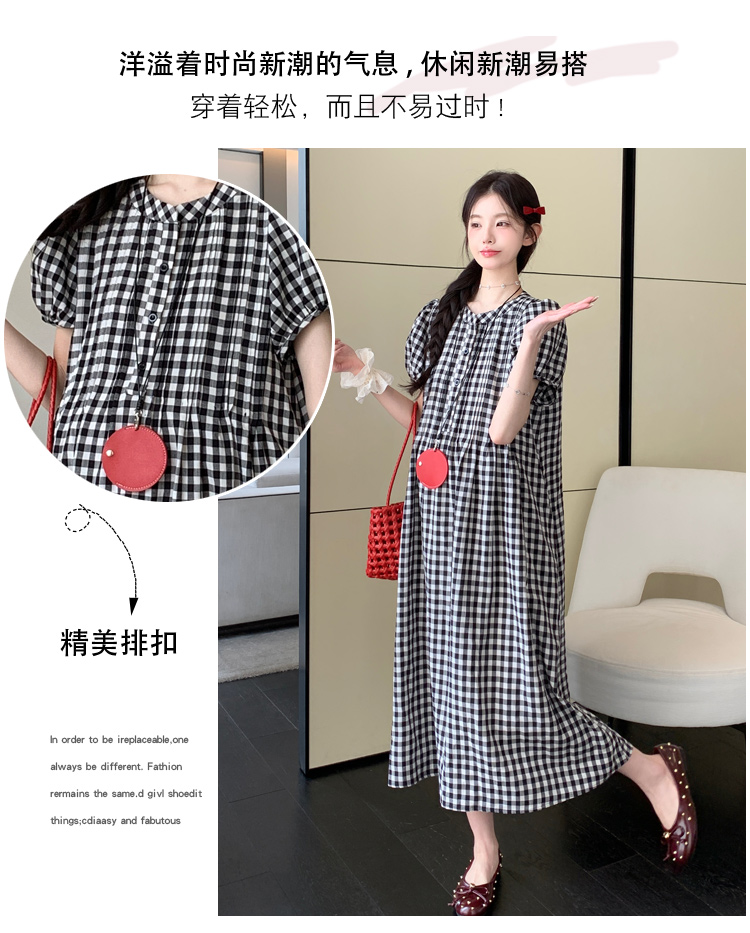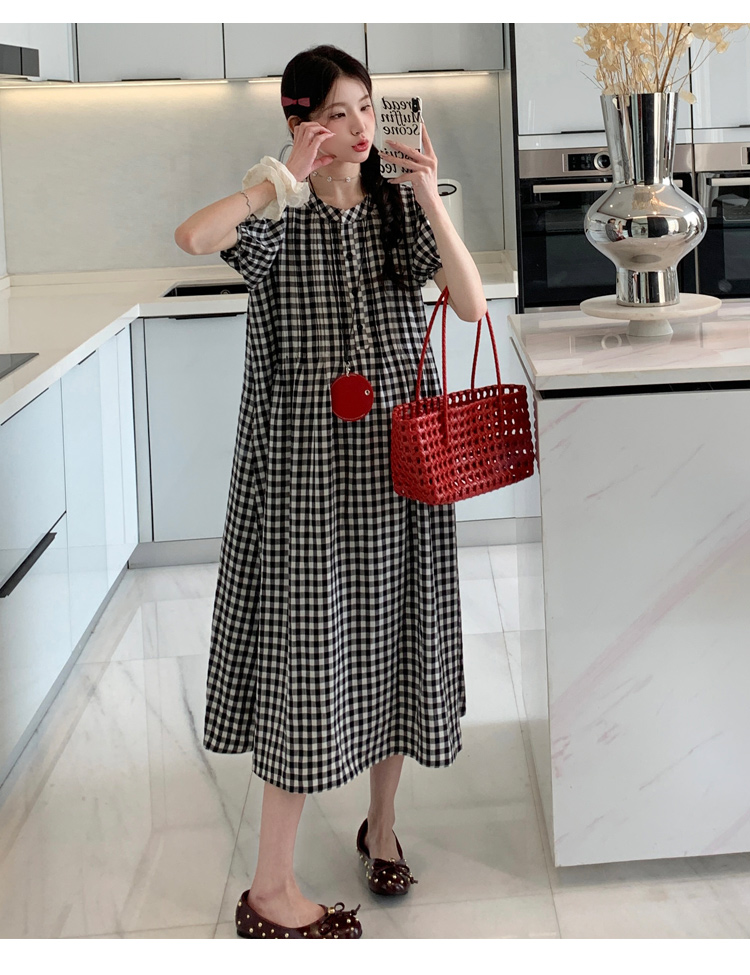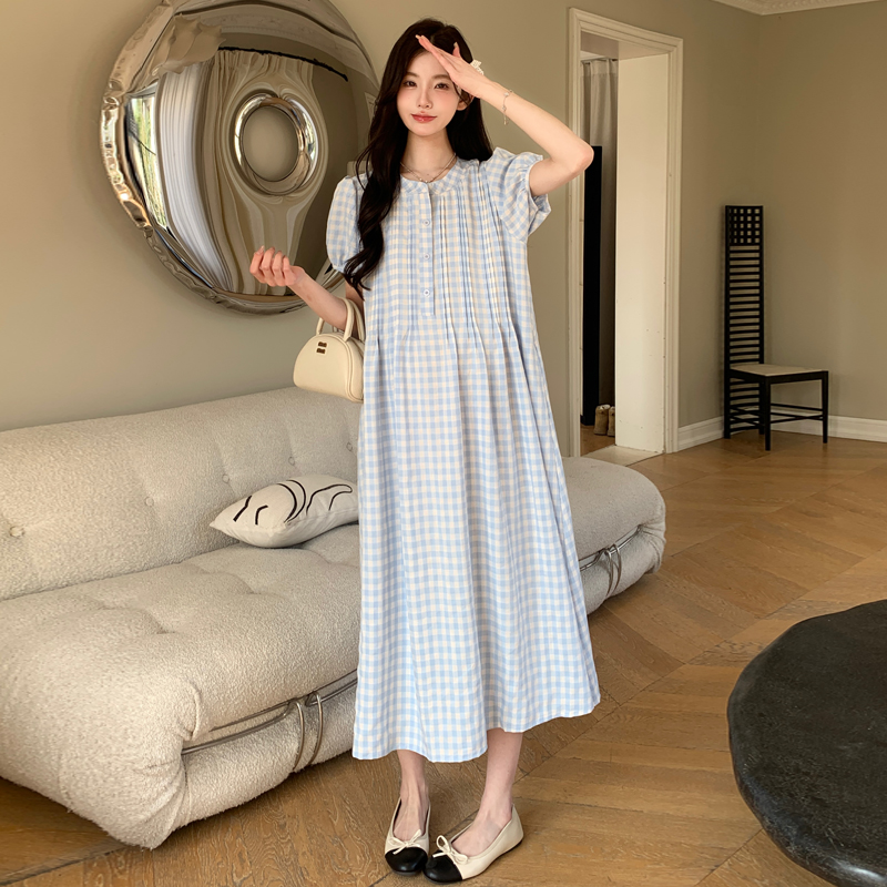 실사 지금 지금 2026 여름 새로운 임신 엄마 거품 소매 프랑스식 레트로 체크무늬 드레스 미니멀리즘 가슴 수신 Pleat
