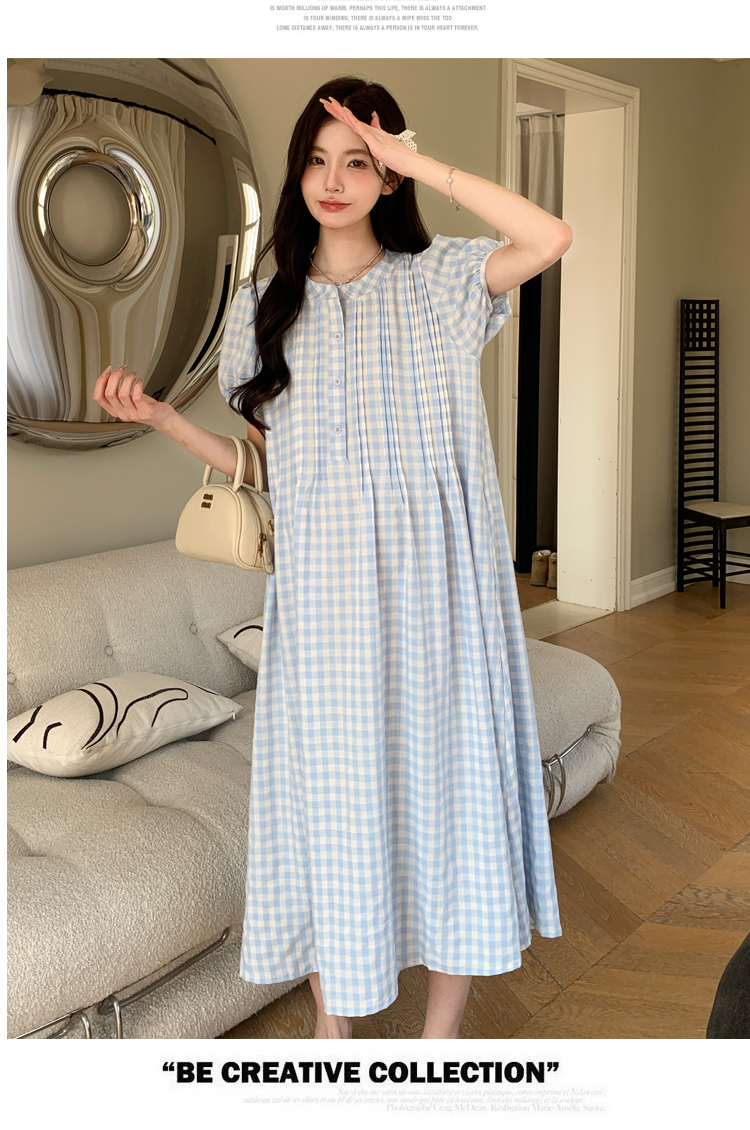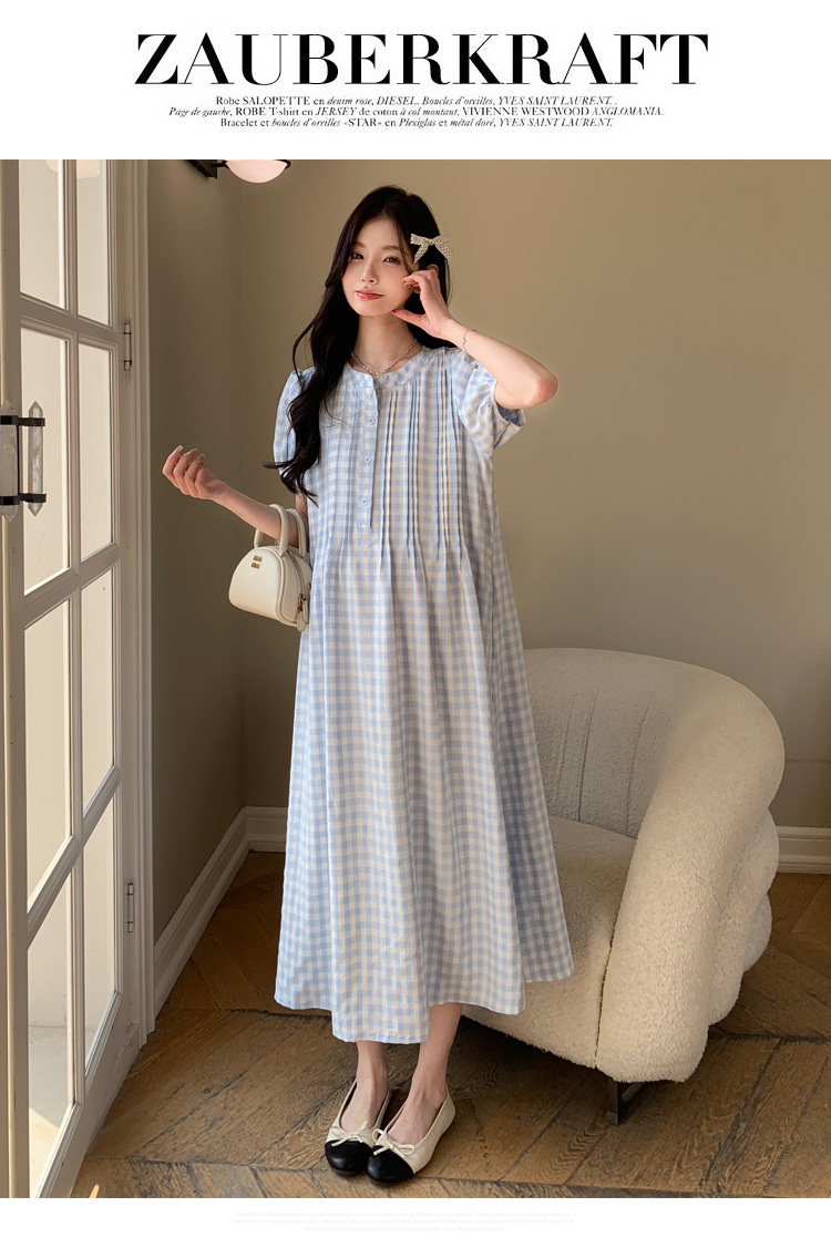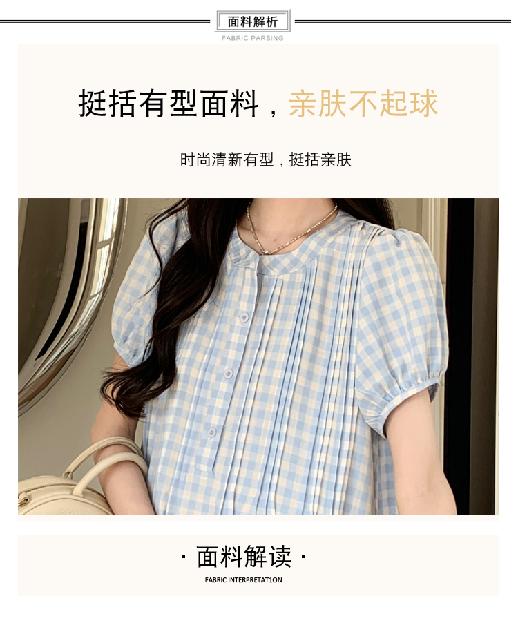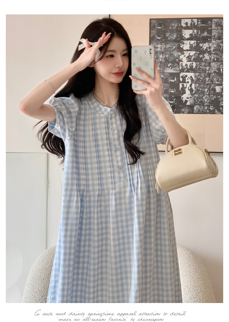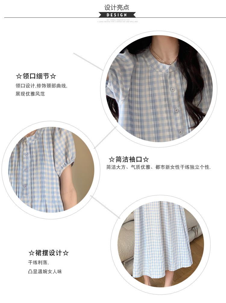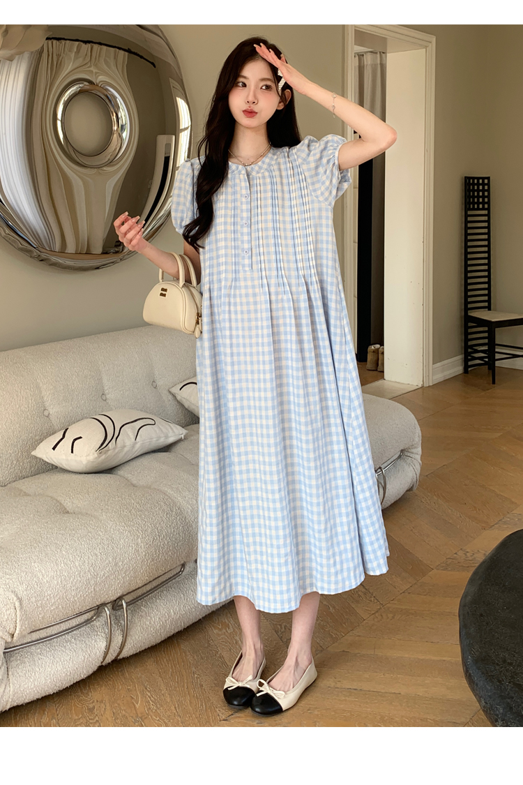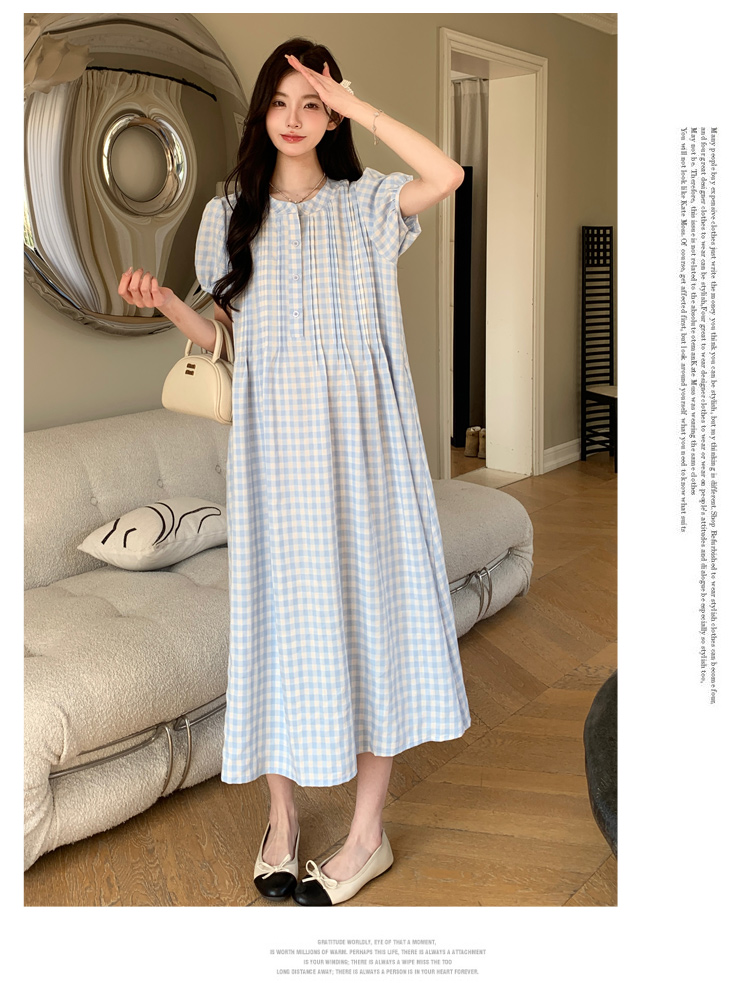 실사 지금 지금 2026 여름 새로운 임신 엄마 거품 소매 프랑스식 레트로 체크무늬 드레스 미니멀리즘 가슴 수신 Pleat