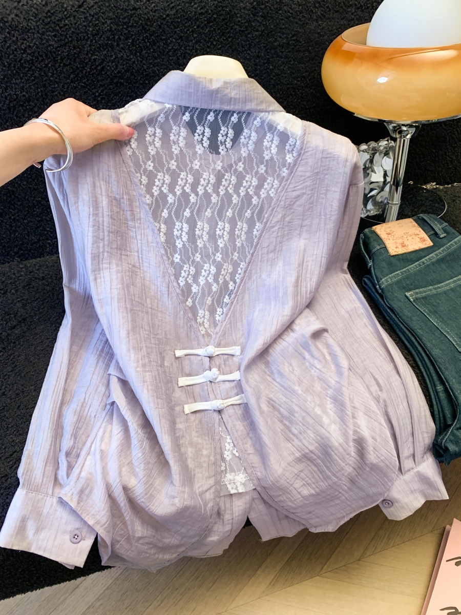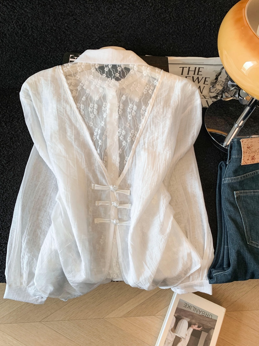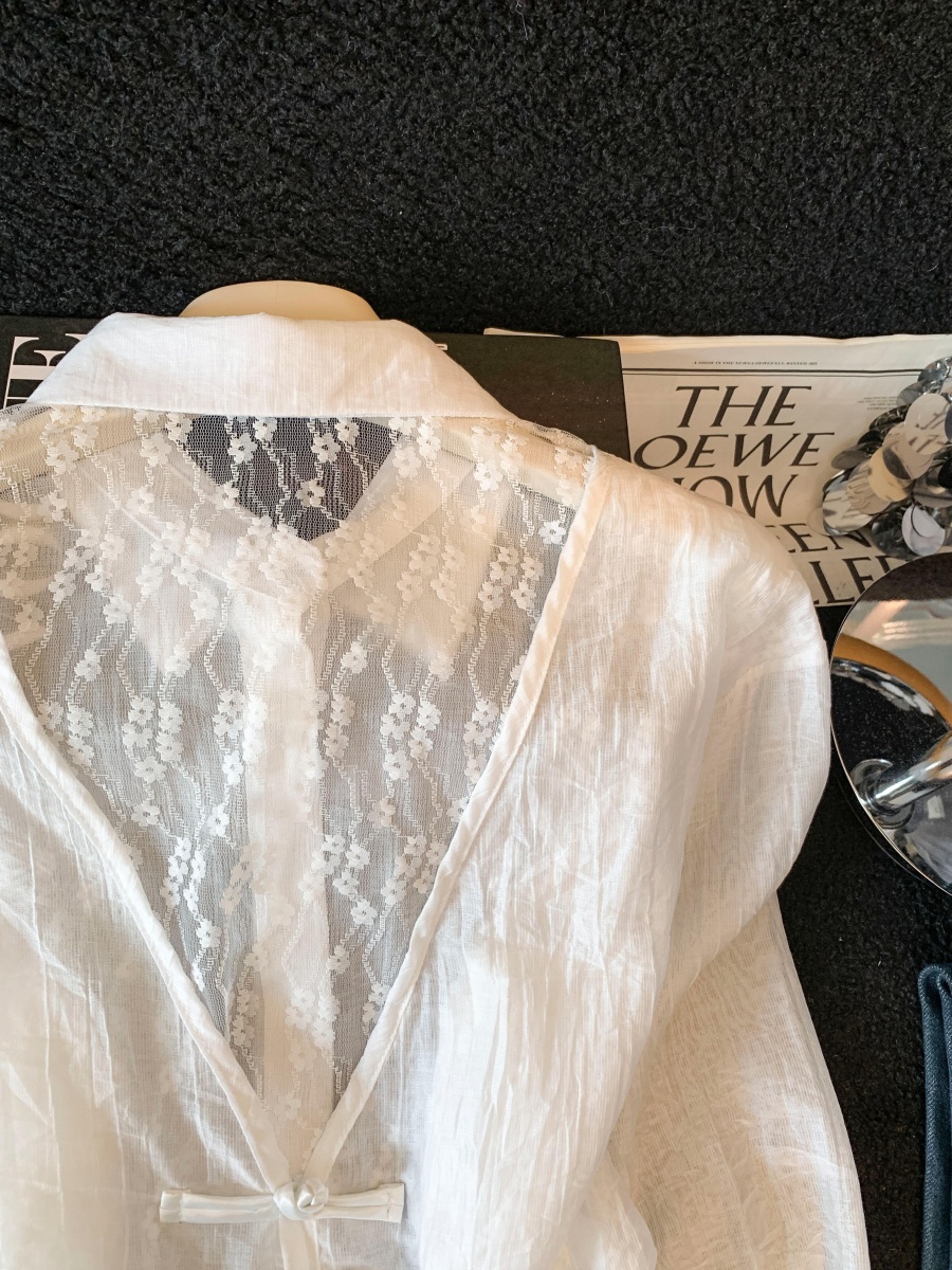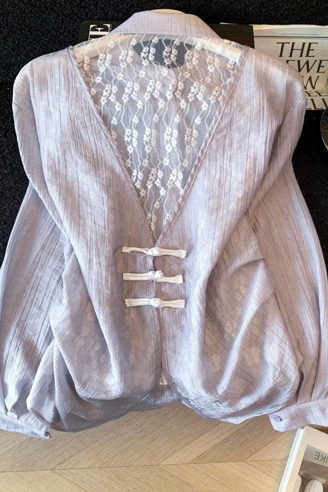 여름 새로운 레이스 조각 폴로 칼라 긴팔 여성 셔츠 디자인 센스 외부 가져 가라. 자외선 차단 의류 오픈 가디건