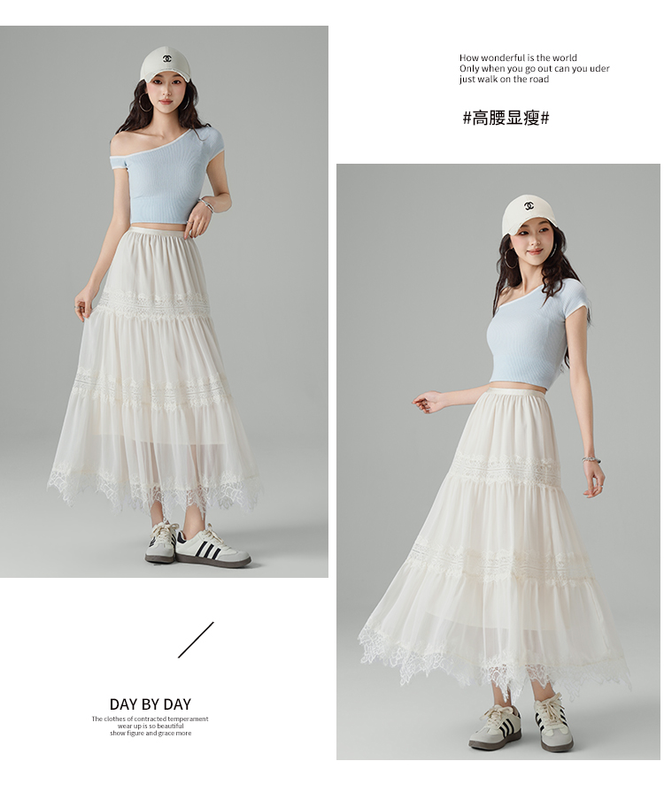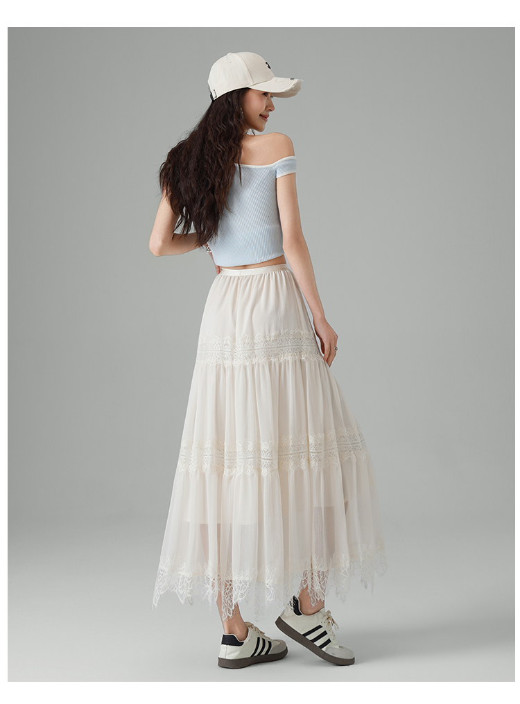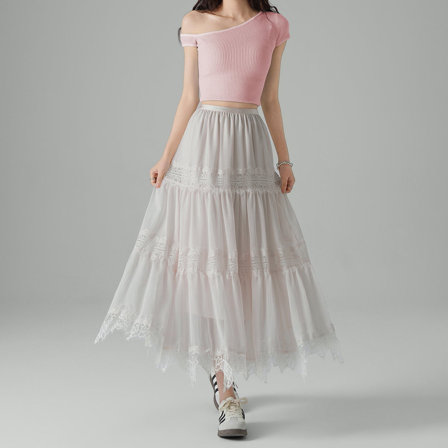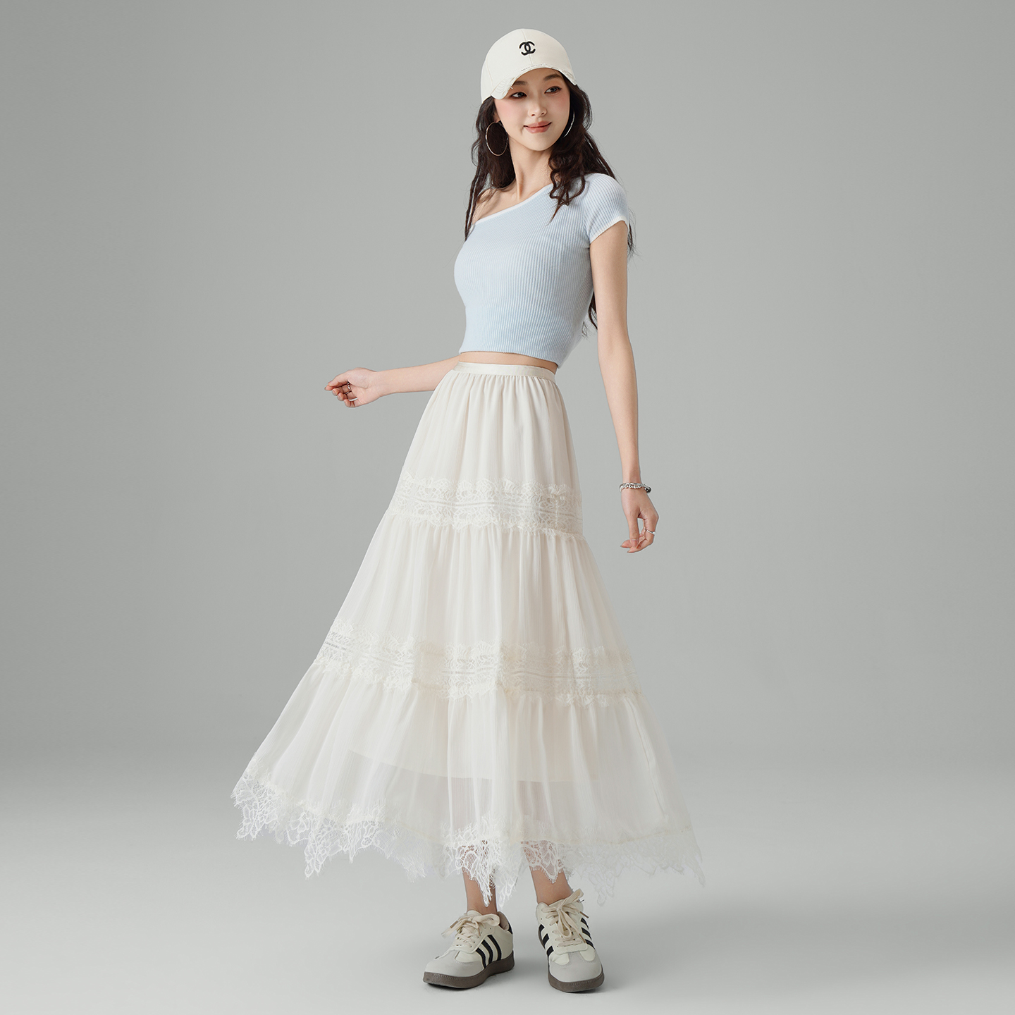 여름 새로운 화이트 반신 스커트 여성 부드러운 바람 품격 망사 철자 레이스 하이웨이스트 도루 센스 한 마디 큰 진자 우산 치마
