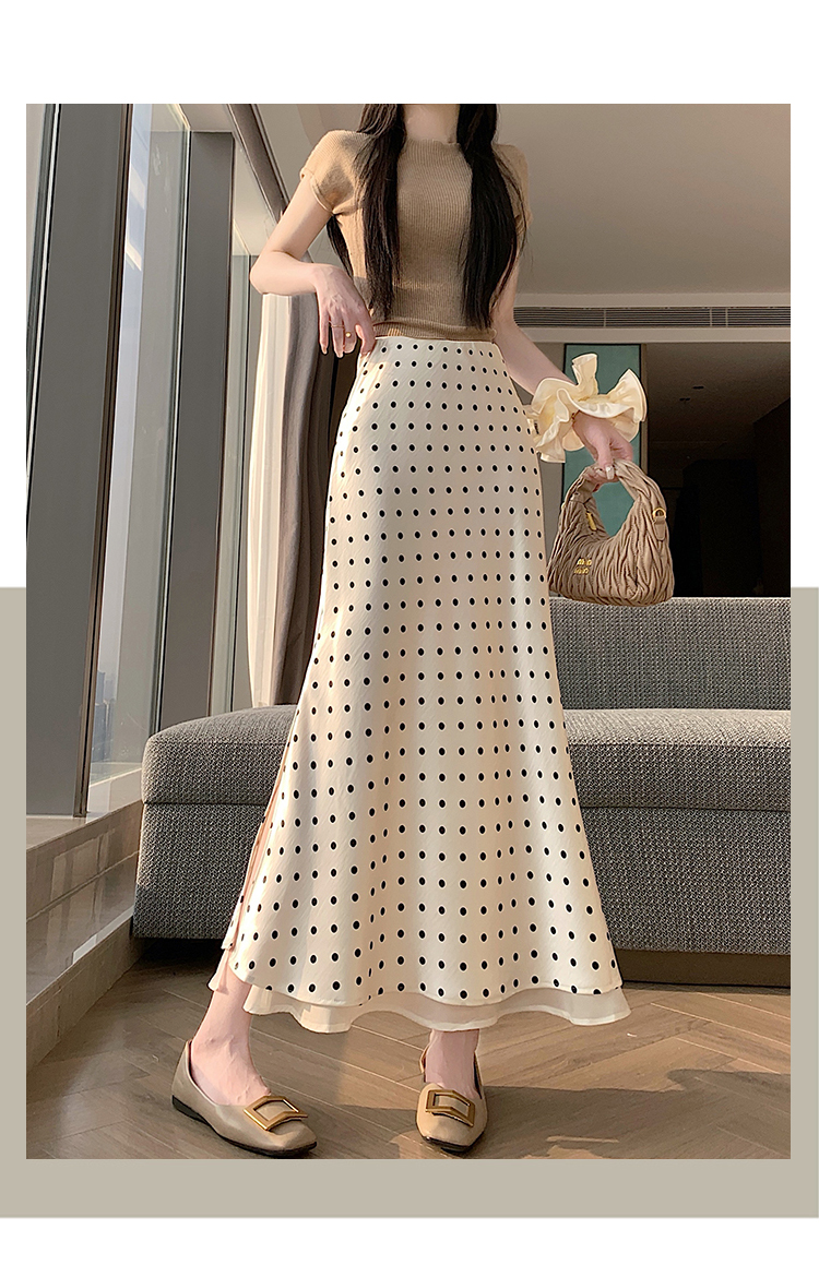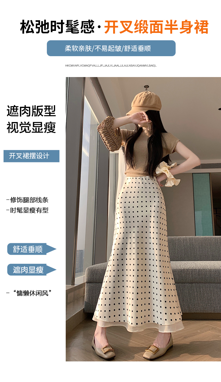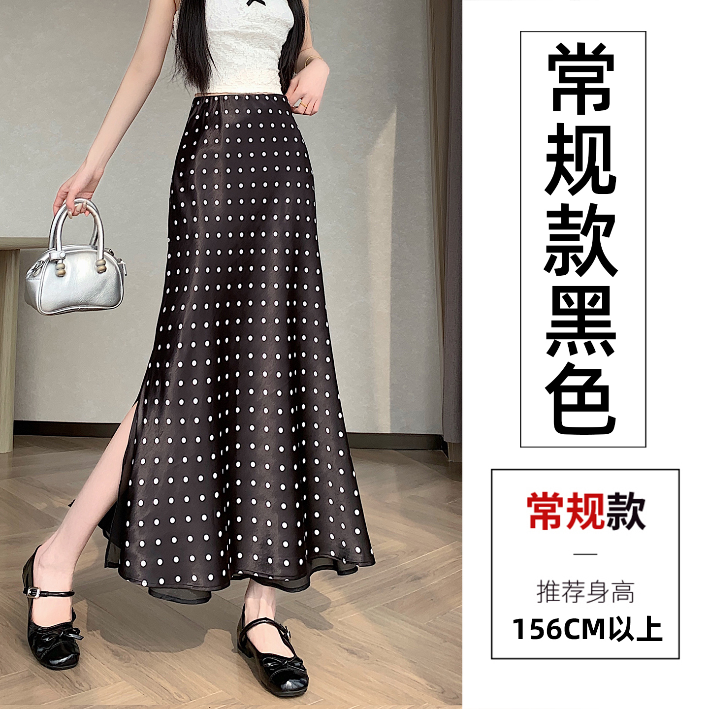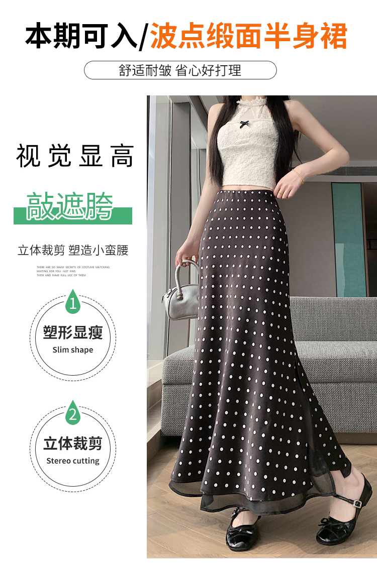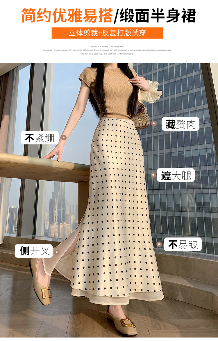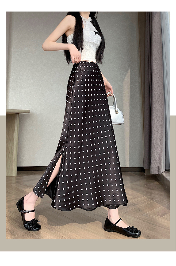 실사 길이 쇼트 스타일 아세트산 새틴 깃발 도트 무늬 반신 스커트 허리밴드 롱 스커트 트임 원사 한 마디 롱 스커트