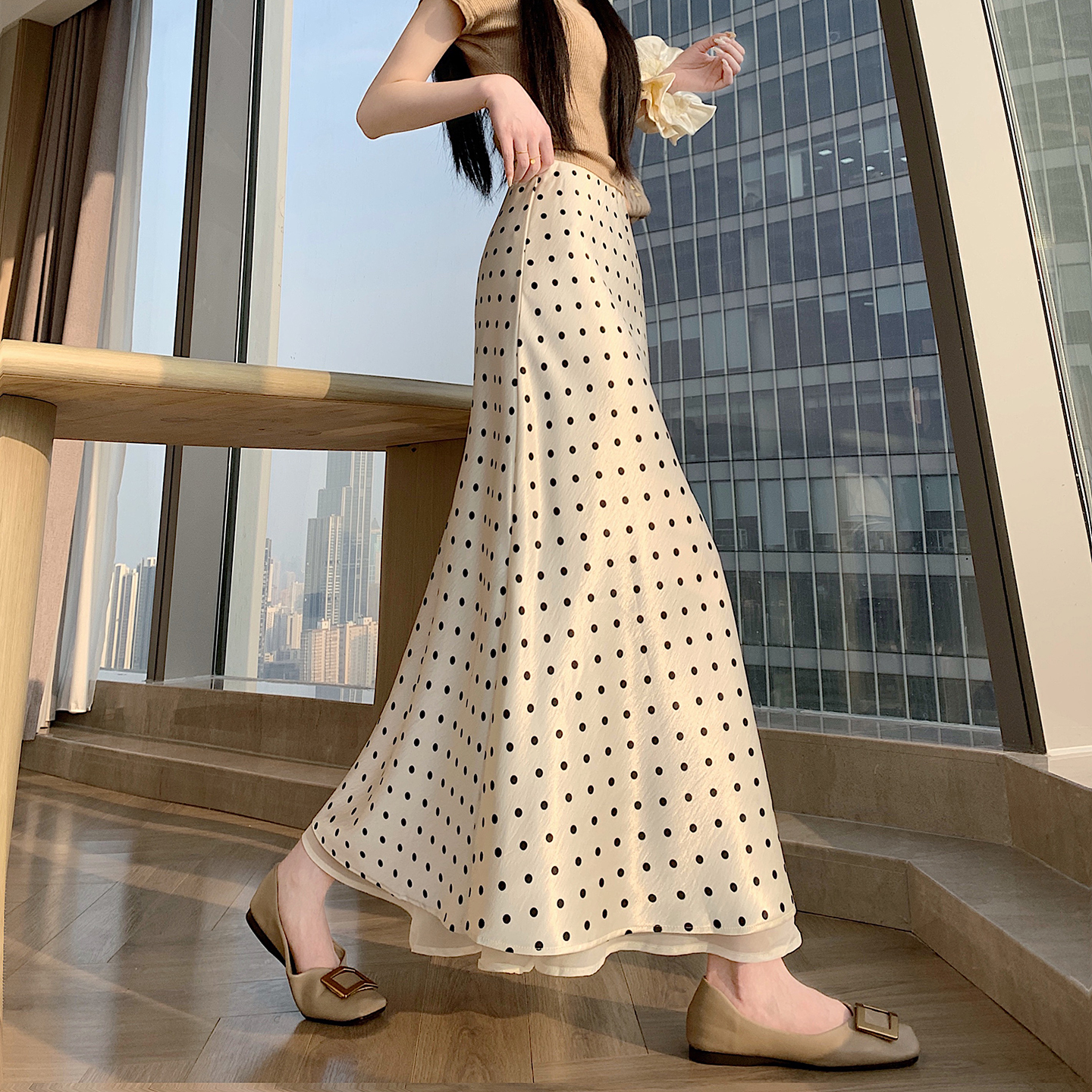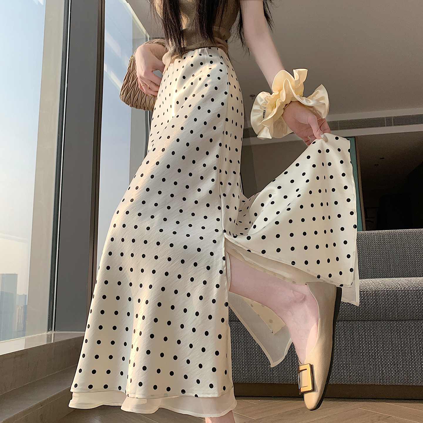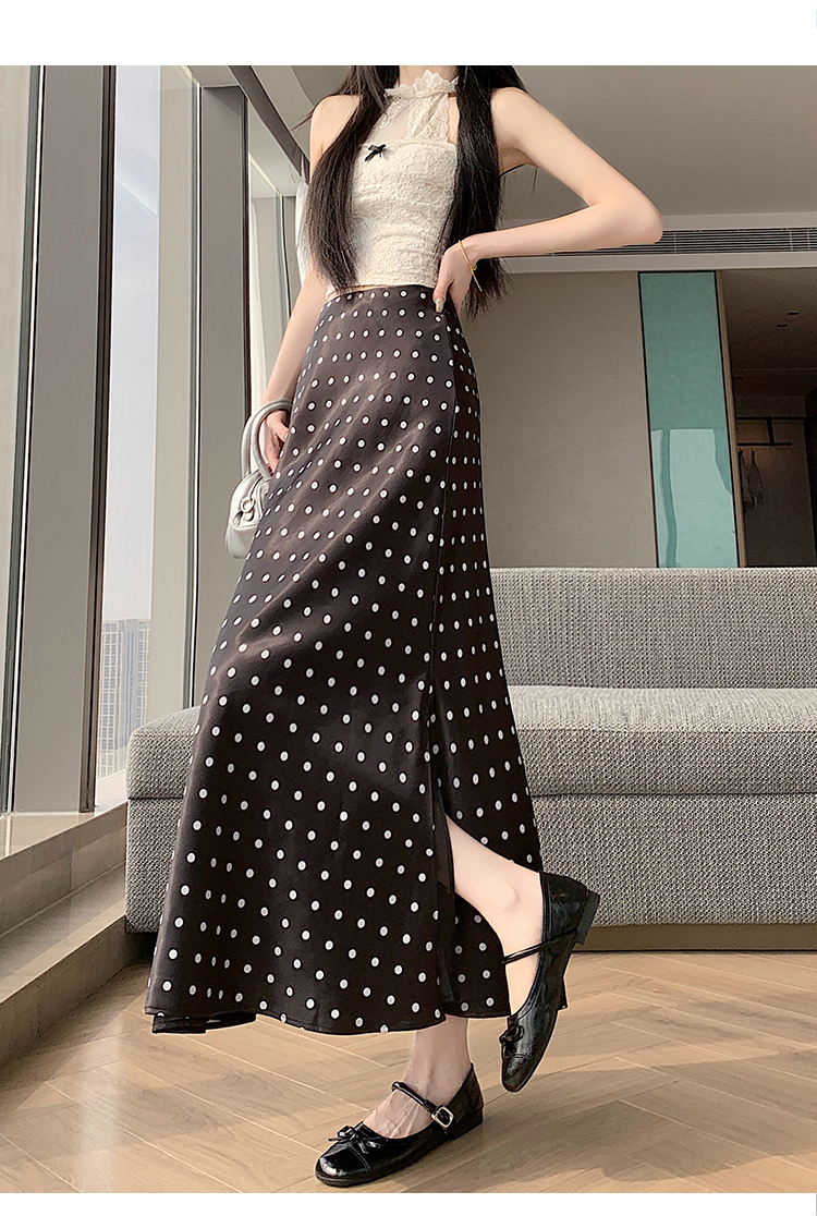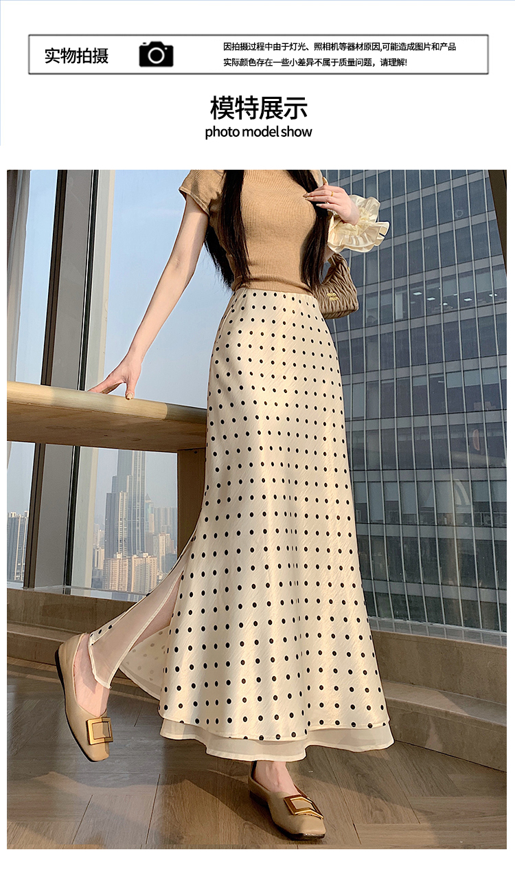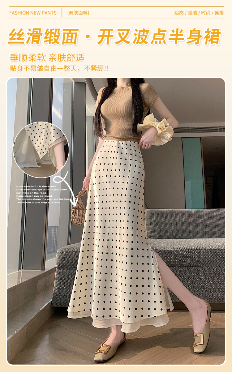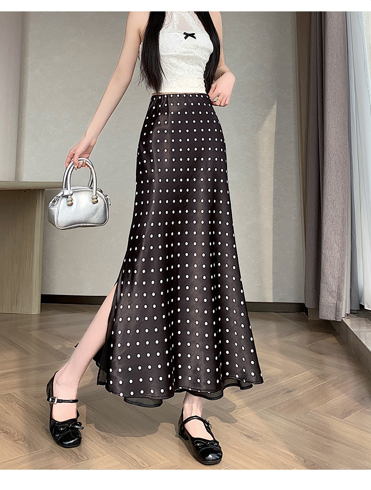 실사 길이 쇼트 스타일 아세트산 새틴 깃발 도트 무늬 반신 스커트 허리밴드 롱 스커트 트임 원사 한 마디 롱 스커트