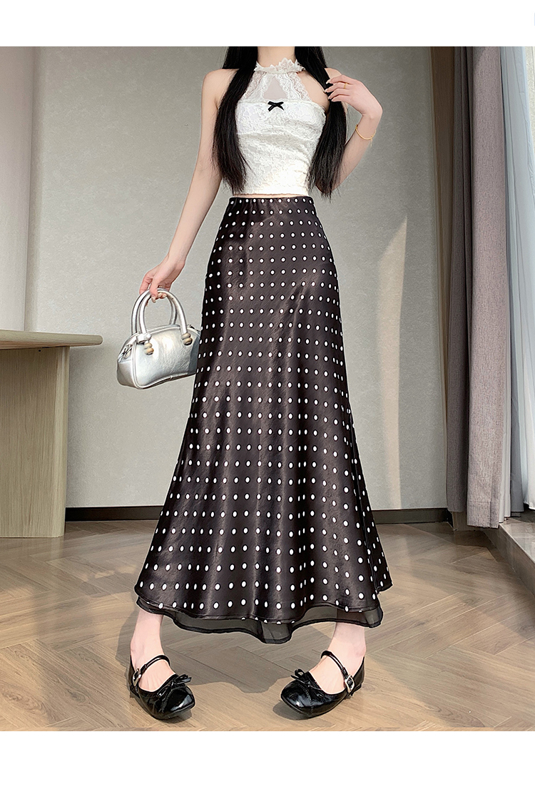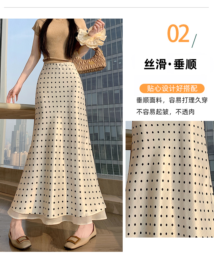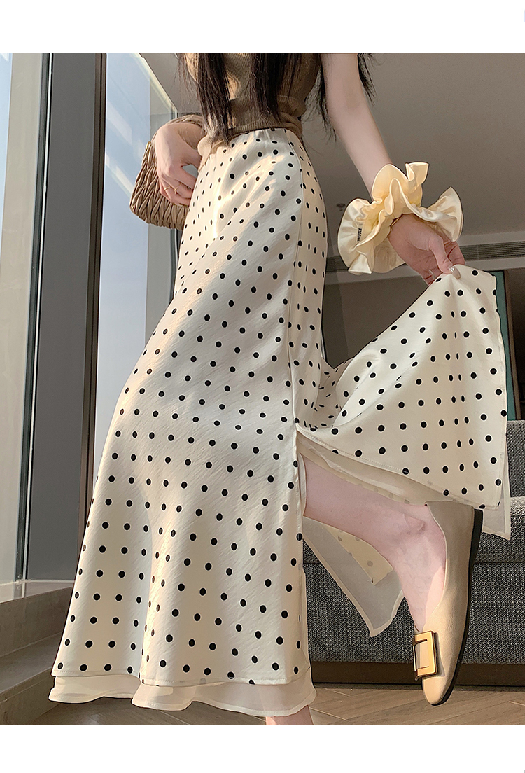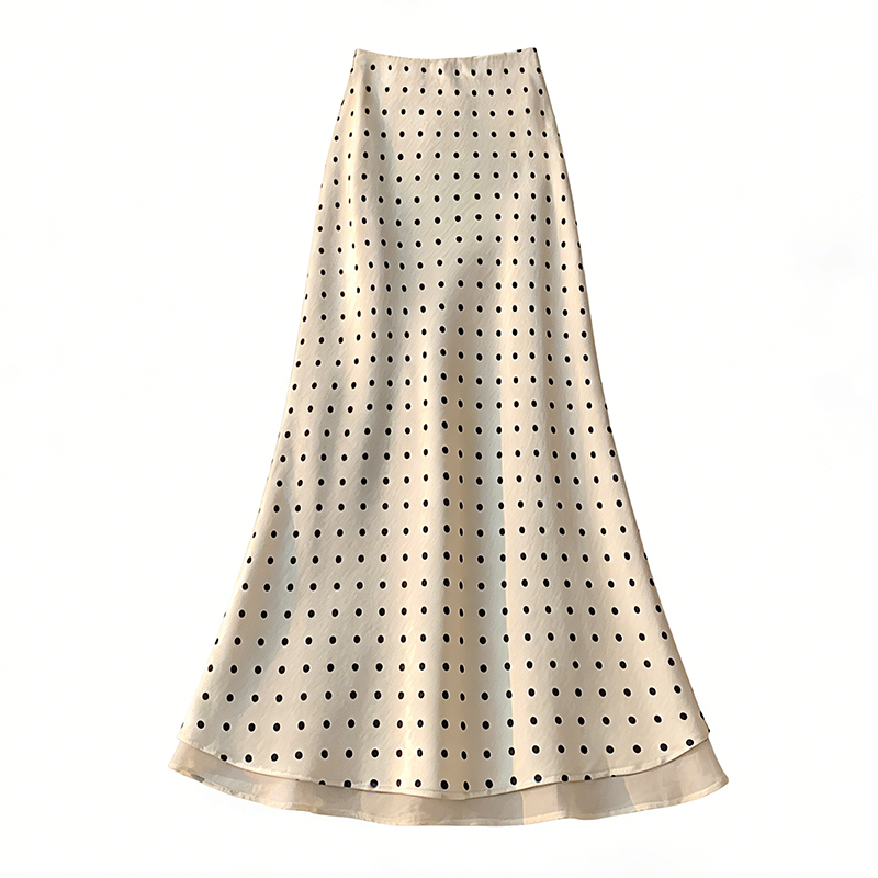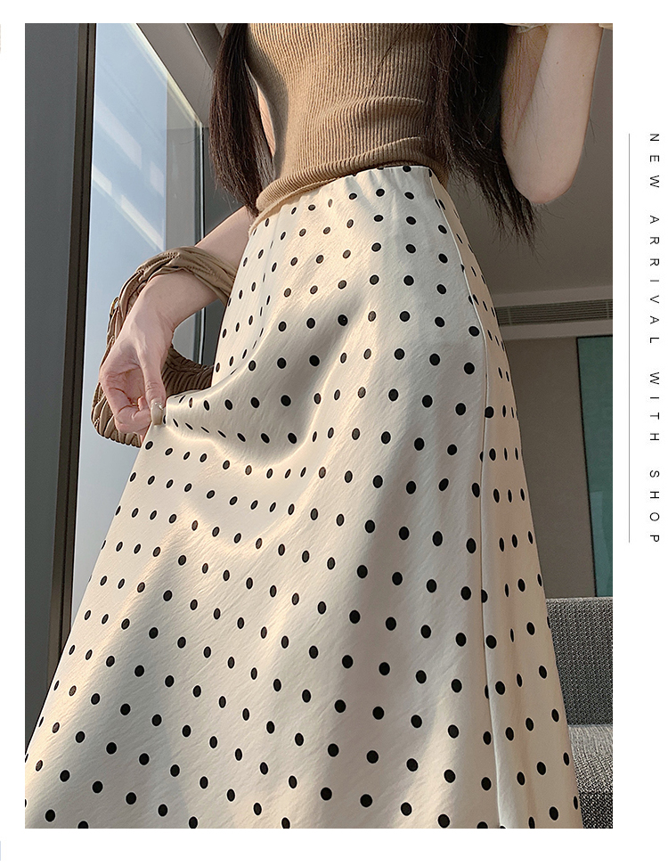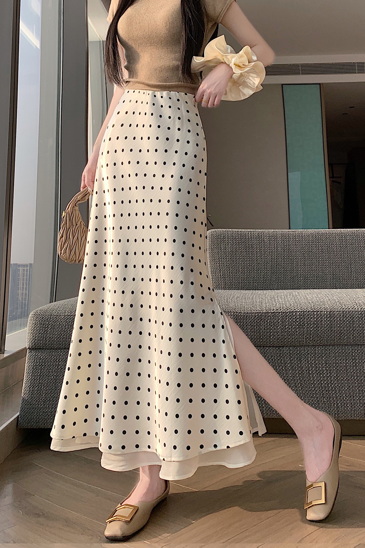 실사 길이 쇼트 스타일 아세트산 새틴 깃발 도트 무늬 반신 스커트 허리밴드 롱 스커트 트임 원사 한 마디 롱 스커트