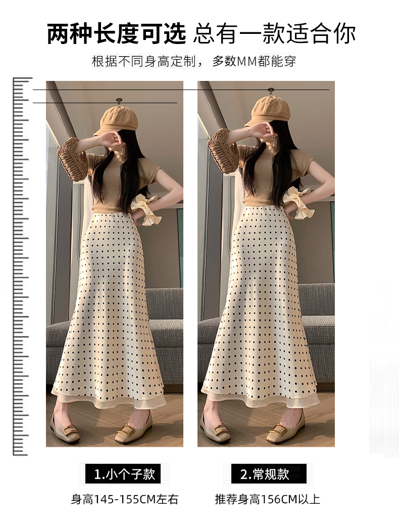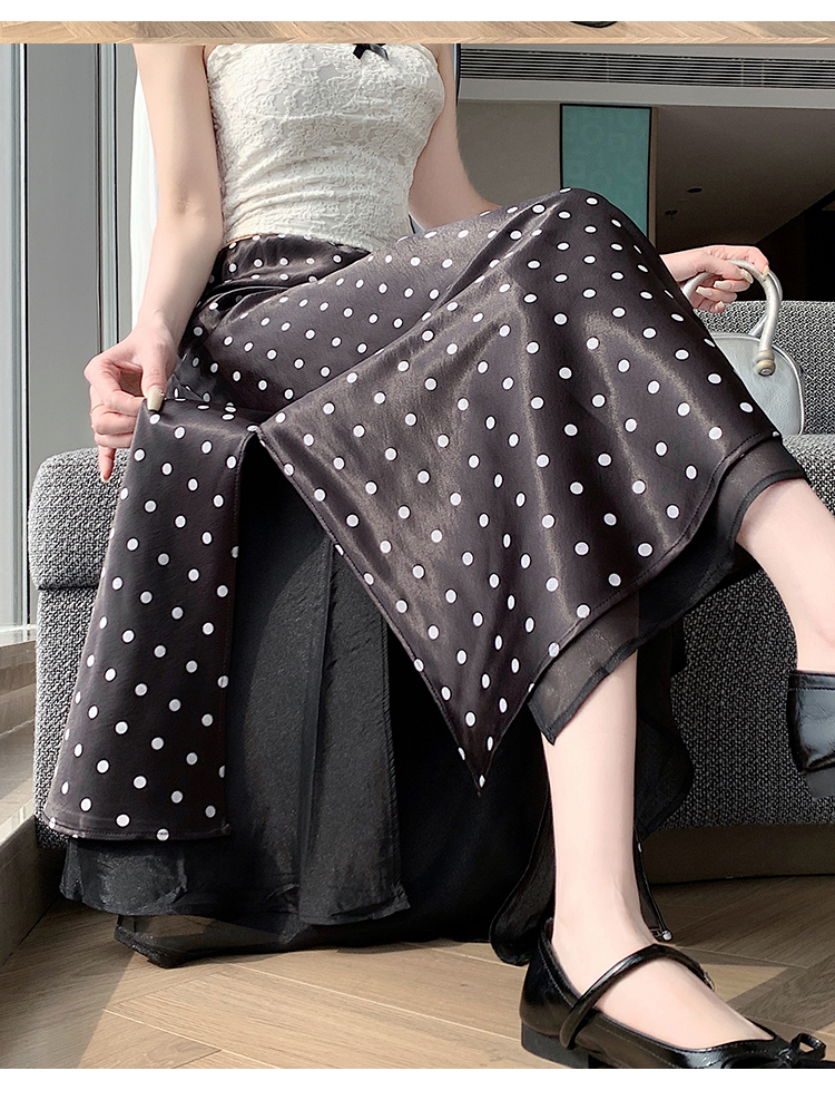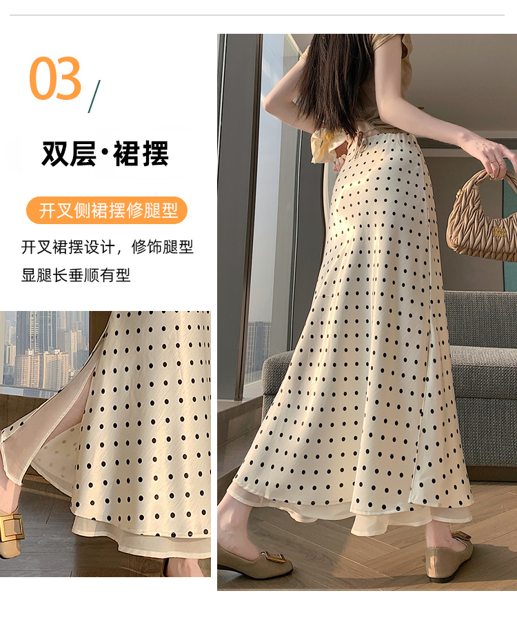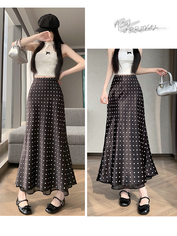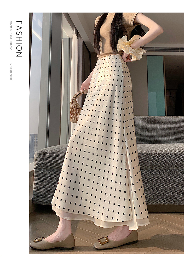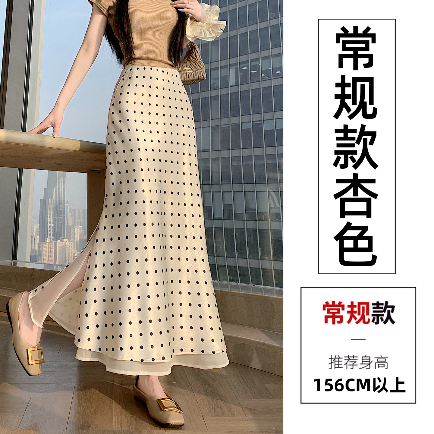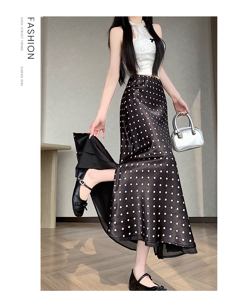 실사 길이 쇼트 스타일 아세트산 새틴 깃발 도트 무늬 반신 스커트 허리밴드 롱 스커트 트임 원사 한 마디 롱 스커트