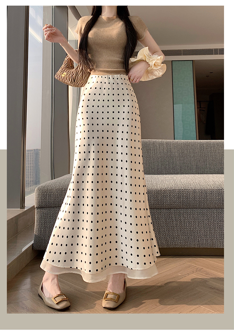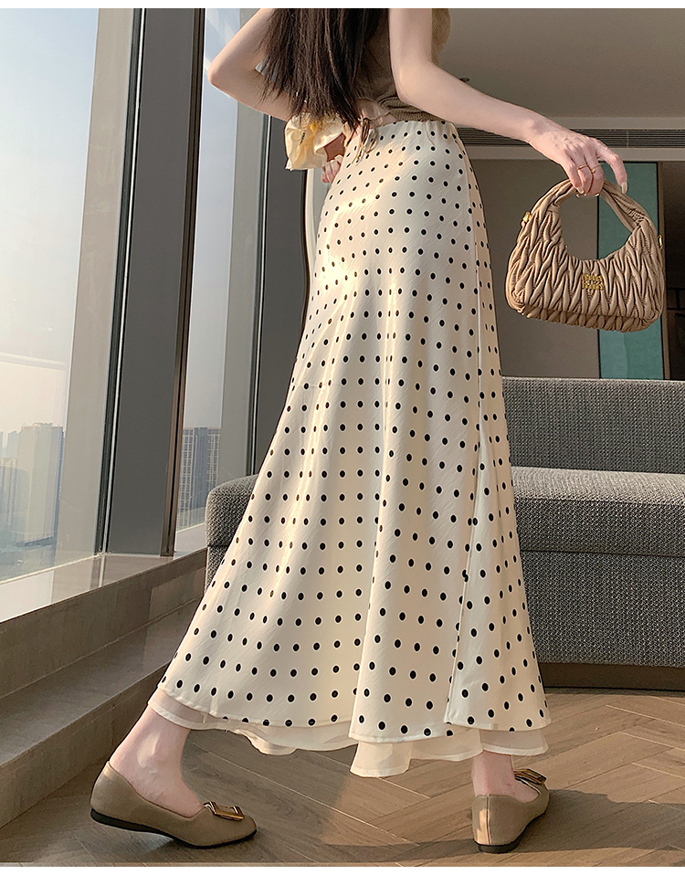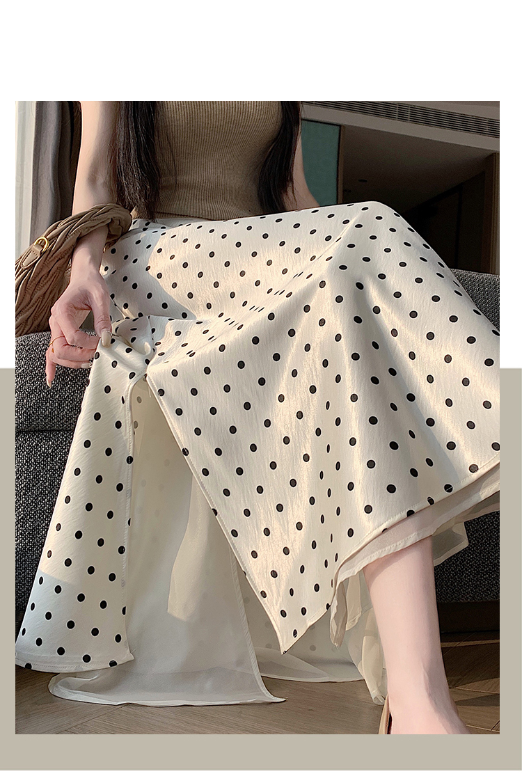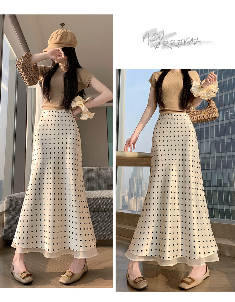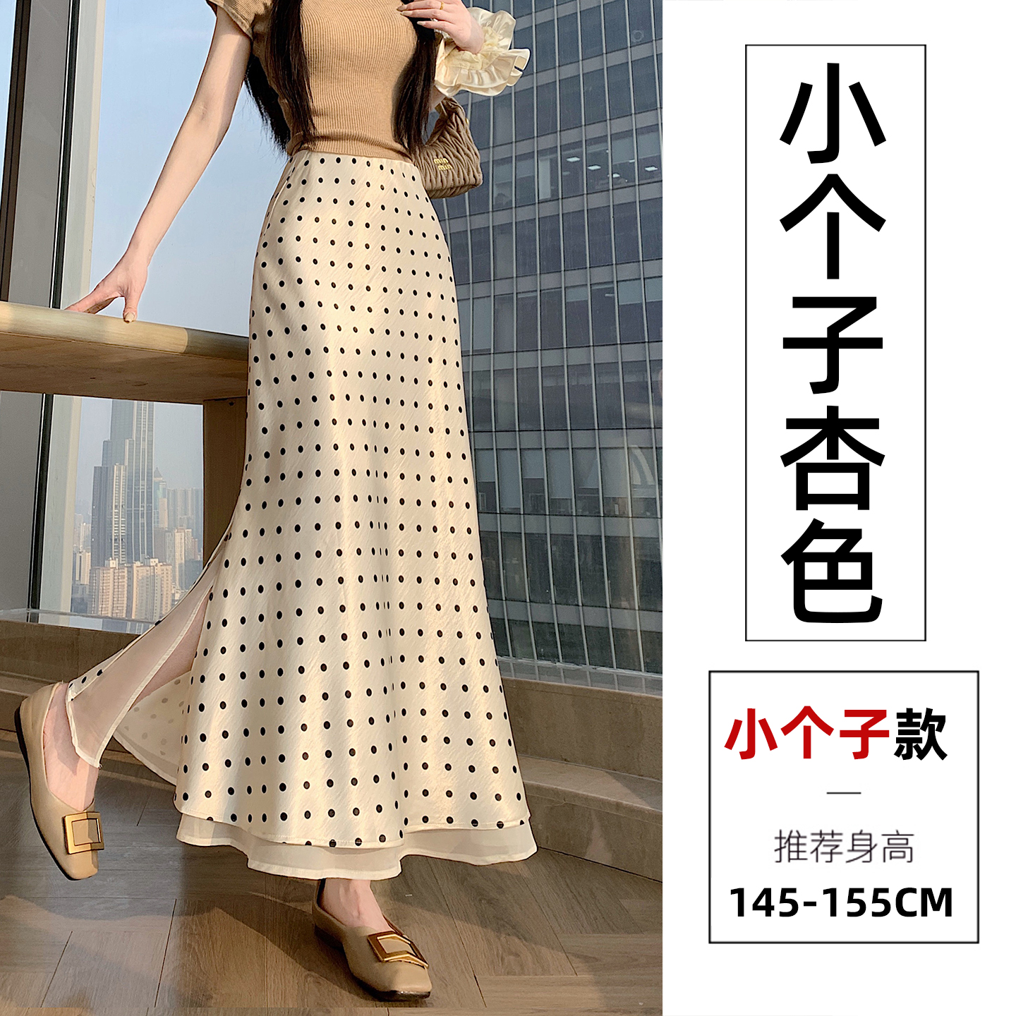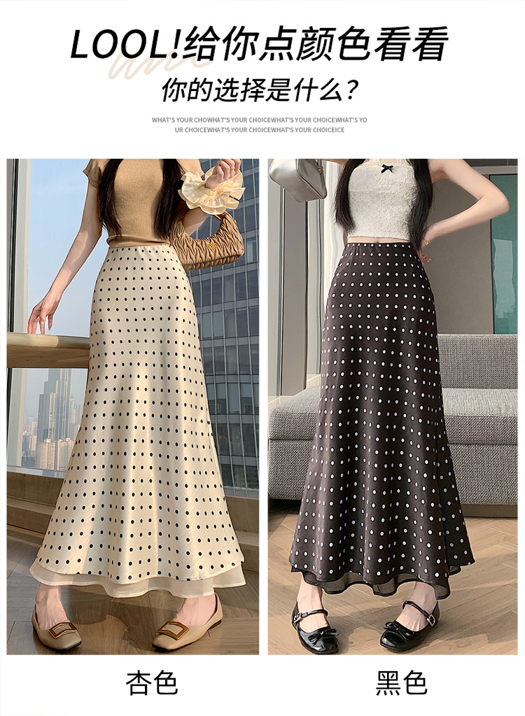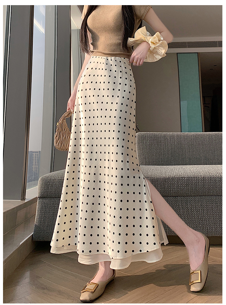 실사 길이 쇼트 스타일 아세트산 새틴 깃발 도트 무늬 반신 스커트 허리밴드 롱 스커트 트임 원사 한 마디 롱 스커트