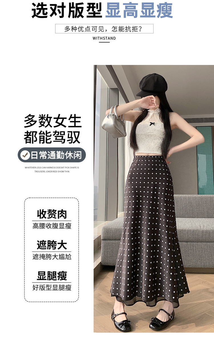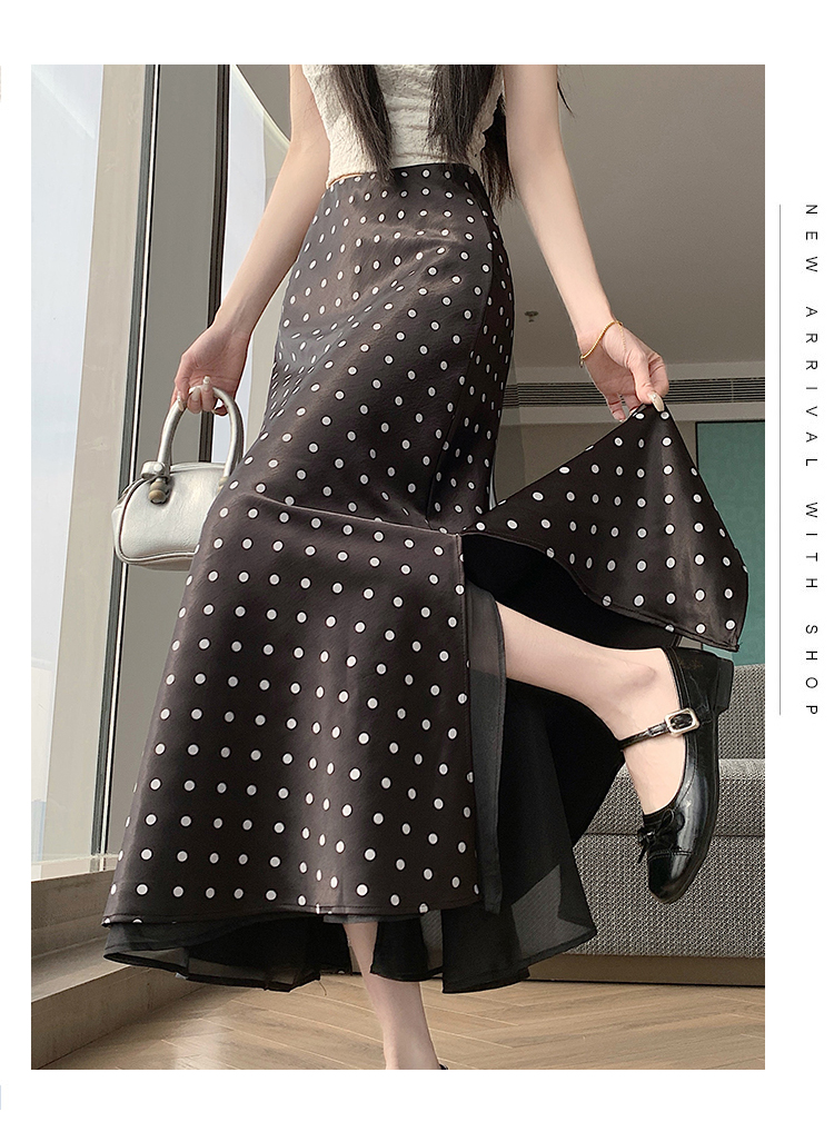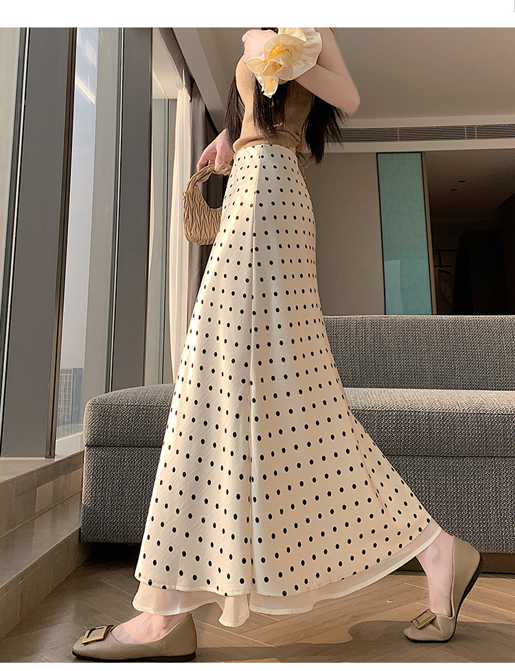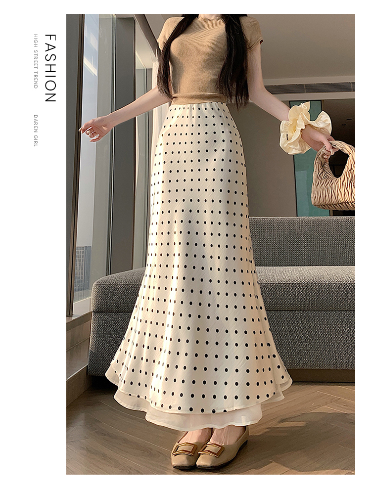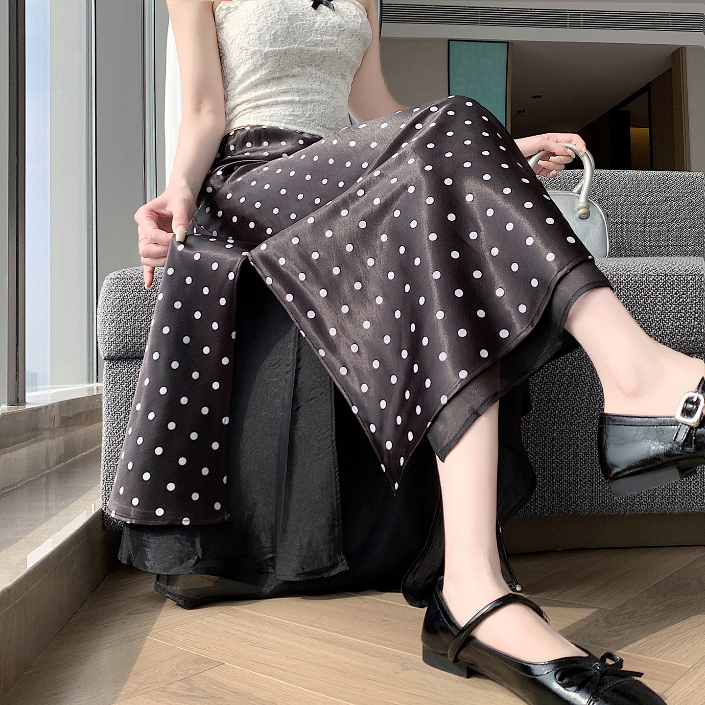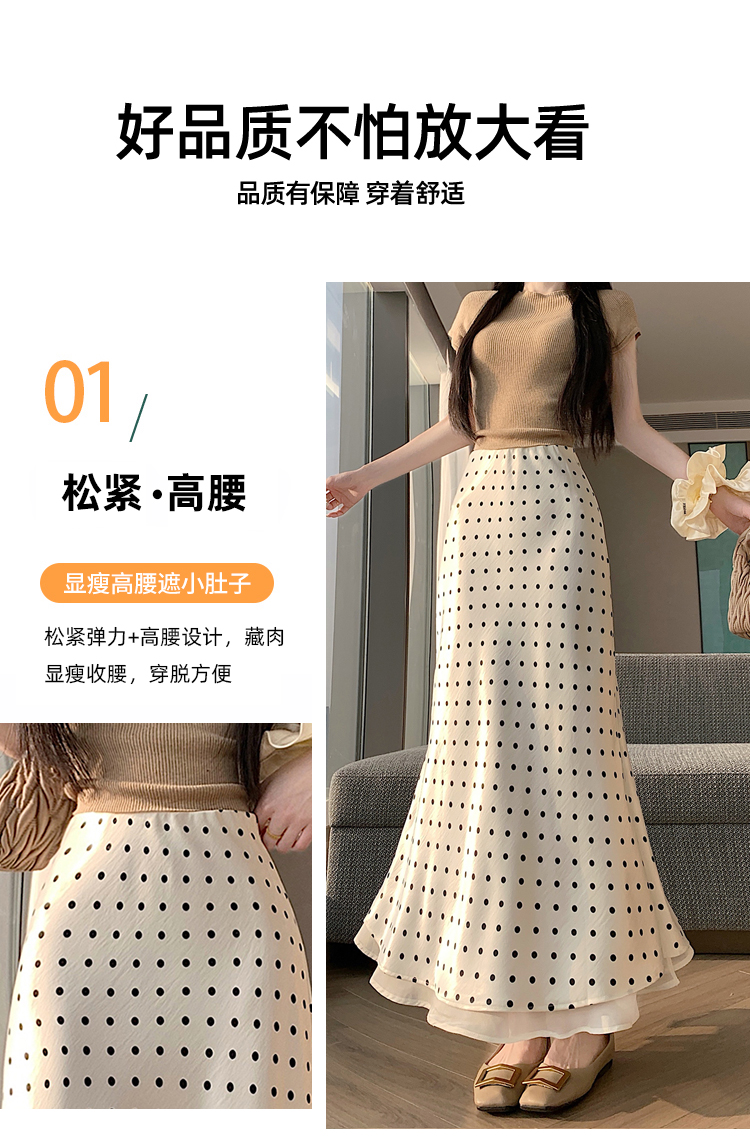 실사 길이 쇼트 스타일 아세트산 새틴 깃발 도트 무늬 반신 스커트 허리밴드 롱 스커트 트임 원사 한 마디 롱 스커트