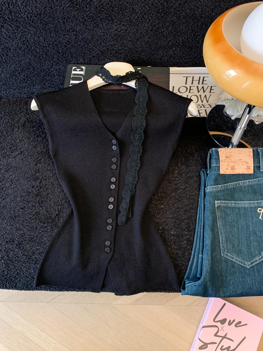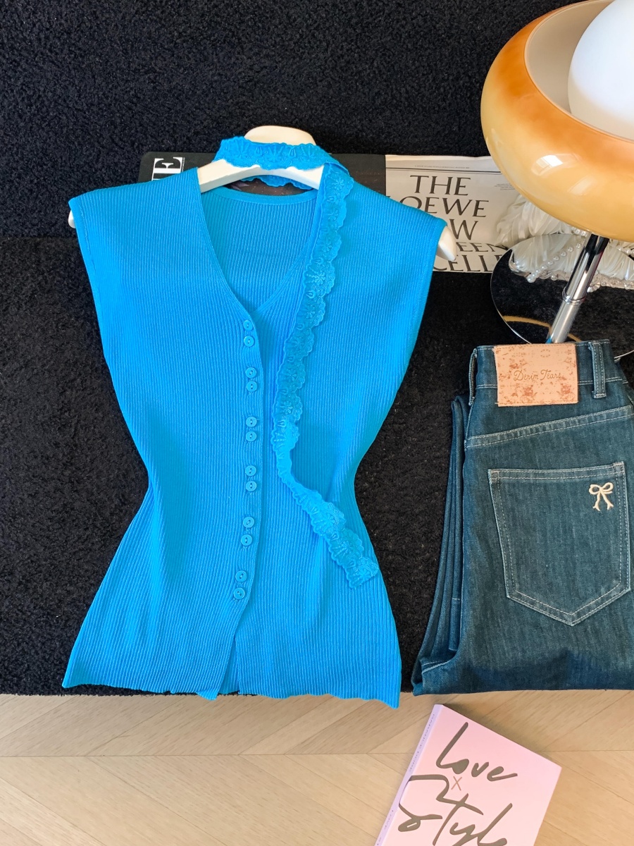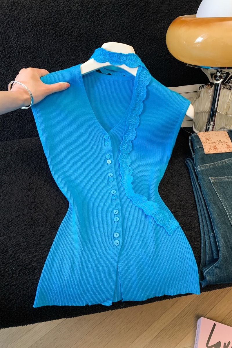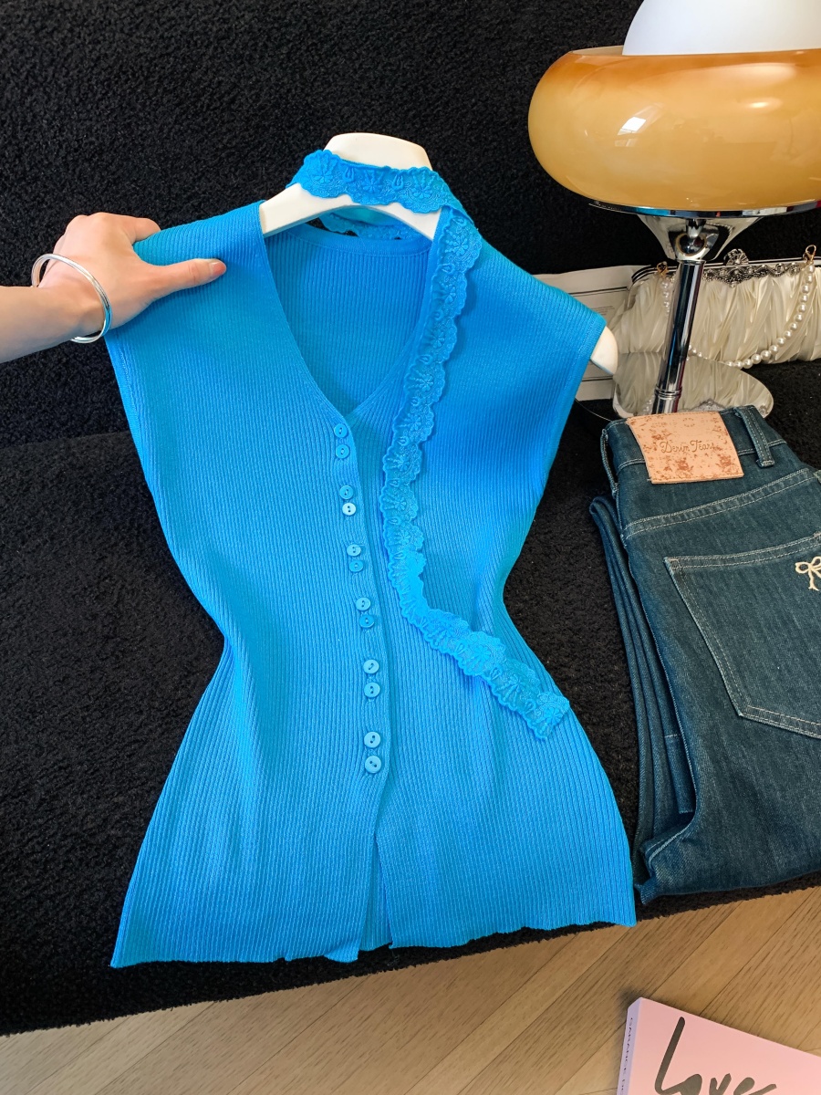 실사 여름 한 부서 순수한 욕망 칼라 니트 캐미솔 몸매 가꾸기 민소매 맨위 분위기 센스 핫걸 조끼