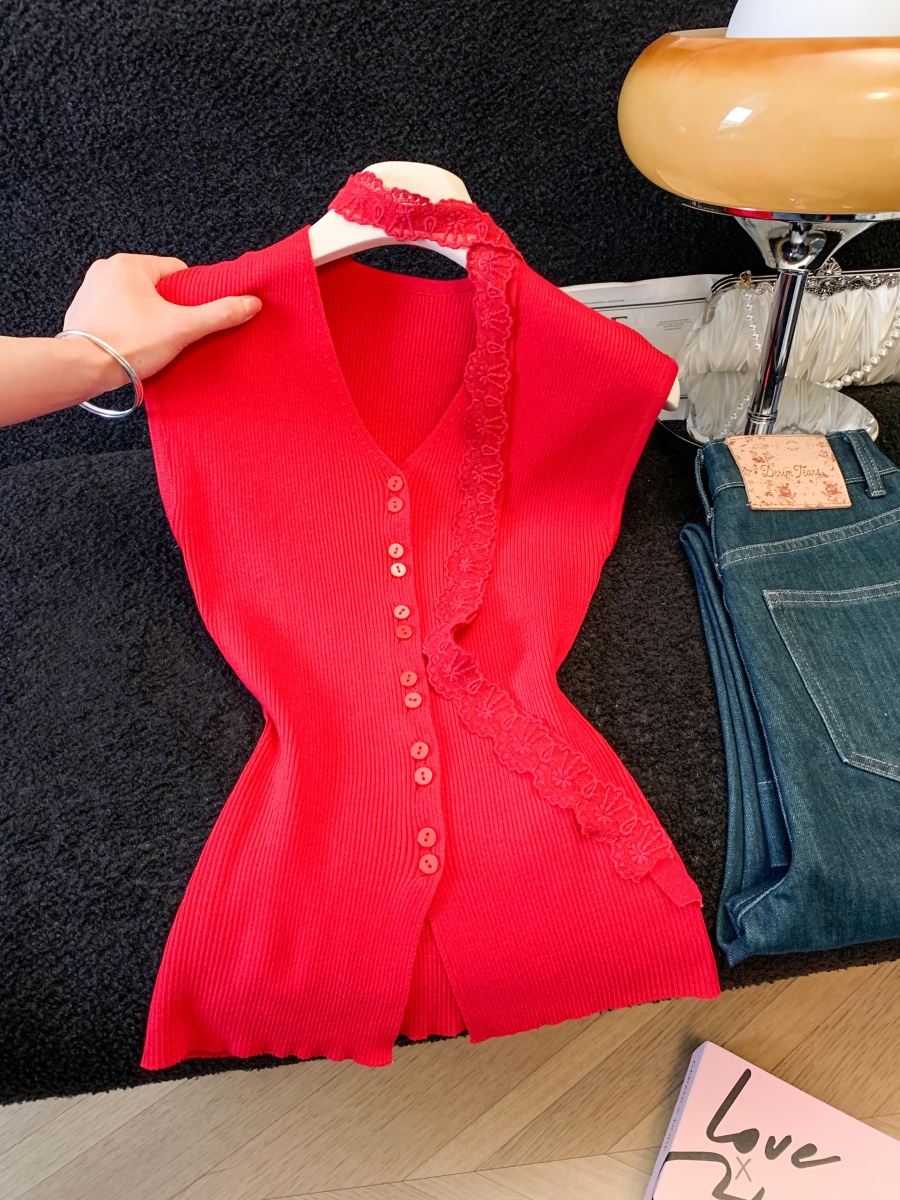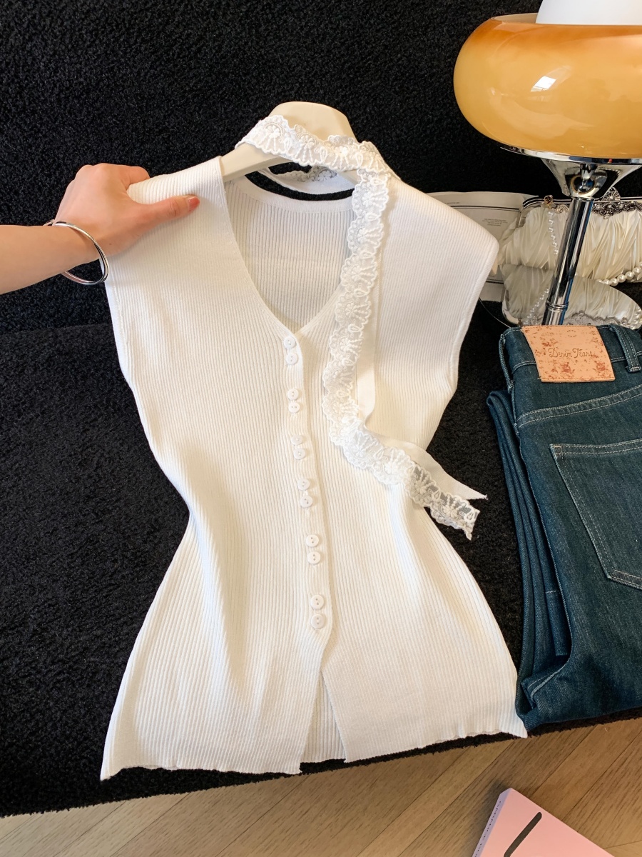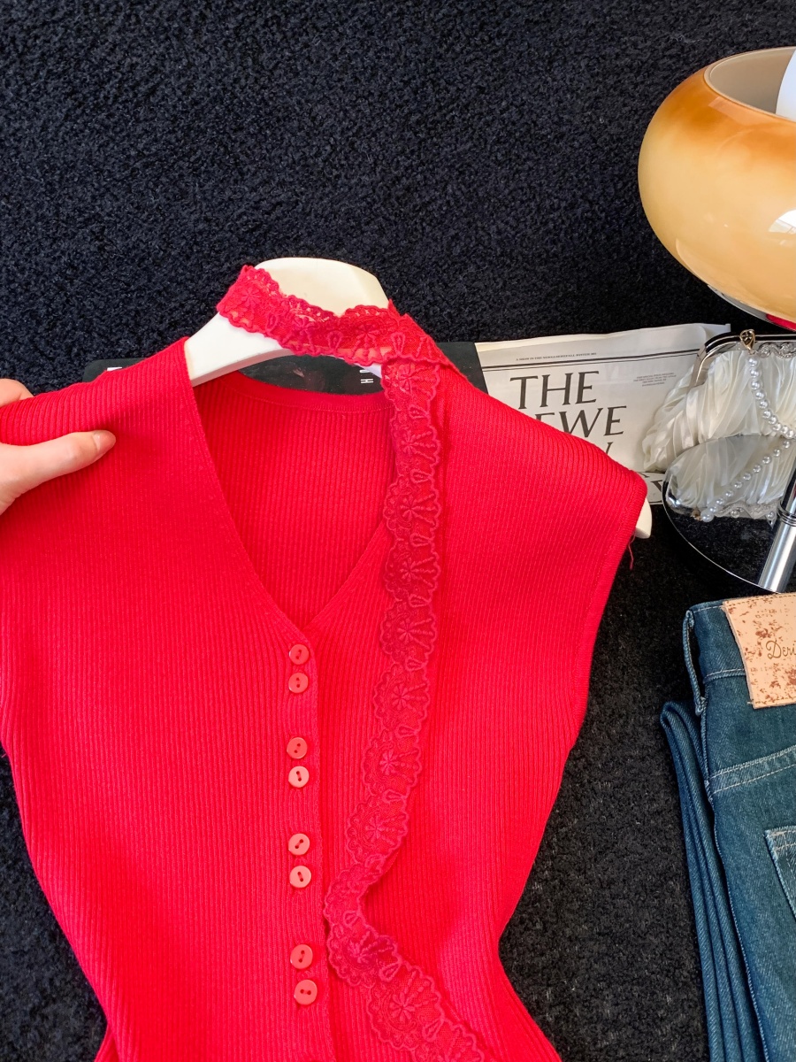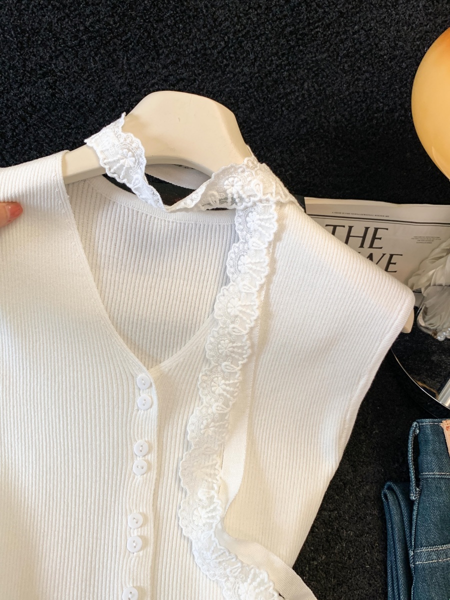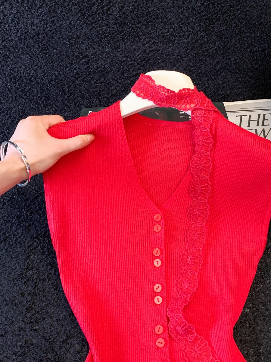 실사 한 부서 chic Chic 여름 휴가 외출용 홀로우 아웃 니트 민소매 맨위 여성 새로운 외출용 레이스
