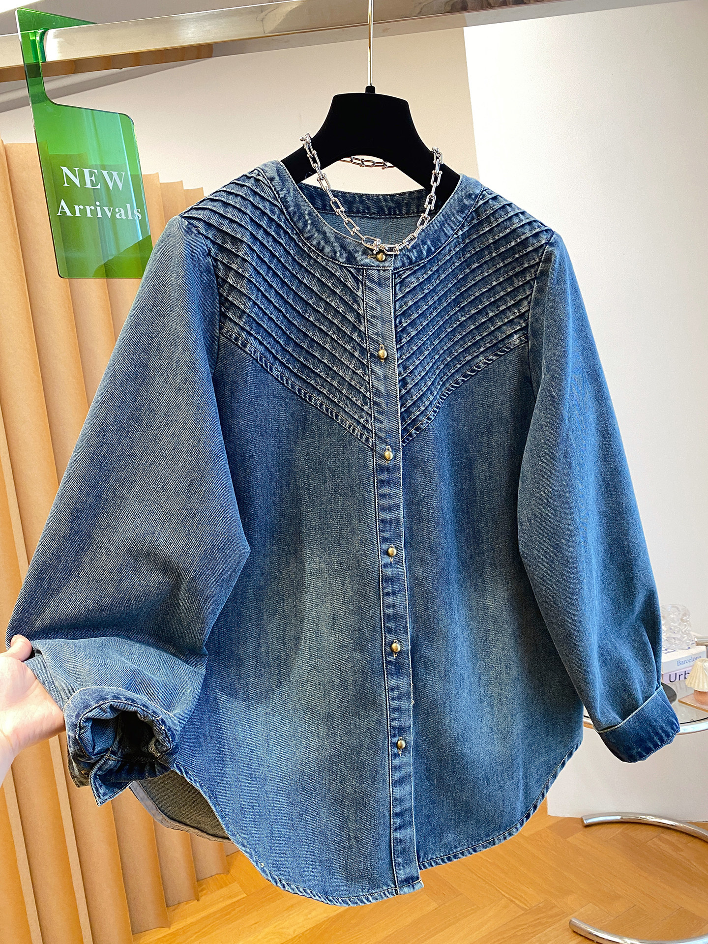 고급 센스 라운드 넥 데님 셔츠 여성 긴 소매 2026 새로운 이른 봄 루즈핏 고유 한 피아노 Pleat 슈퍼 잘 생긴 맨위