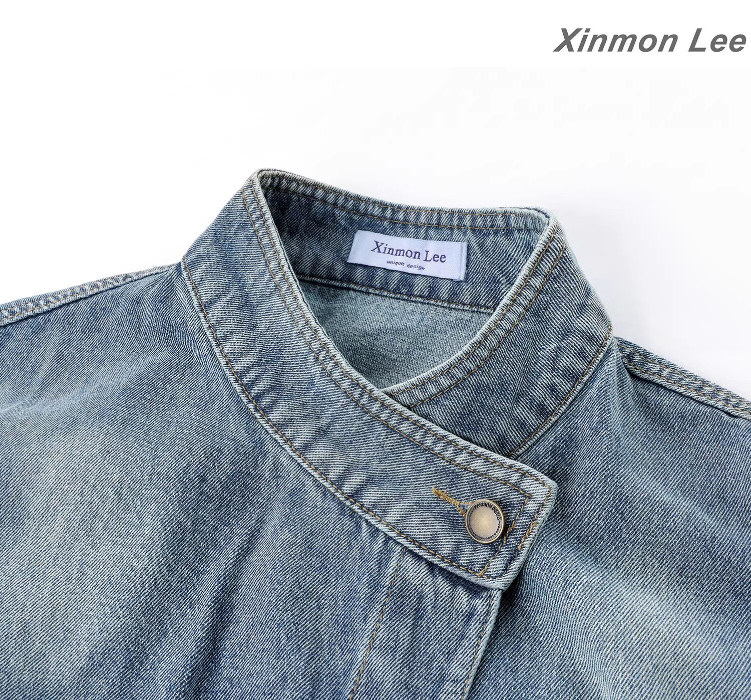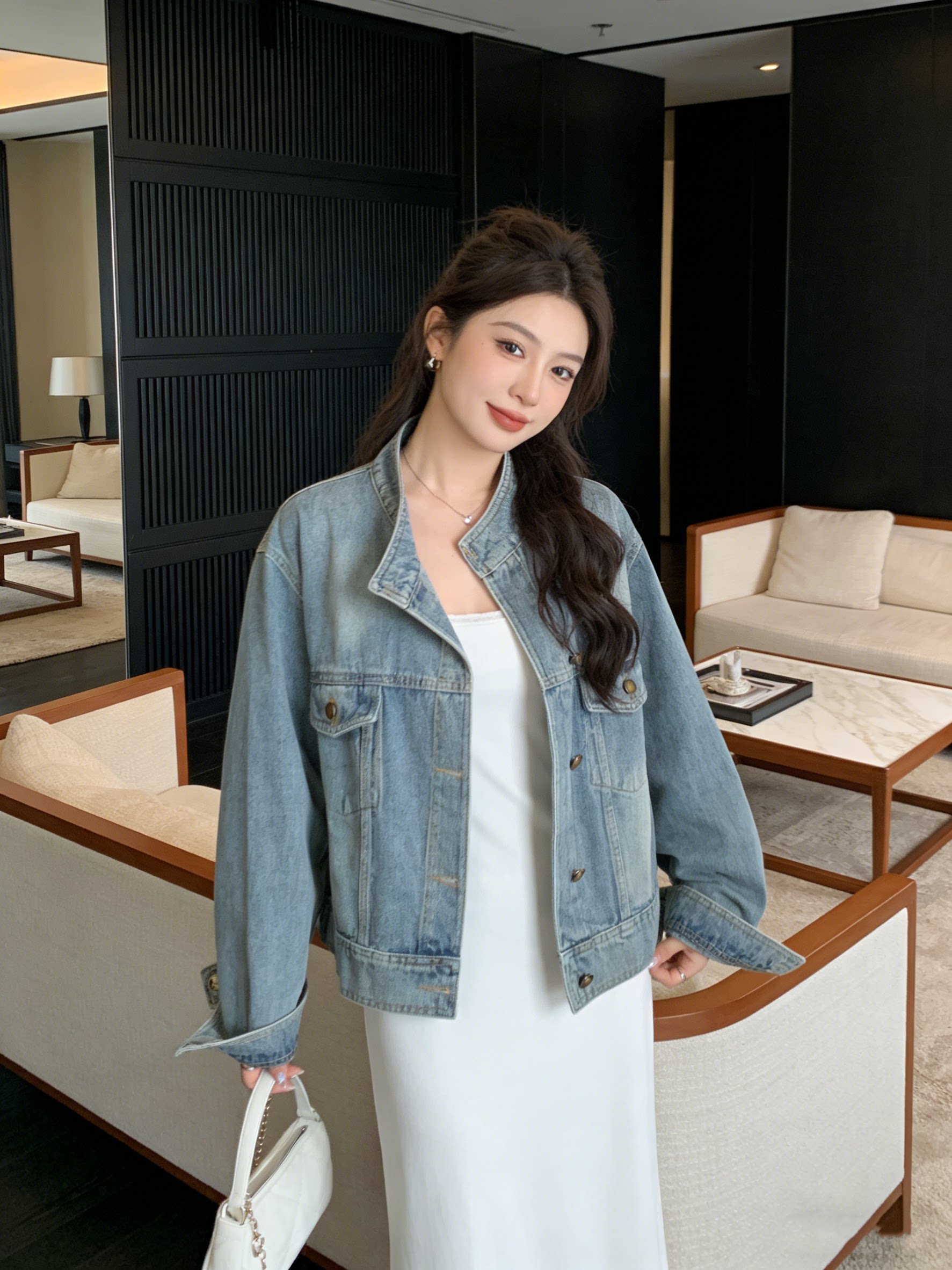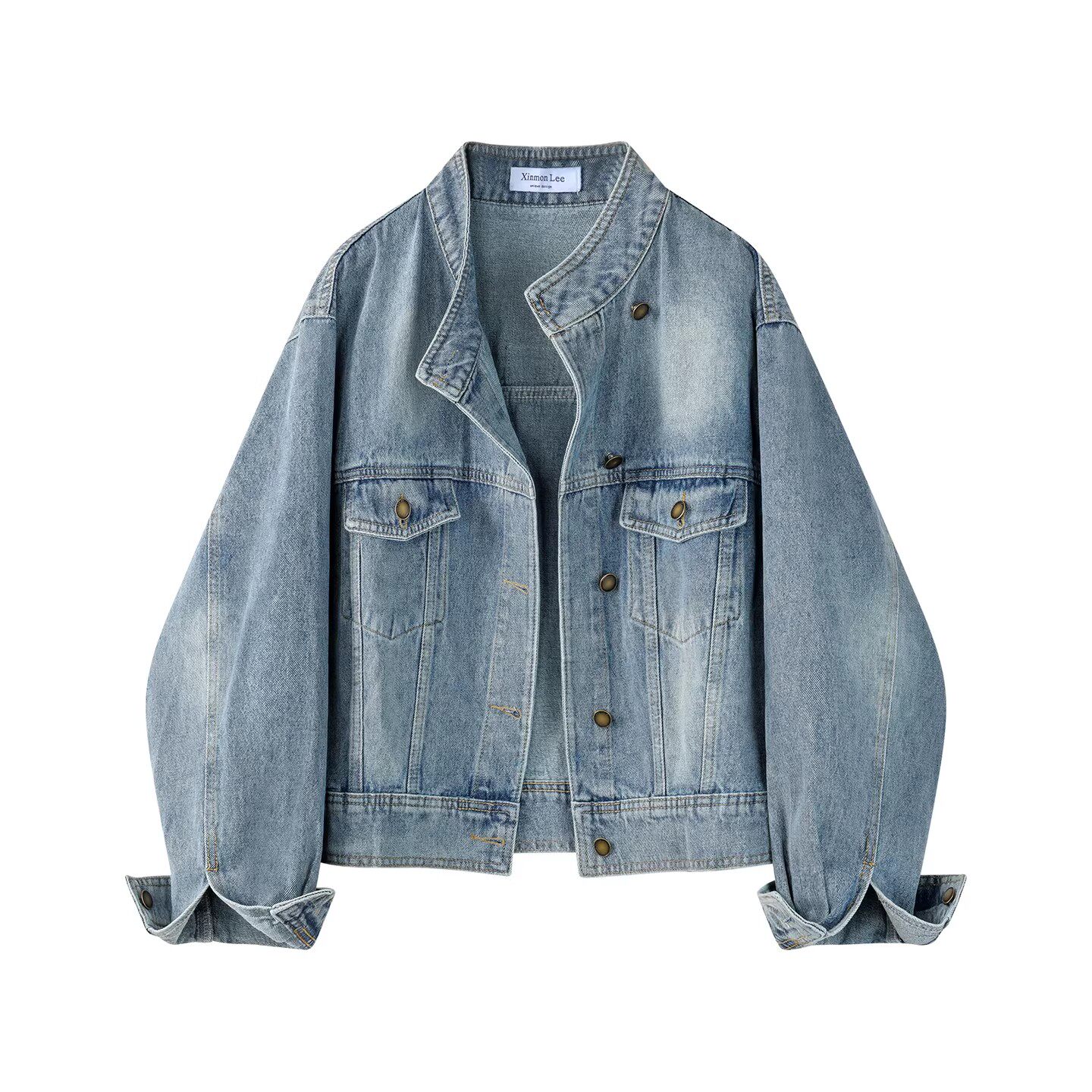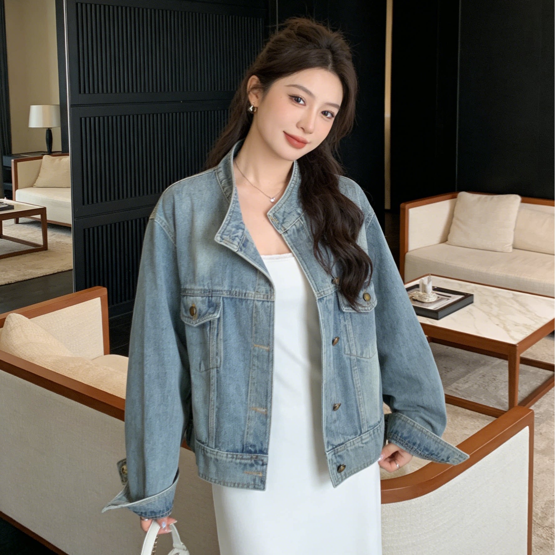 레트로 워싱 마 오래된 스탠드 칼라 데님 재킷 여성 코트 이른 봄 새로운 다용도 캐주얼 슬림해 보이는 오픈 가디건